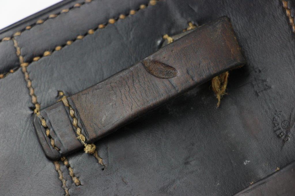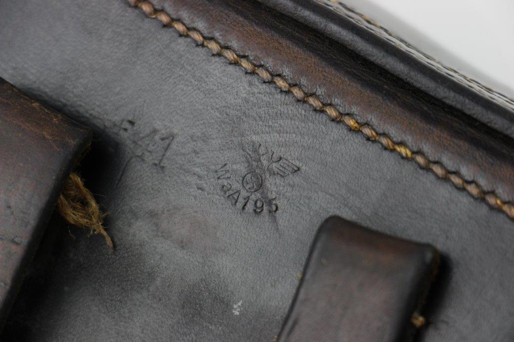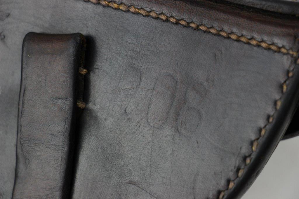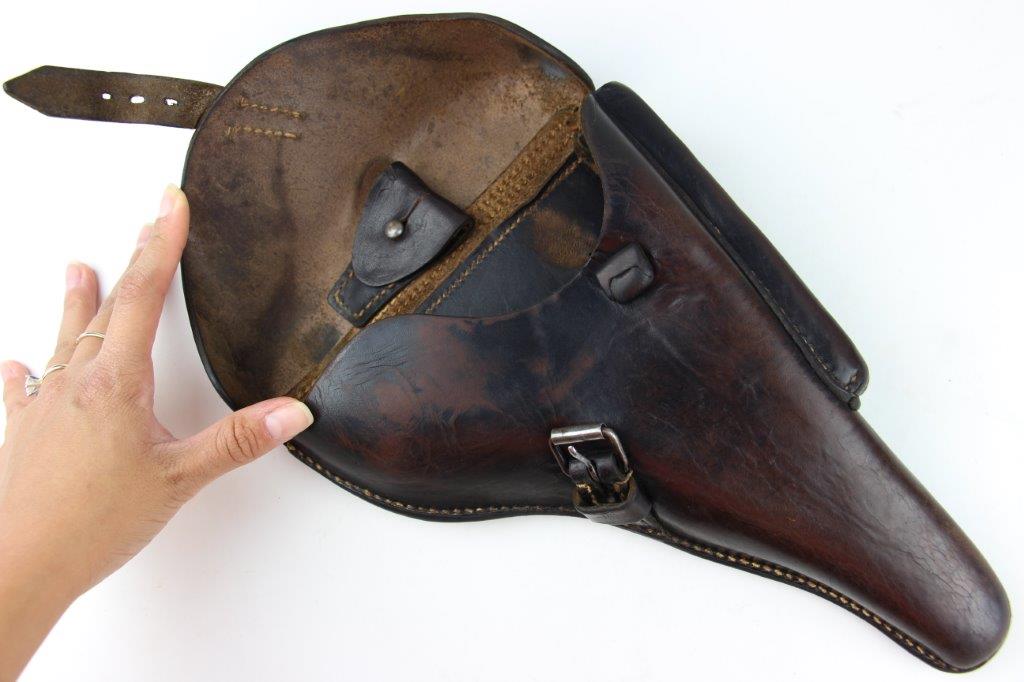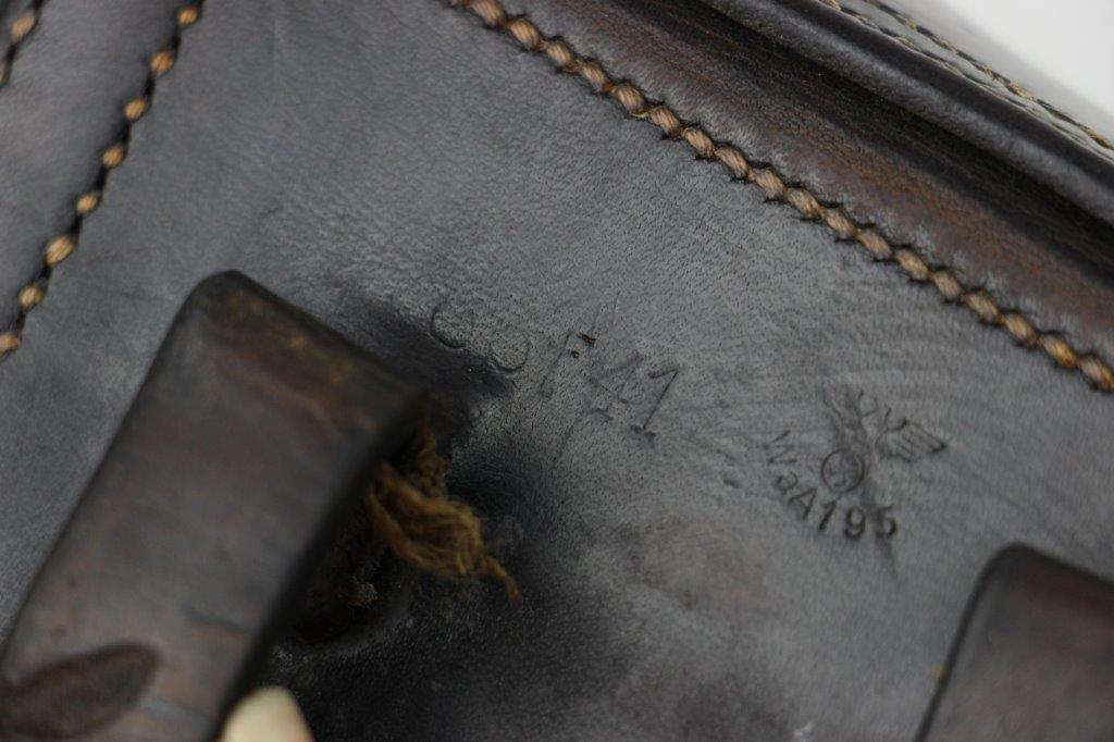 8/14/24 – This is an original 1941 dated Luger holster from WW2. The holster is in great condition but has one small line of stitching missing from the upper left belt loop on the back leather. The belt loop is still attached and held in place by the 2nd line of stitching found just below this missing line of stitching; so the belt loops are still both attached by original stitching. See photos (price reduced accordingly). Despite this one small issue; the holster rates as great condition with all original leather and stitching. The leather has normal pliability and use wear throughout; some wrinkling on the front leather and minimal surface scuffing. The back leather is maker stamped “epf”, date stamped “41”, waffen military proof stamped “WaA195”, and “P.08” designation stamped. All original stitching is tight except for the few missing stitches on the belt loop. Clean interior leather with normal use wear.