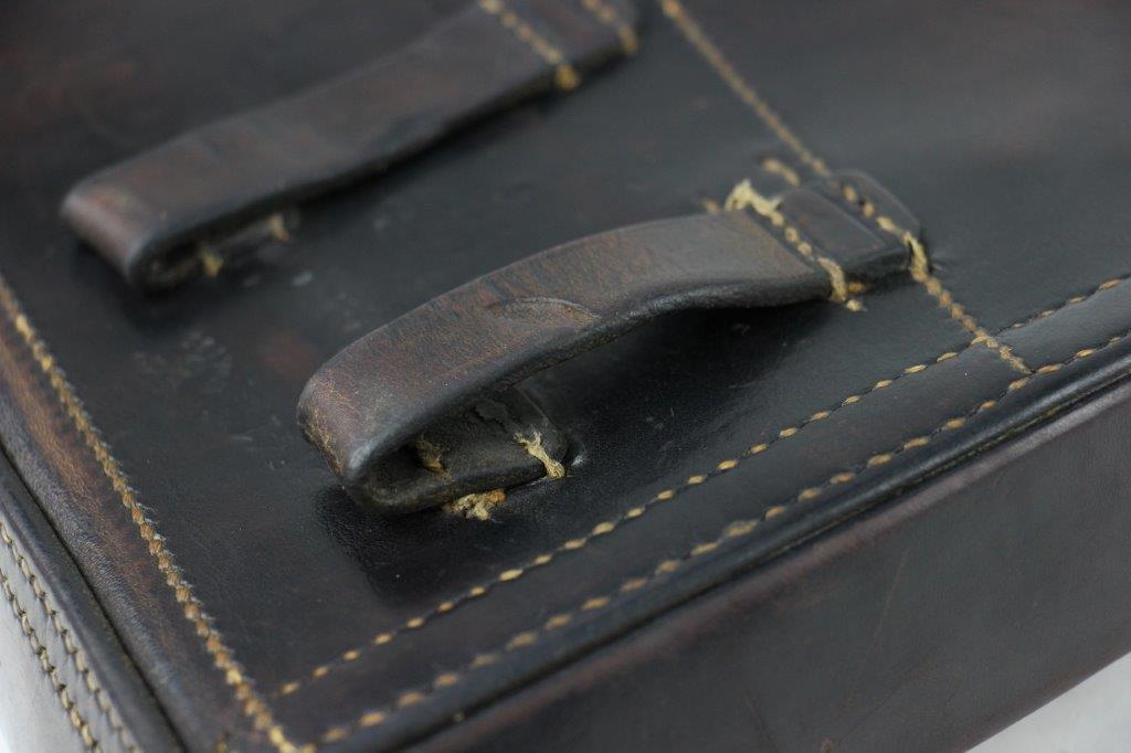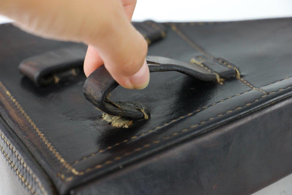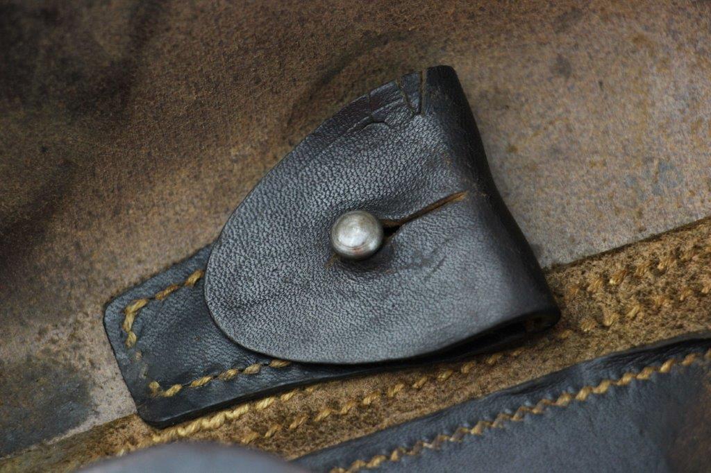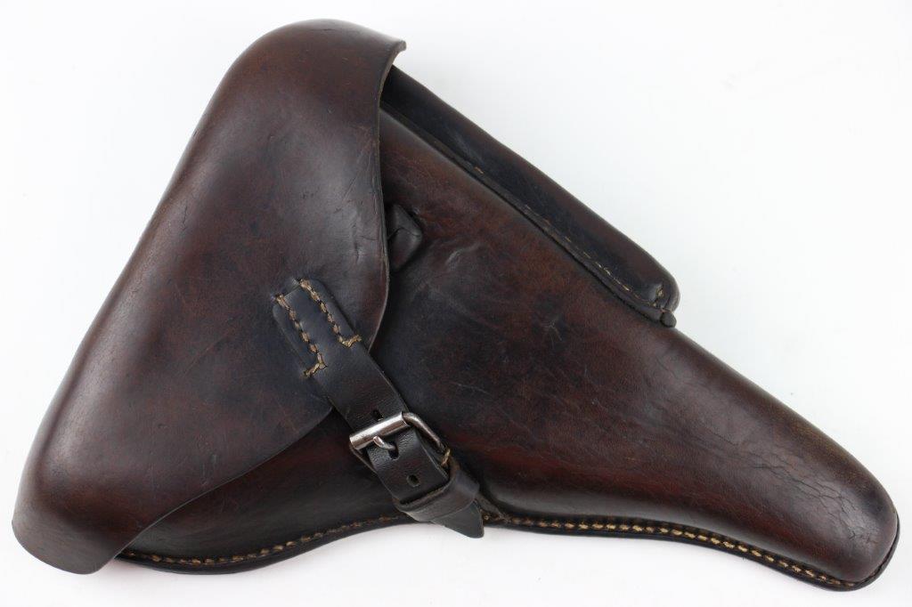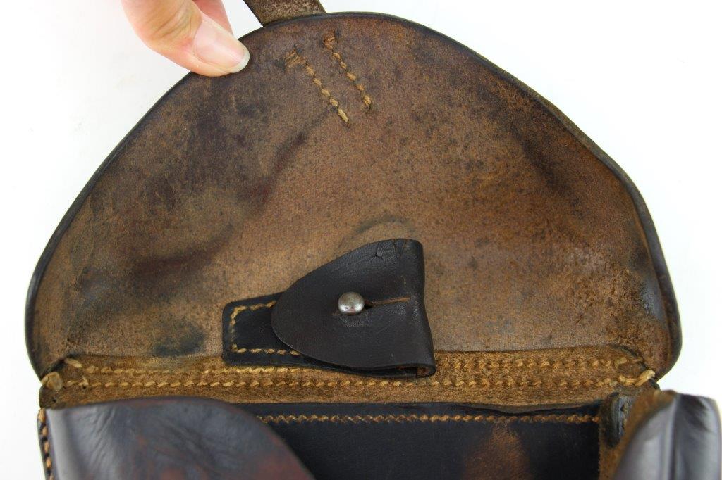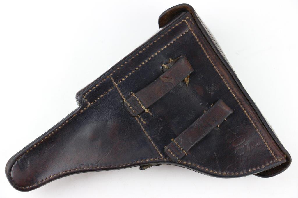 8/14/24 – This is an original 1941 dated Luger holster from WW2. The holster is in great condition but has one small line of stitching missing from the upper left belt loop on the back leather. The belt loop is still attached and held in place by the 2nd line of stitching found just below this missing line of stitching; so the belt loops are still both attached by original stitching. See photos (price reduced accordingly). Despite this one small issue; the holster rates as great condition with all original leather and stitching. The leather has normal pliability and use wear throughout; some wrinkling on the front leather and minimal surface scuffing. The back leather is maker stamped “epf”, date stamped “41”, waffen military proof stamped “WaA195”, and “P.08” designation stamped. All original stitching is tight except for the few missing stitches on the belt loop. Clean interior leather with normal use wear.