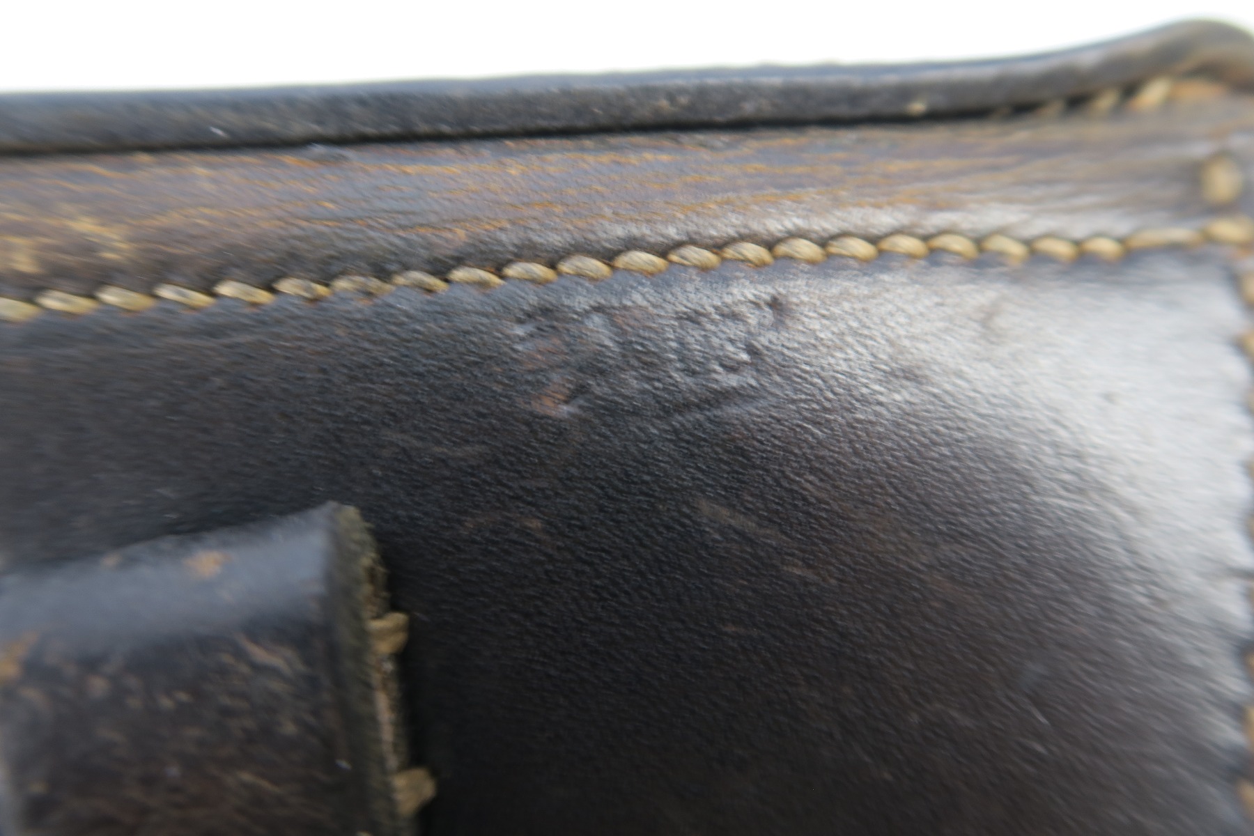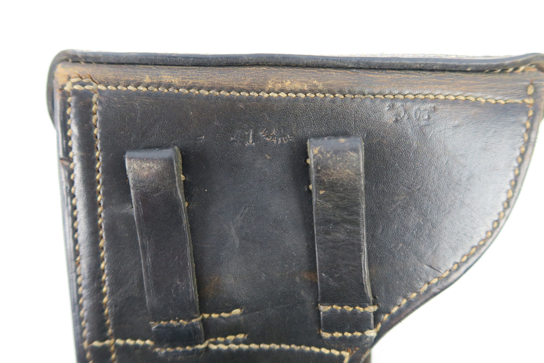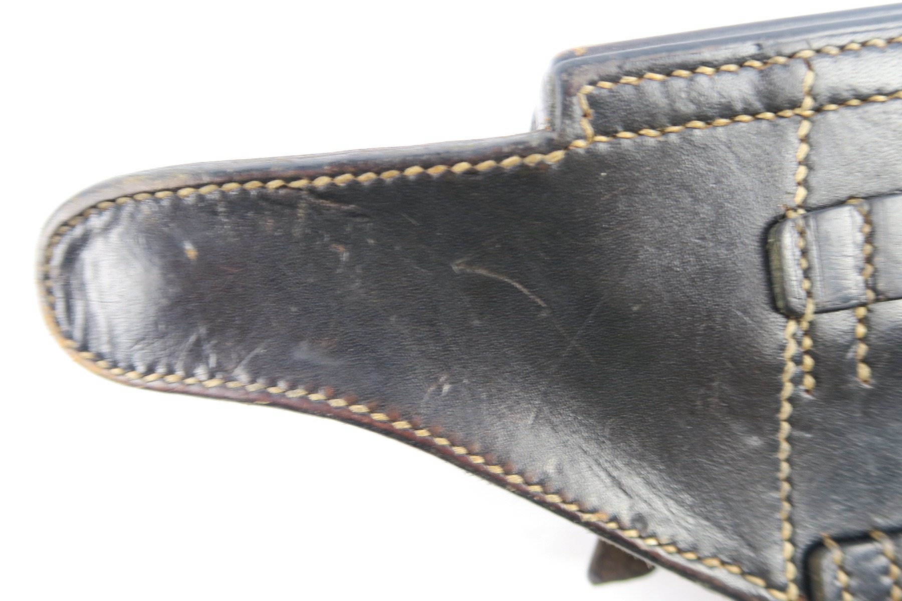 5/2/18 – This is an original 1941 dated Luger holster from WW2. The back of the holster is dated with an “epf” maker stamp and waffen eagle WaA195 military proof. There’s also a small “P.08” stamp to the right of the belt loop. The leather is fairly firm yet pliable with some exterior scuffing and wrinkling. The body and lid have almost all of the leather wear. The interior leather is very clean and the back leather is excellent. No stitching issues. Guaranteed original.