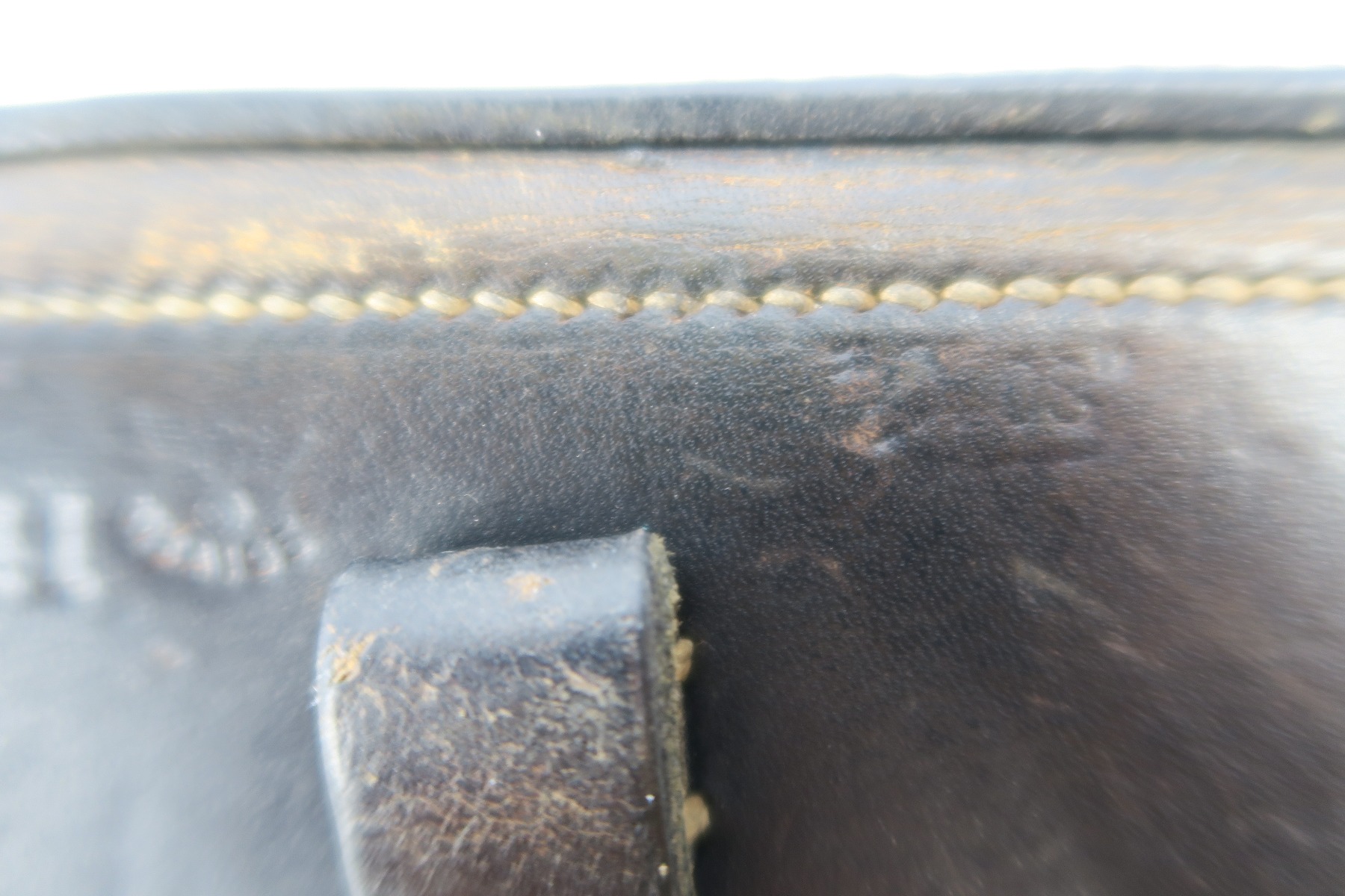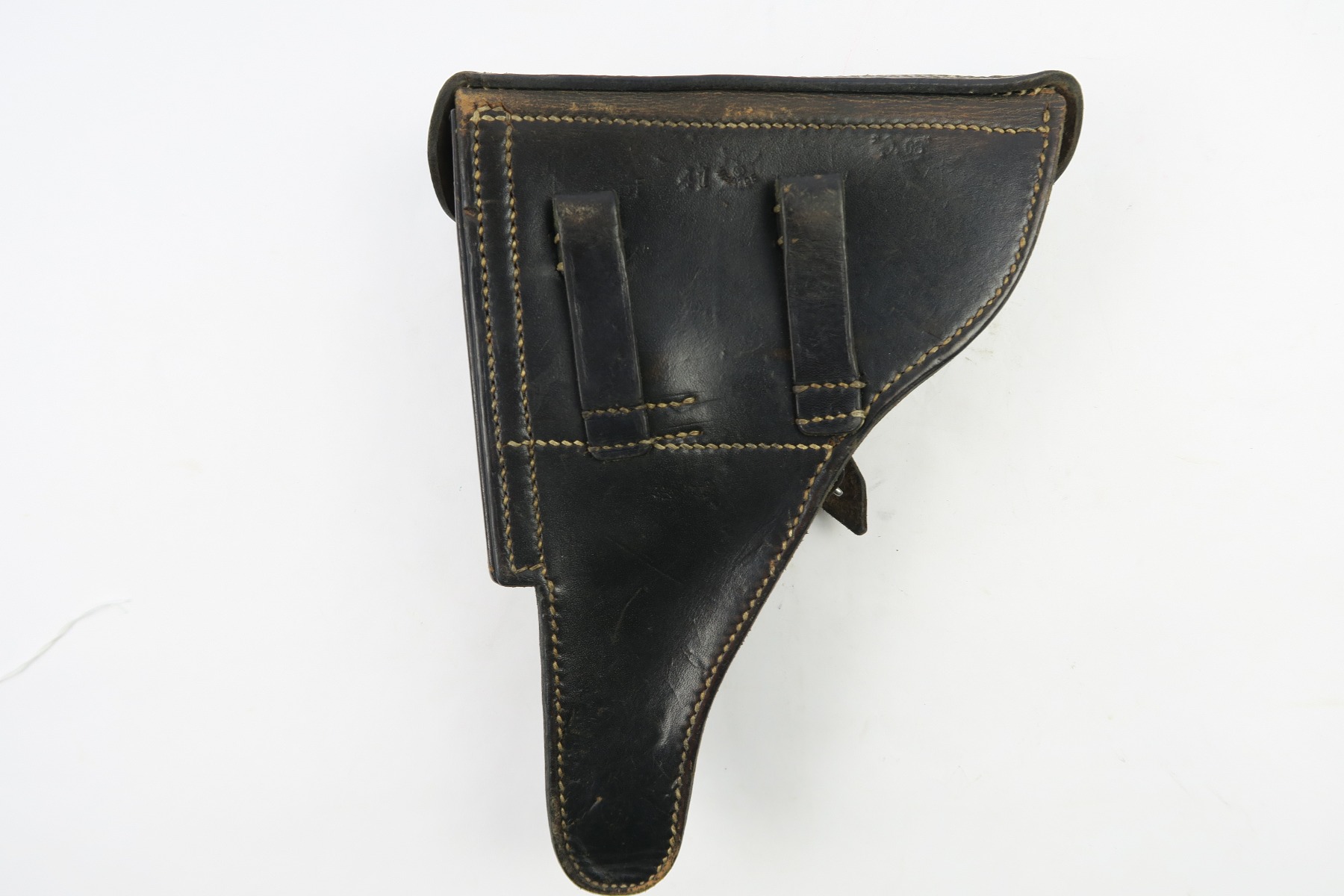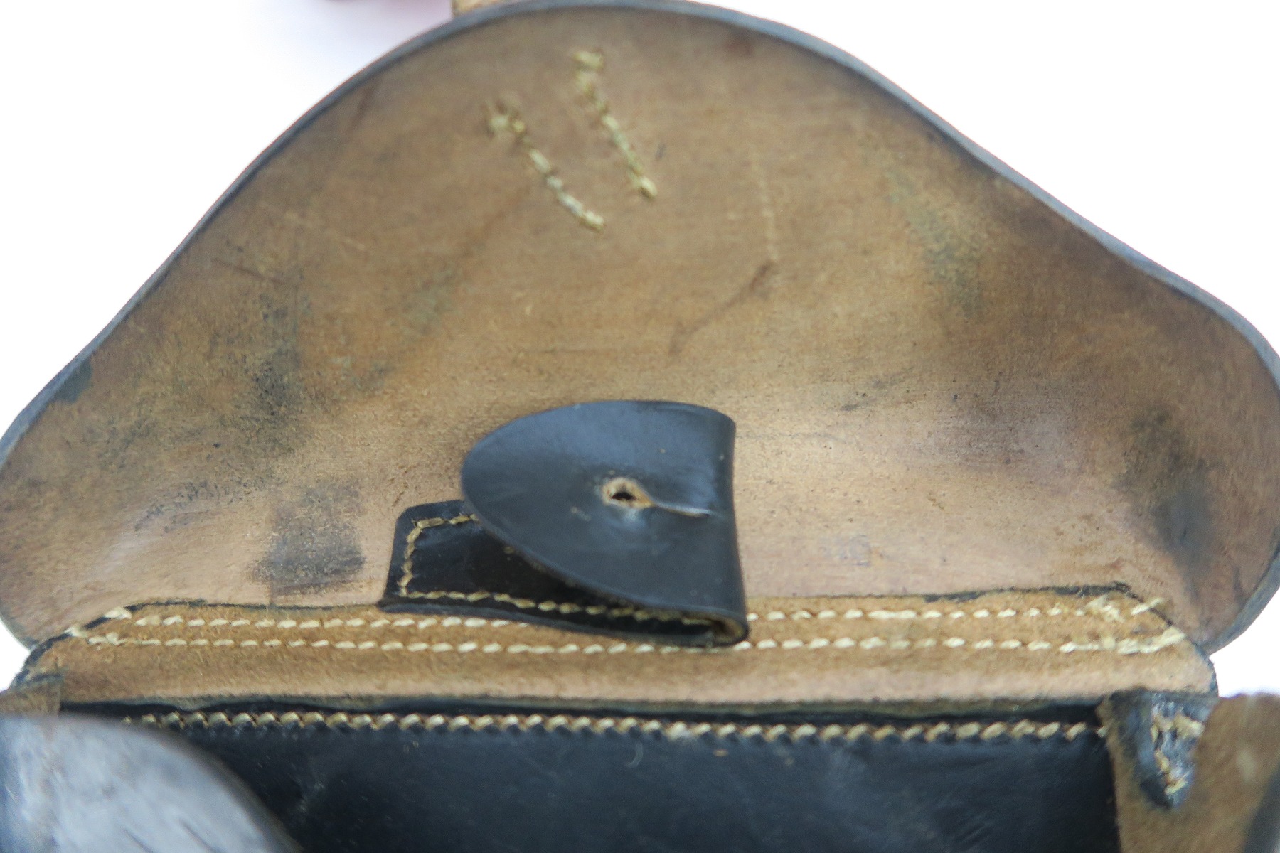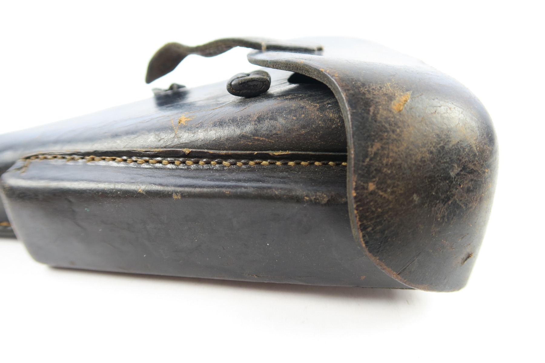 5/2/18 – This is an original 1941 dated Luger holster from WW2. The back of the holster is dated with an “epf” maker stamp and waffen eagle WaA195 military proof. There’s also a small “P.08” stamp to the right of the belt loop. The leather is fairly firm yet pliable with some exterior scuffing and wrinkling. The body and lid have almost all of the leather wear. The interior leather is very clean and the back leather is excellent. No stitching issues. Guaranteed original.