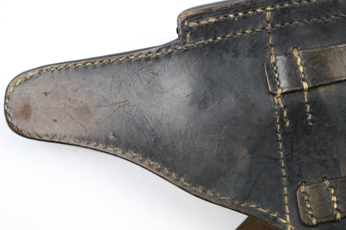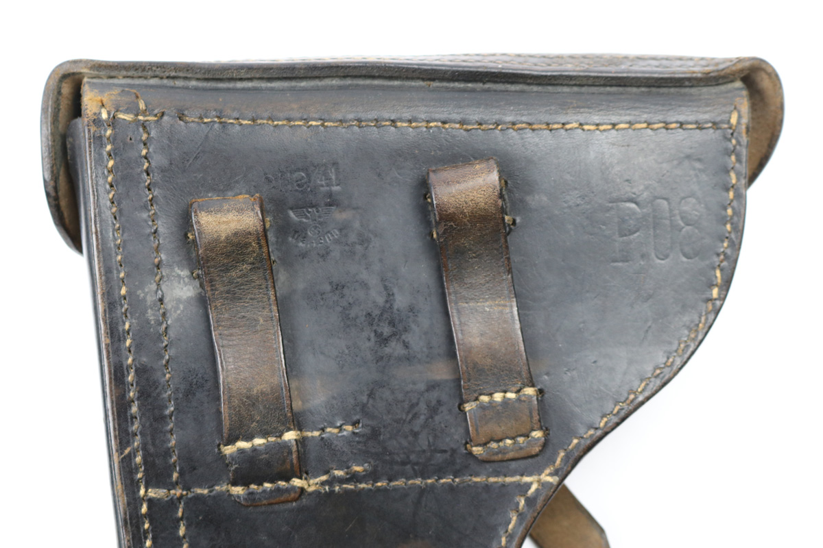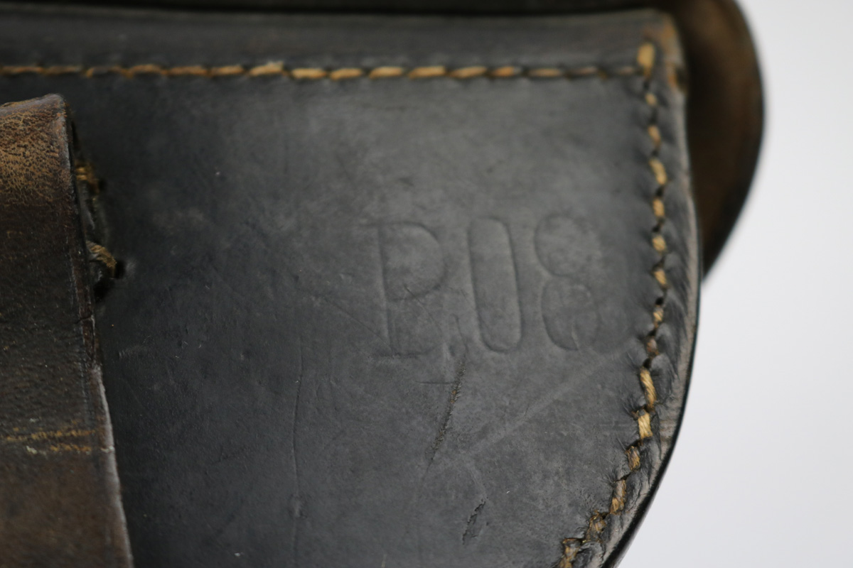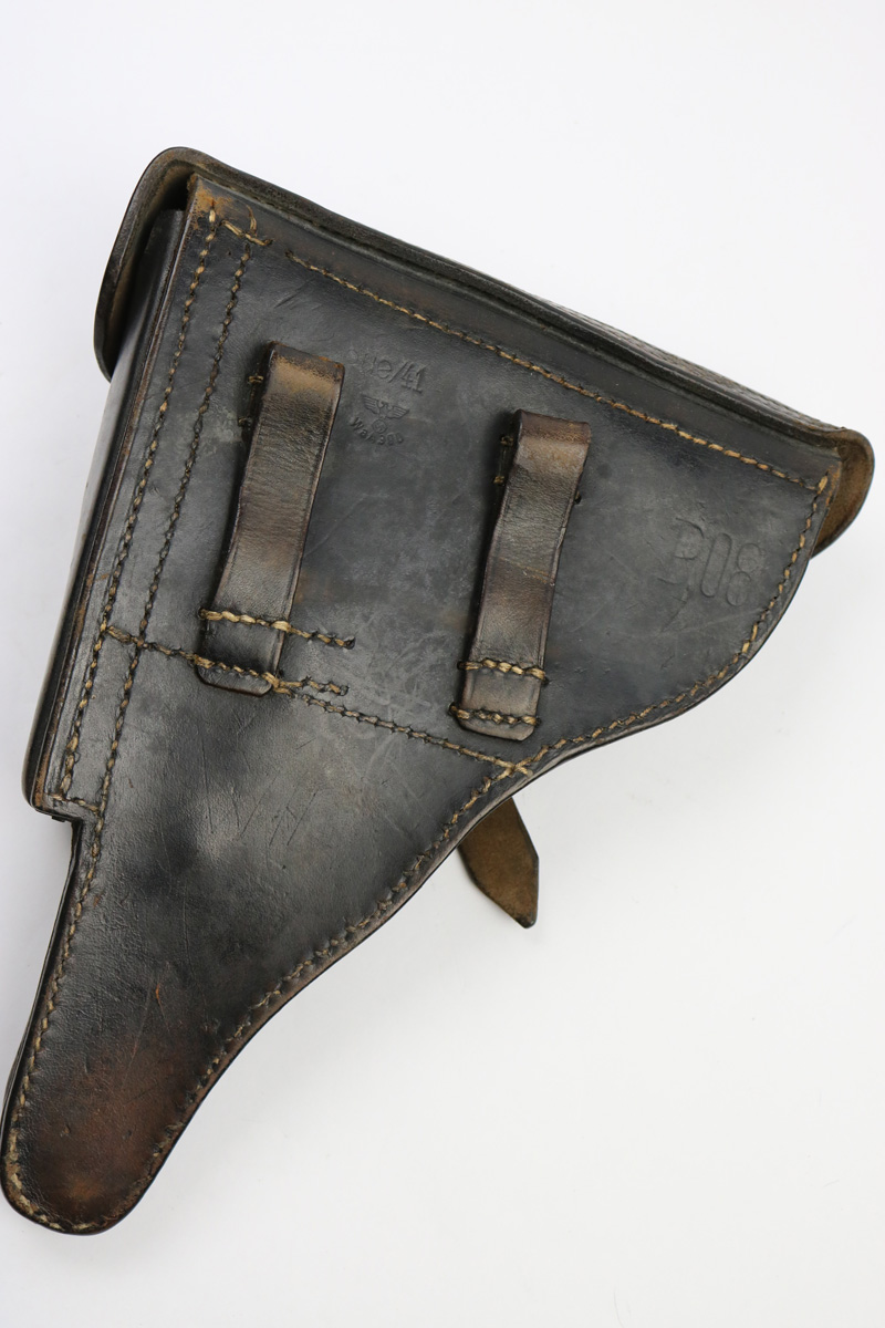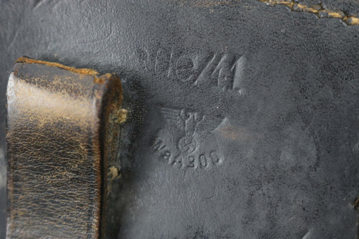 6/13/18 – This is an original WW2 1941 dated Luger holster. Maker stamped on the back leather with a ’41 date and WaA300 waffen proof. The front leather has an emblem pinned to the lid. This looks period-correct (but not factory). The leather is all in tact with normal scuffing and exterior wear. Somewhat pliable. Stitching completely in tact and original.