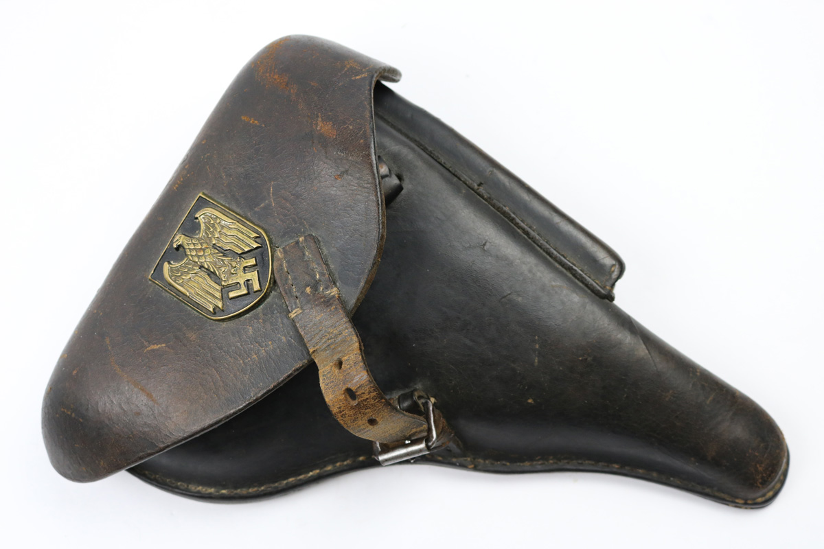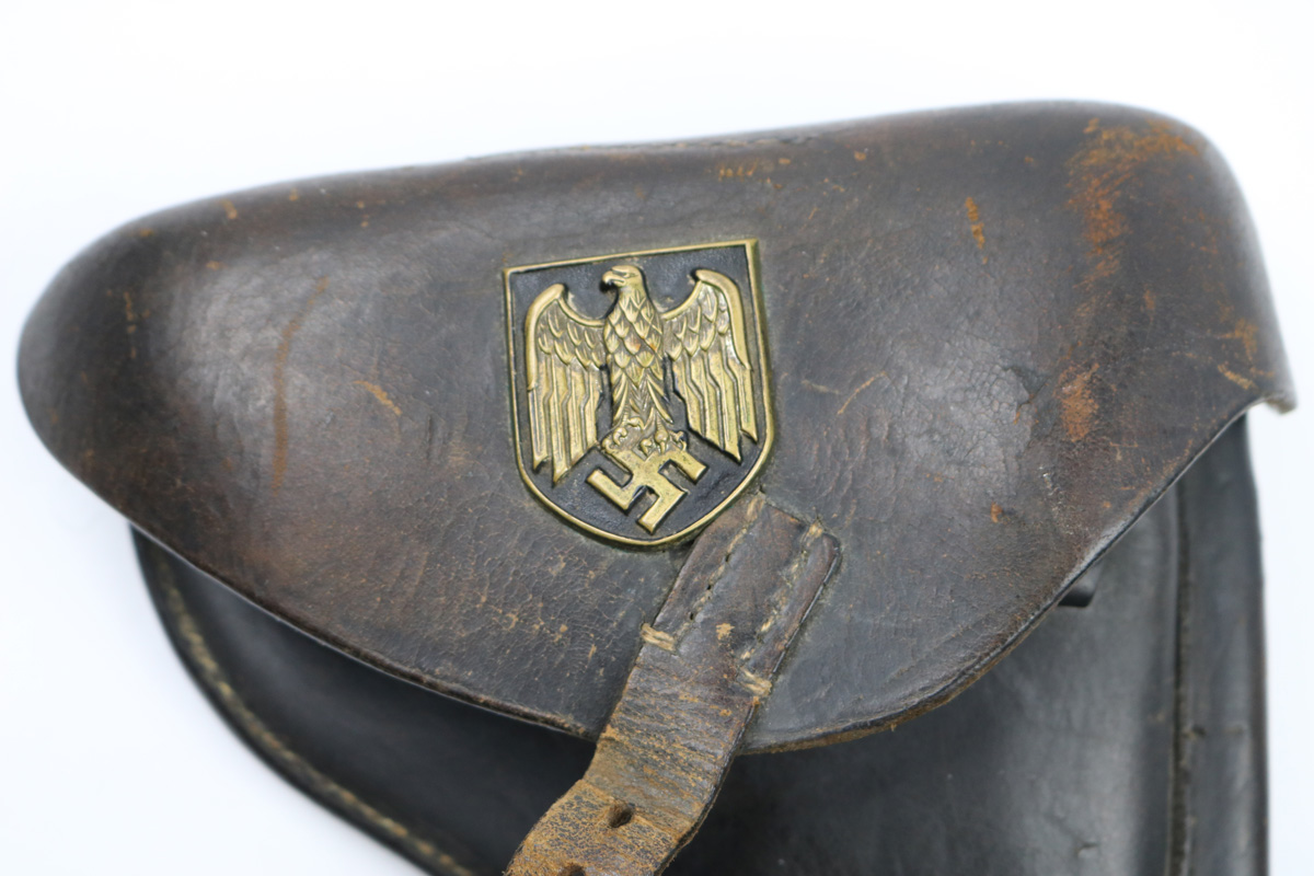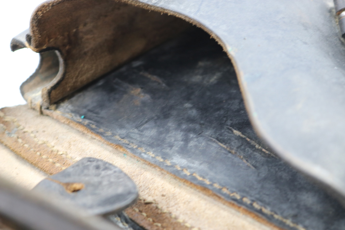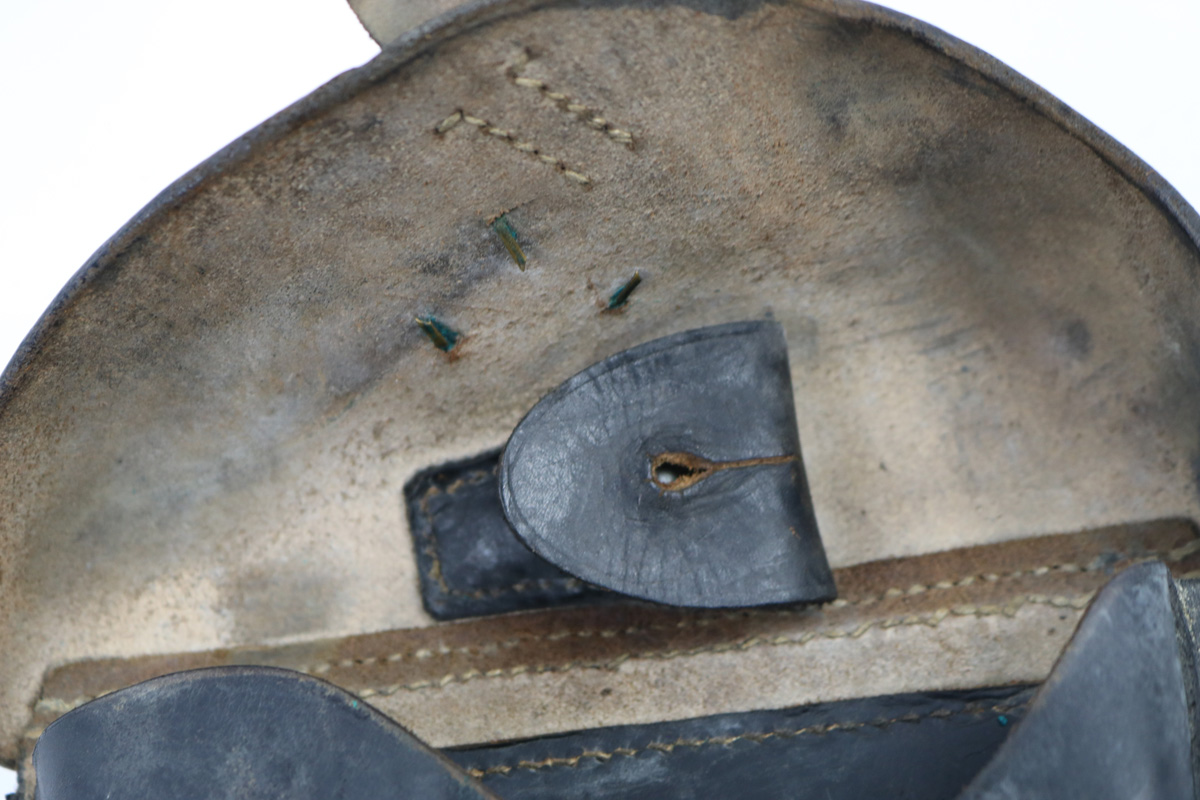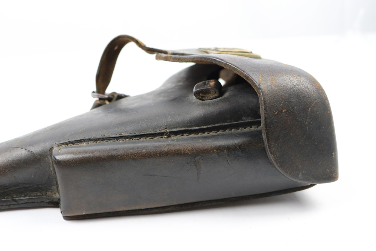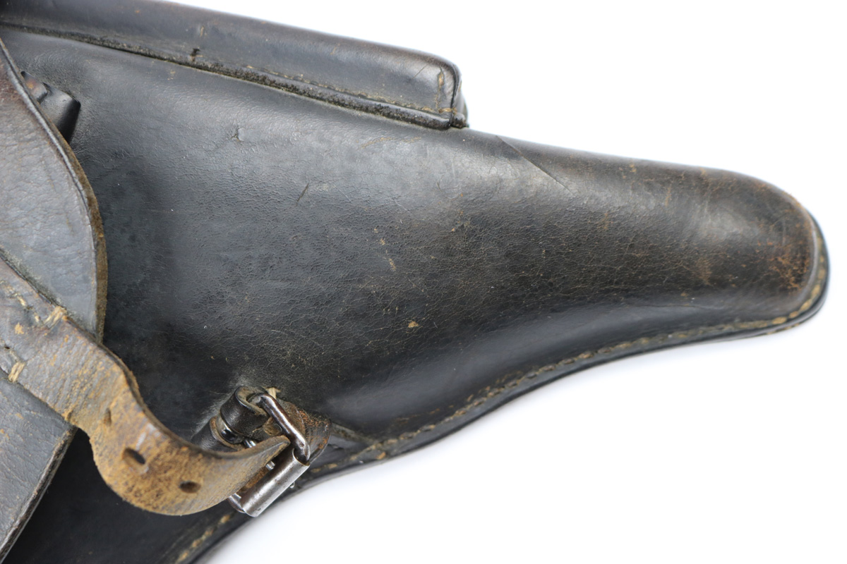 6/13/18 – This is an original WW2 1941 dated Luger holster. Maker stamped on the back leather with a ’41 date and WaA300 waffen proof. The front leather has an emblem pinned to the lid. This looks period-correct (but not factory). The leather is all in tact with normal scuffing and exterior wear. Somewhat pliable. Stitching completely in tact and original.