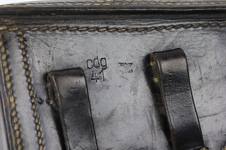 8/3/21 – This is a very nice 1941 dated Luger holster. The biggest and only major setback is the magazine pouch has been slightly cut down, likely for easier access to the spare magazine by the original user. The leather has some surface wrinkling but no serious problems. Normal pliability and clean interior leather. No stitching issues. Stamped on the back leather with a maker stamp, date stamp, waffen stamp, and a faint P.08 stamp.