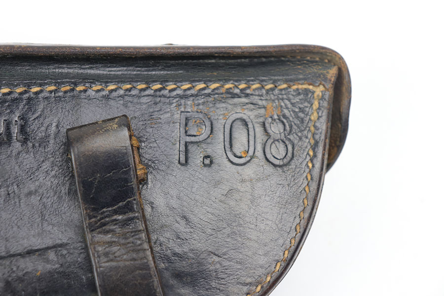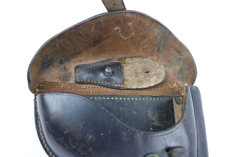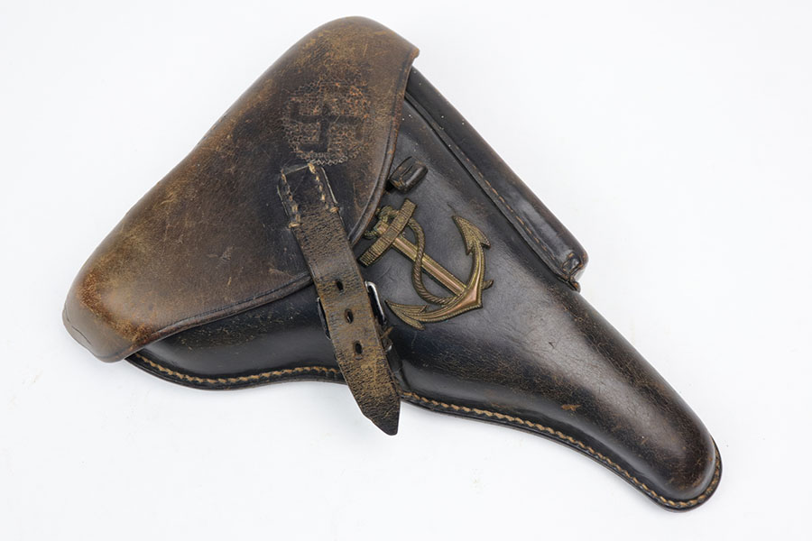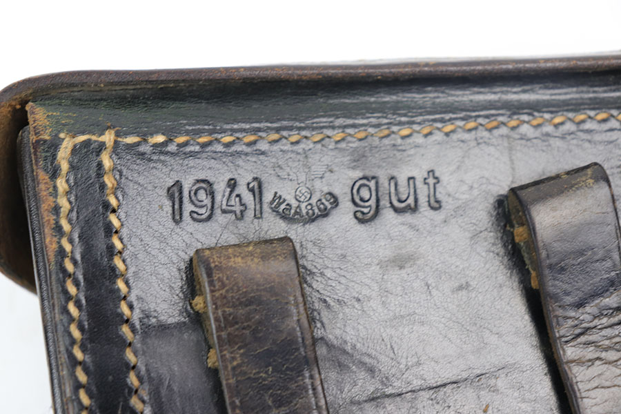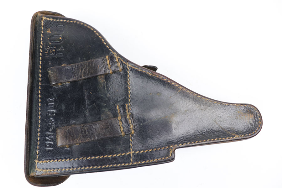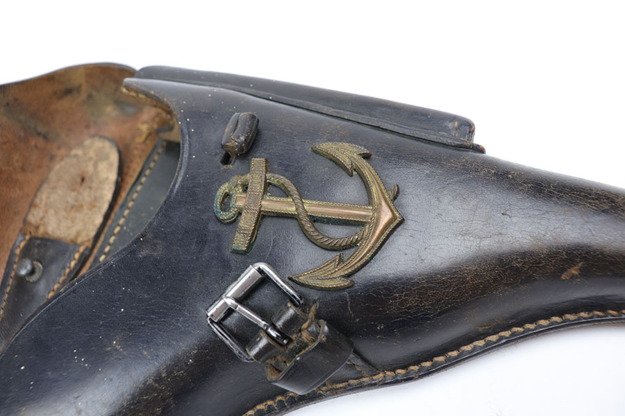 10/28/20 – This is an original 1941 dated Luger holster from WW2. Interestingly, this holster has been embellished with a Navy anchor on the front, as well as some “trench art” or a soldier’s imprinting of a swastika on the front lid – see photos. The back leather is well stamped with a “gut” (fairly rare) maker, 1941 date, waffen proof, and P.08 stamp. Some light surface scuffing and wrinkling, but overall in very good condition with normal pliability and no excessive wear. Stitching is all original and in tact.