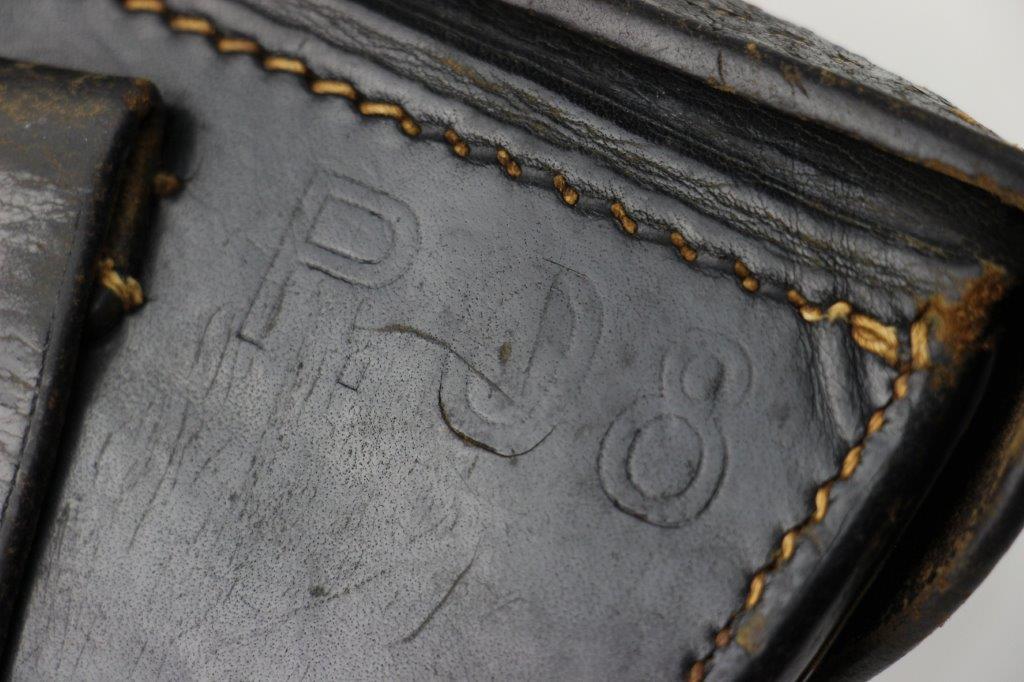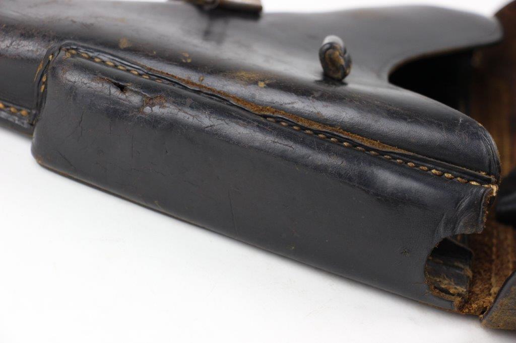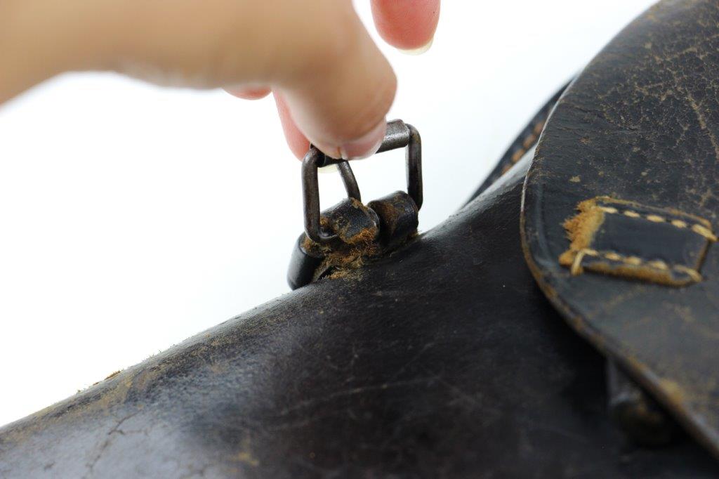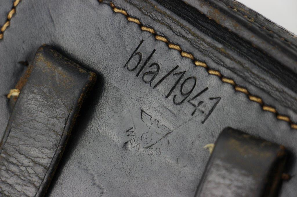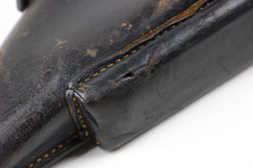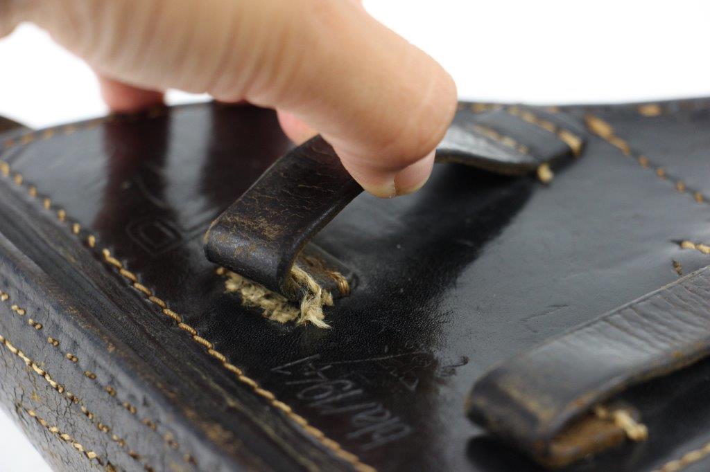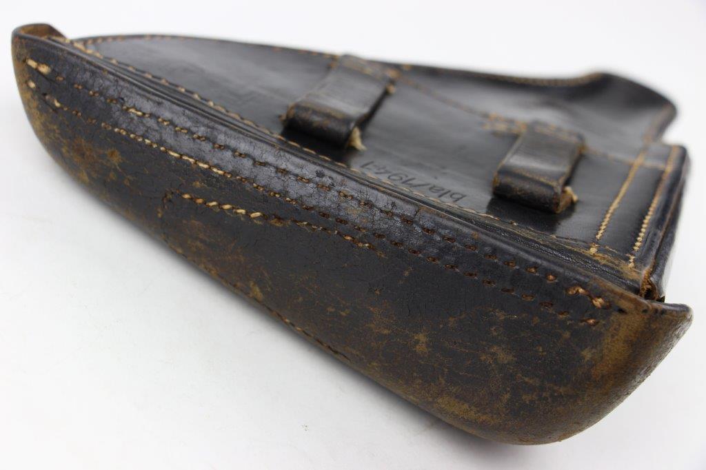 9/7/24 – This is an original 1941 dated Luger holster from WW2. The holster is in very good overall condition despite missing the front closure strap, which is broken just below the stitching, as shown. The metal retaining loop is still present, though one of the leather attachment loops is broken (shown in last photo). The rest of the leather shows natural age and use wear, with surface wrinkling and scuffing concentrated around the front of the lid and the toe of the holster. Normal use wear found on the interior leather with an intact tool pouch and original lift strap. The back leather is maker stamped “bla” for E. G. Leuner GmbH. There’s also a 1941 date, waffen military proof, and P.08 designation stamp. Original stitching throughout and normal pliability. Still functional and all original.