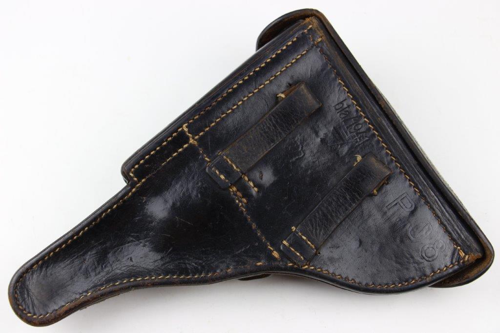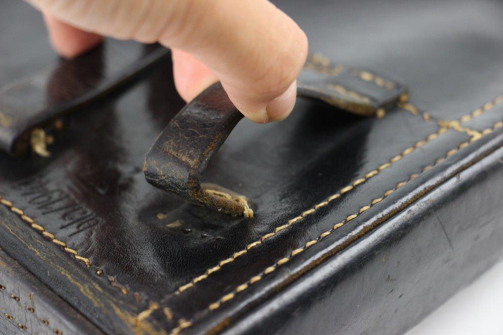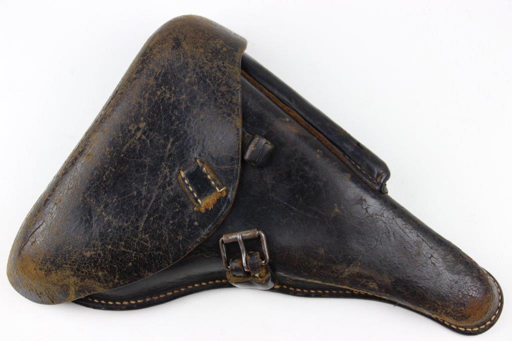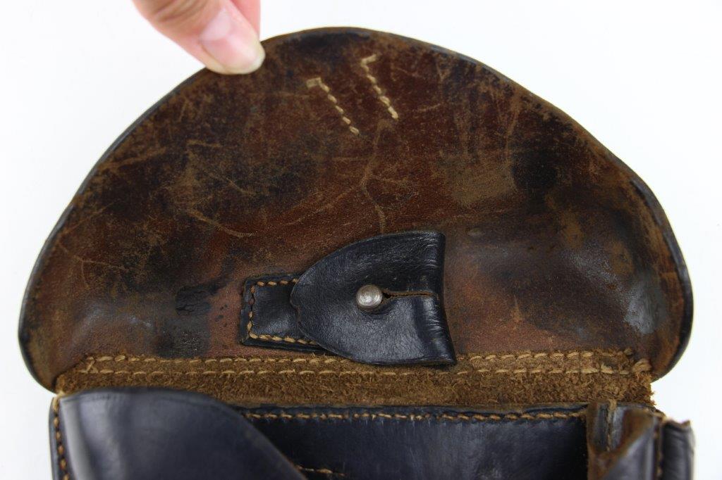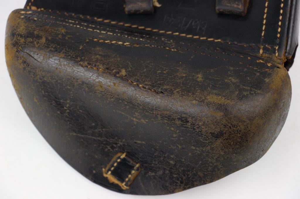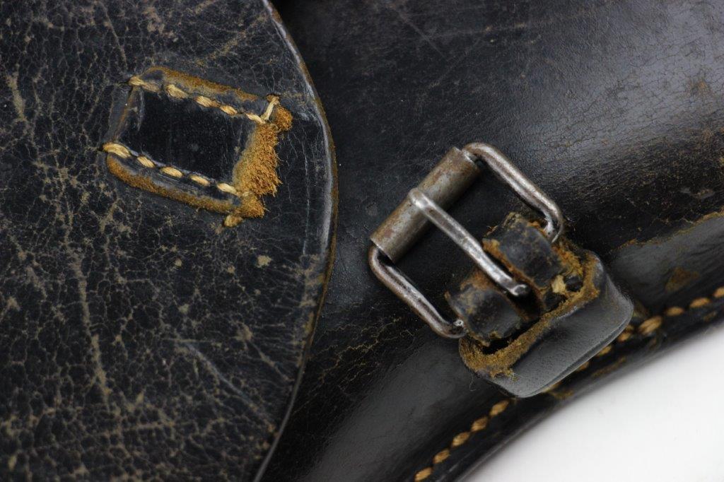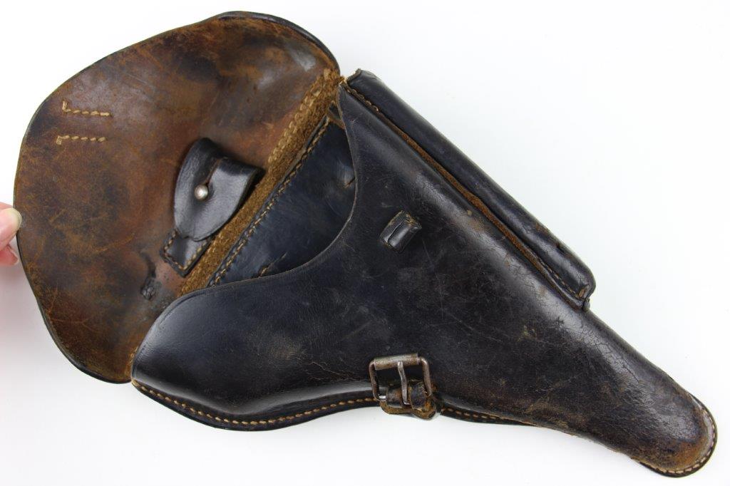 9/7/24 – This is an original 1941 dated Luger holster from WW2. The holster is in very good overall condition despite missing the front closure strap, which is broken just below the stitching, as shown. The metal retaining loop is still present, though one of the leather attachment loops is broken (shown in last photo). The rest of the leather shows natural age and use wear, with surface wrinkling and scuffing concentrated around the front of the lid and the toe of the holster. Normal use wear found on the interior leather with an intact tool pouch and original lift strap. The back leather is maker stamped “bla” for E. G. Leuner GmbH. There’s also a 1941 date, waffen military proof, and P.08 designation stamp. Original stitching throughout and normal pliability. Still functional and all original.