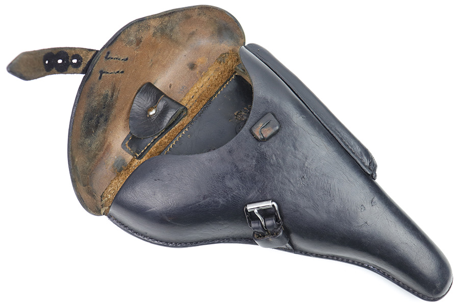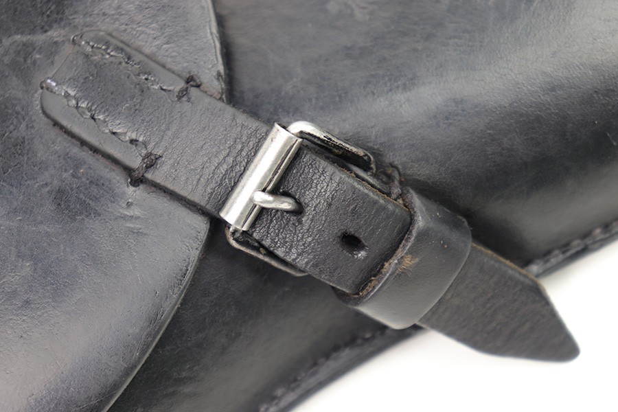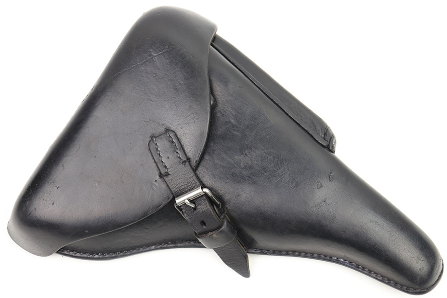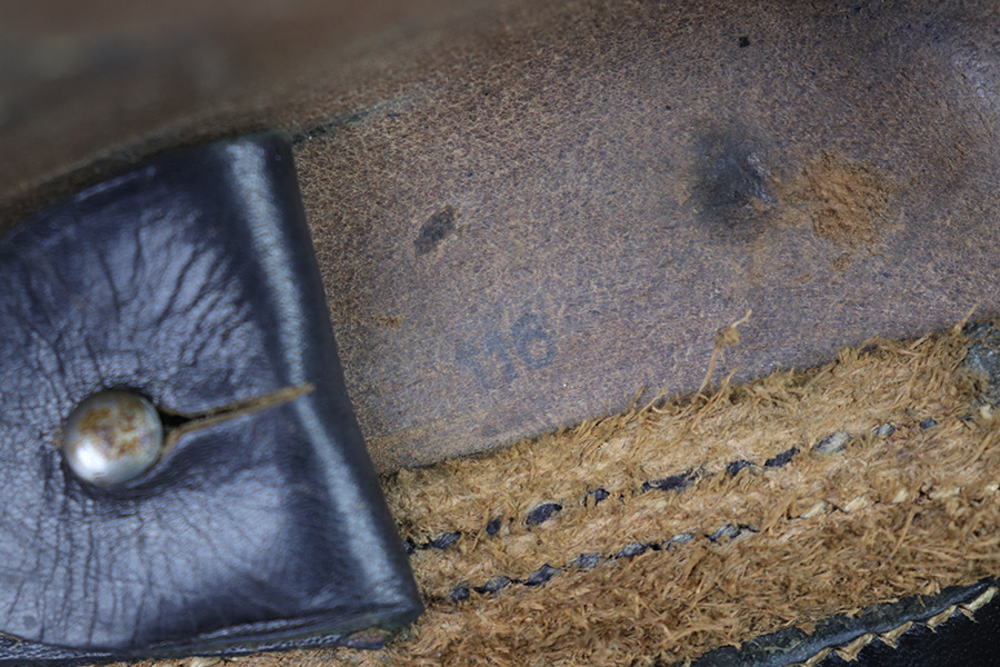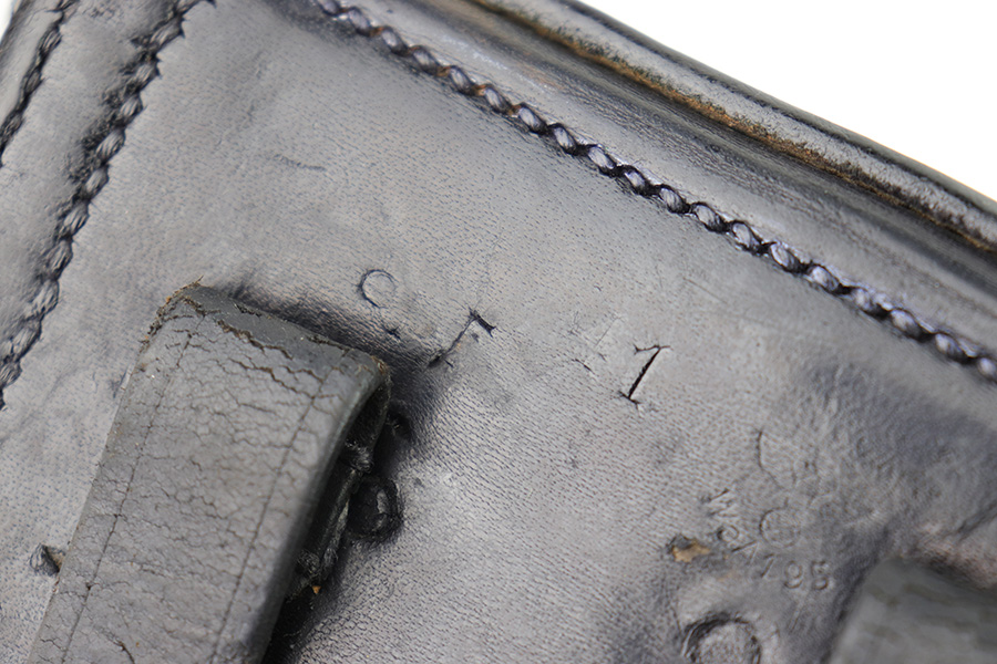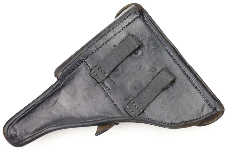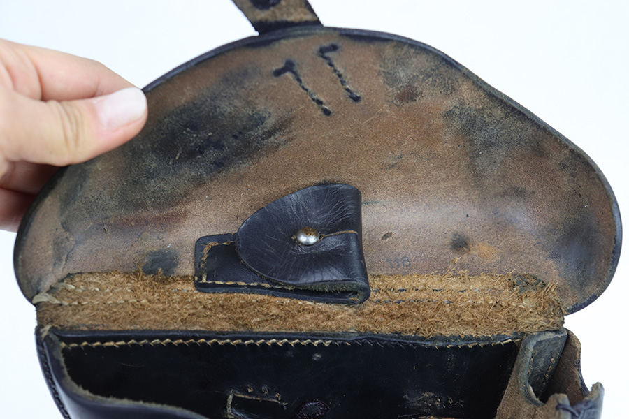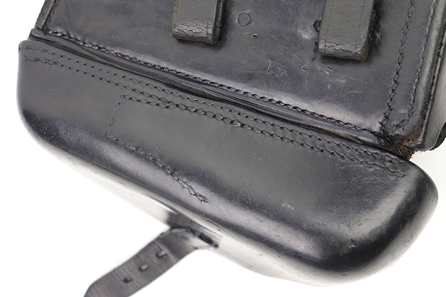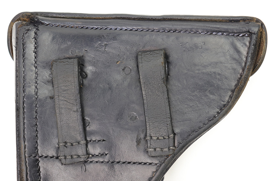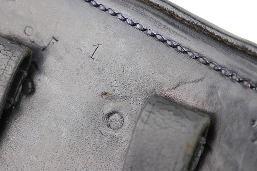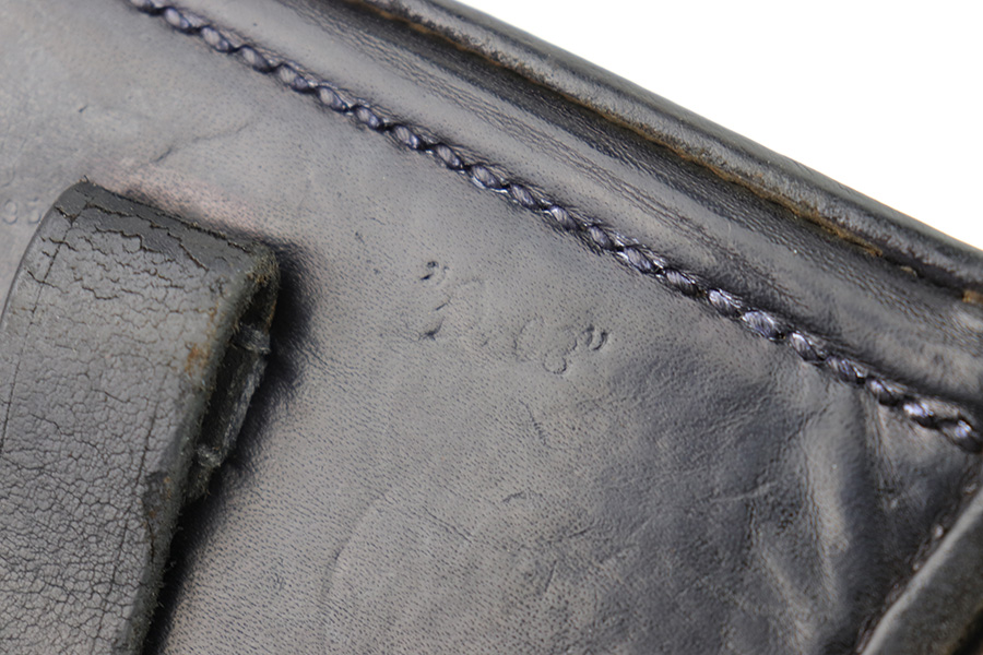 3/13/23 – This is an original 1941 dated Luger holster from WW2. The holster had both belt loops removed and rivets were added at some point post-factory. There’s then evidence that the rivet holes were plugged, and leather belt loops were then added as a result to restore the holster back to a more original configuration. The result is replacement stitching and belt loops along with plug marks on the back leather where the rivets were. The original maker stamp, date stamp, waffen proof, and P.08 stamp are still visible however on the back leather. The rest of the holster is in great condition with all original stitching intact and nice leather. Normal pliability and mild surface wear and signs of previous use.