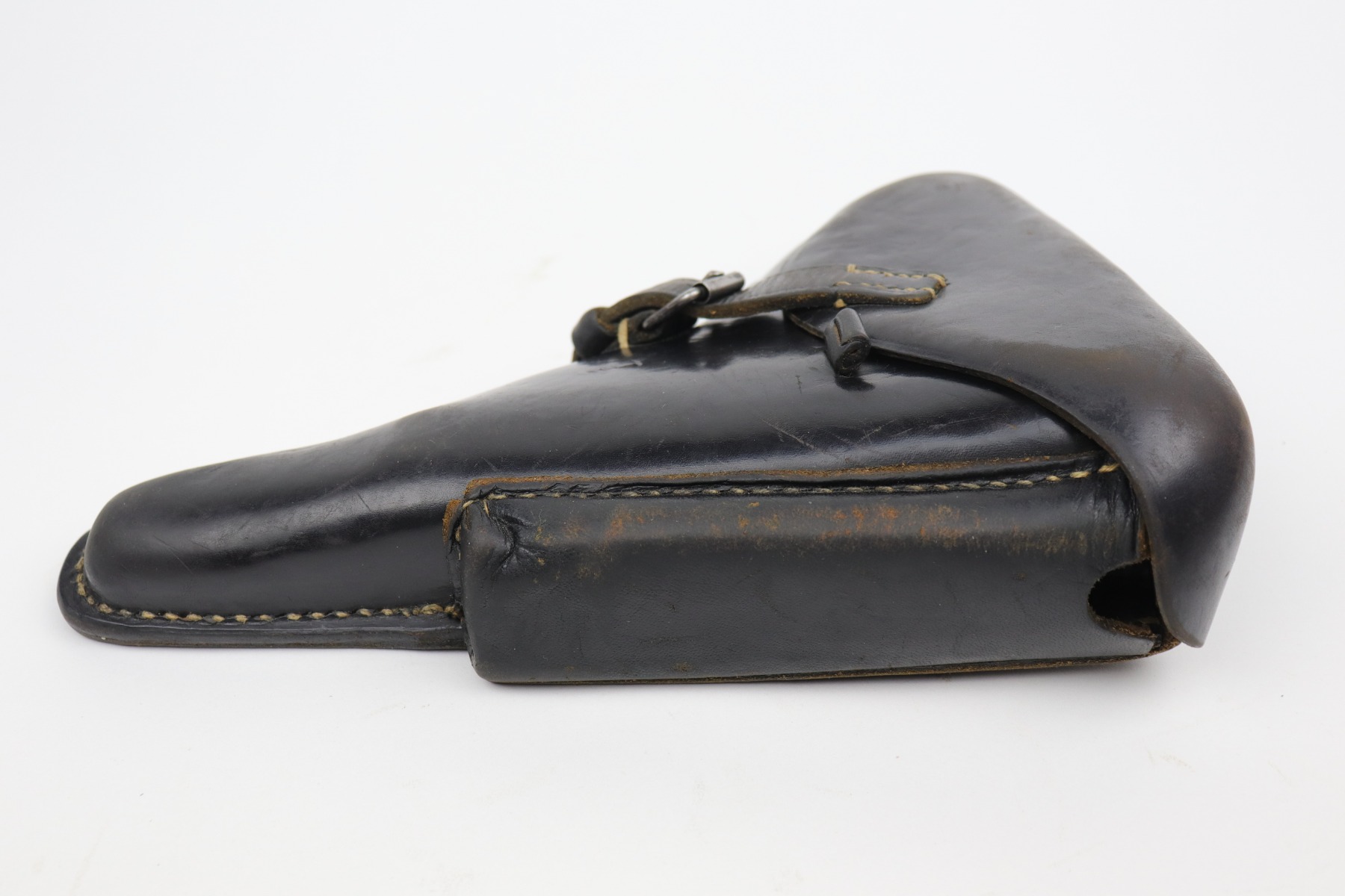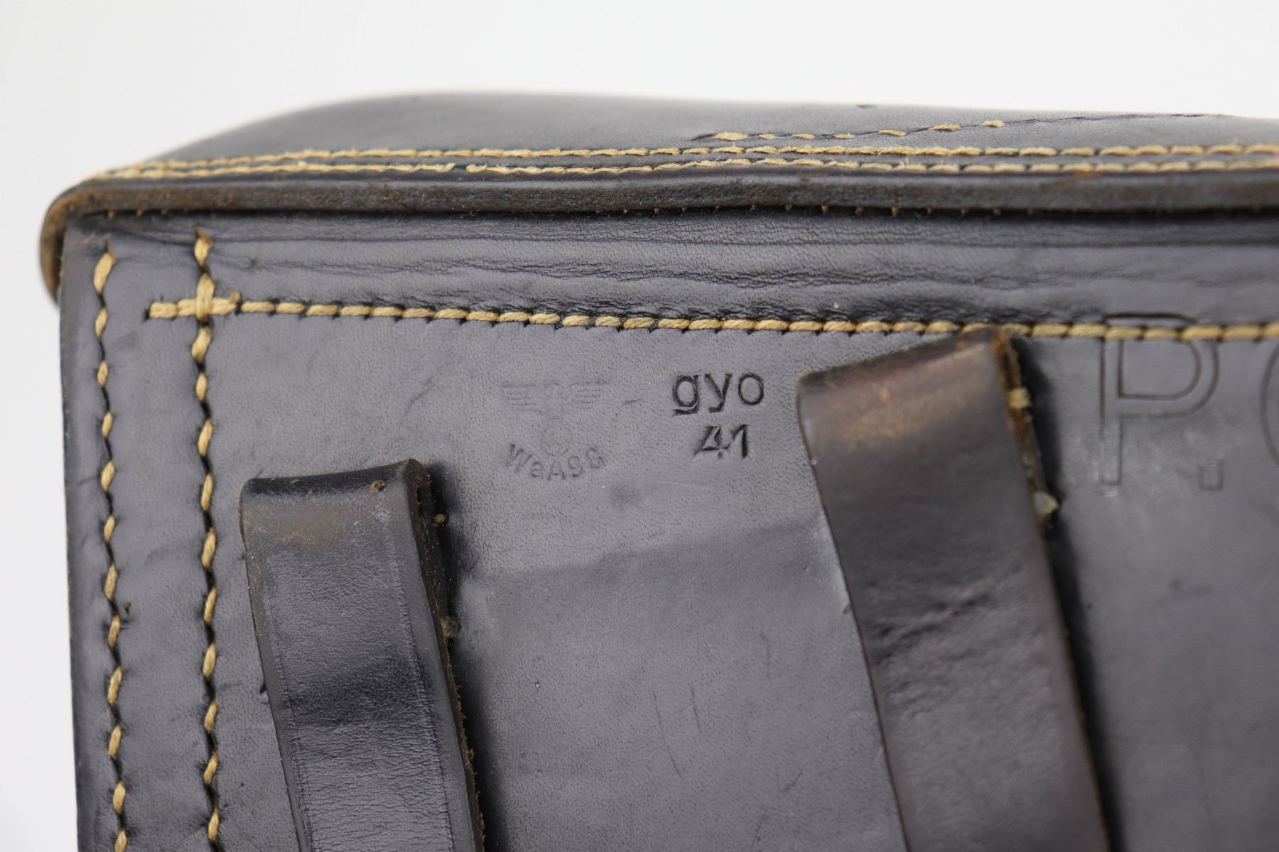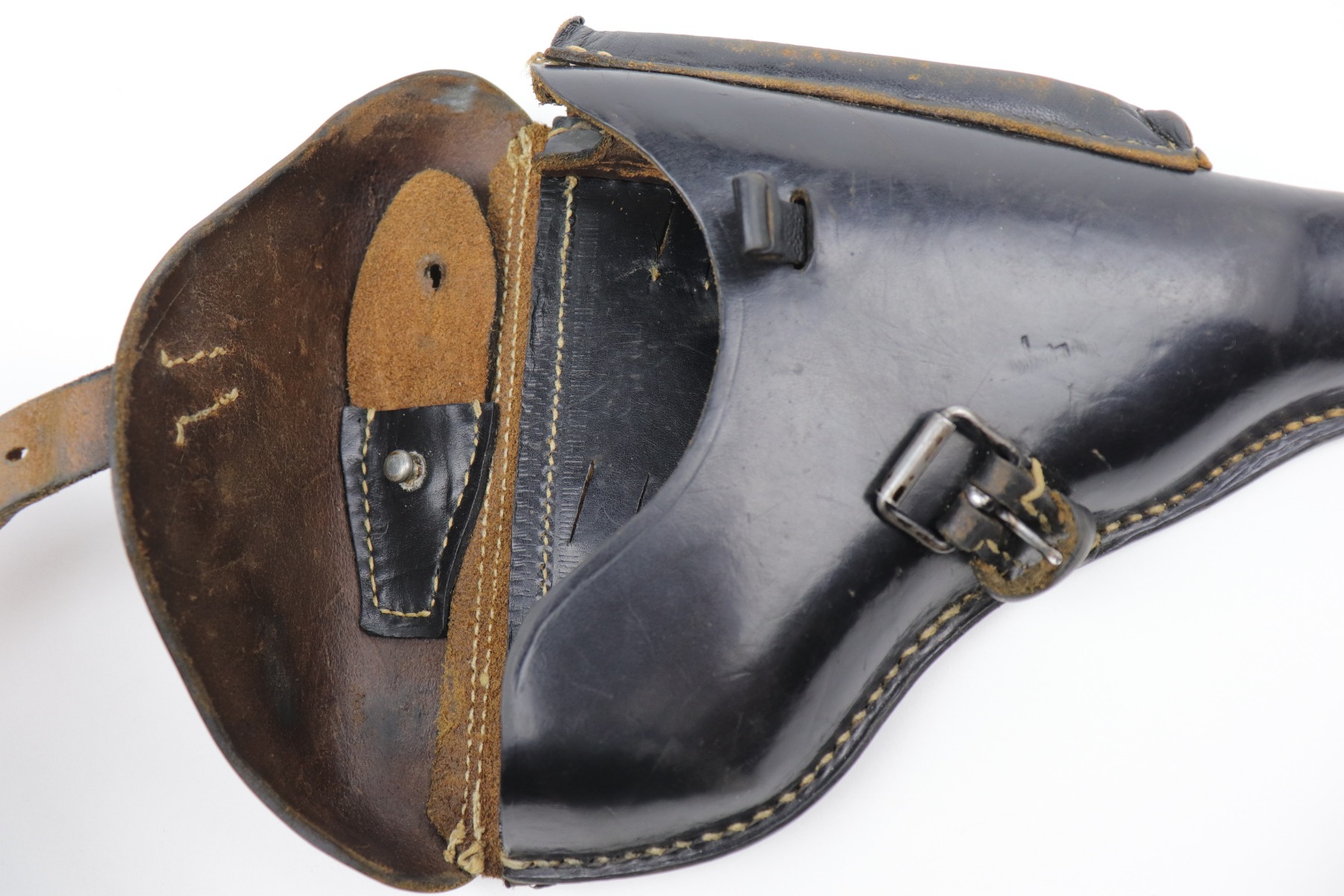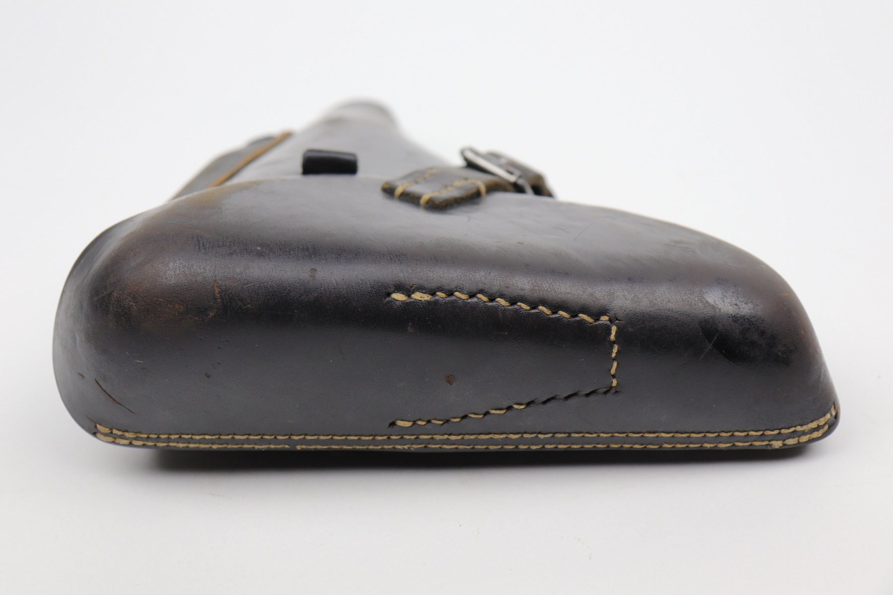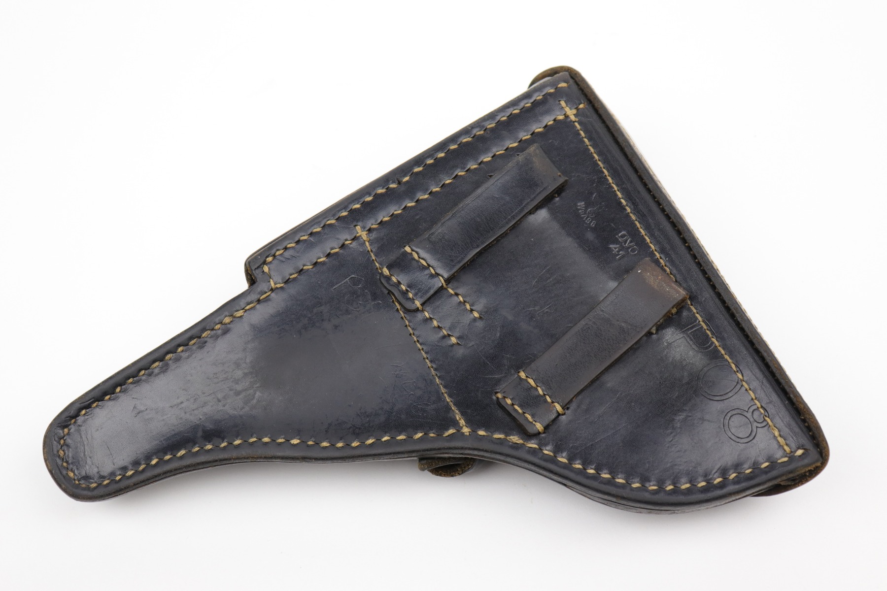 10/14/20 – This is an excellent example of a 1941-dated black leather Luger holster. It is dated 1941, waffenamt, and makers marked on the back. The holster is excellent – some scuffing and minor dings throughout. There is some writing very lightly scratched into the leather on the back, toward the bottom.