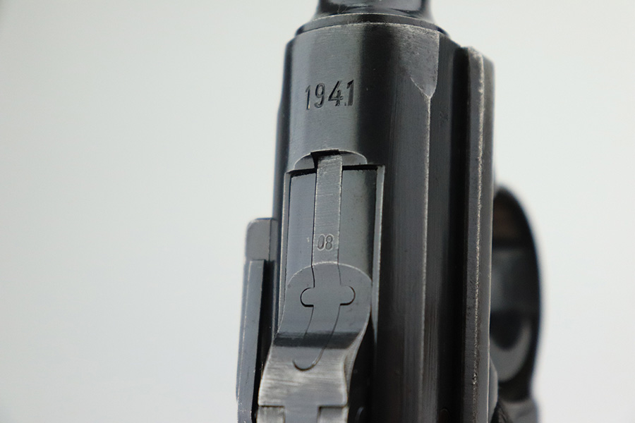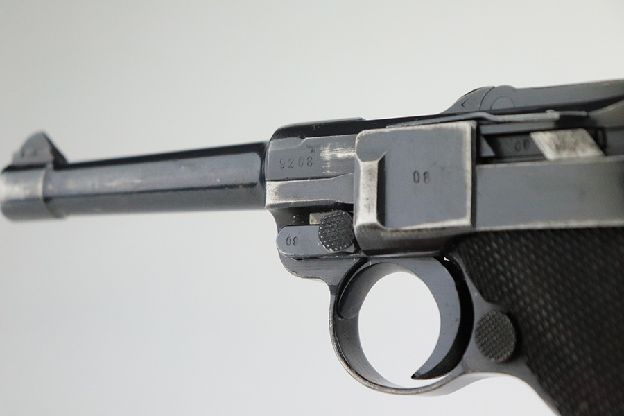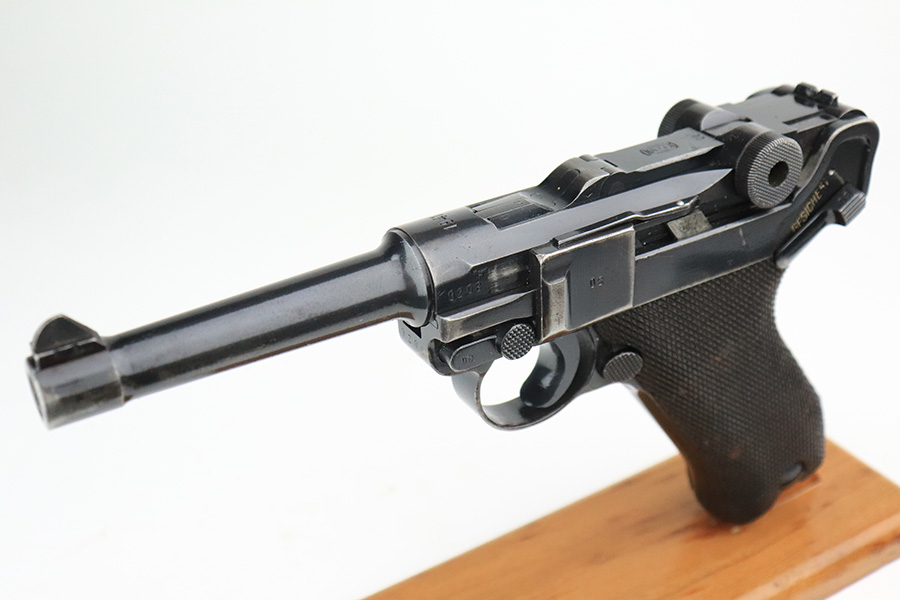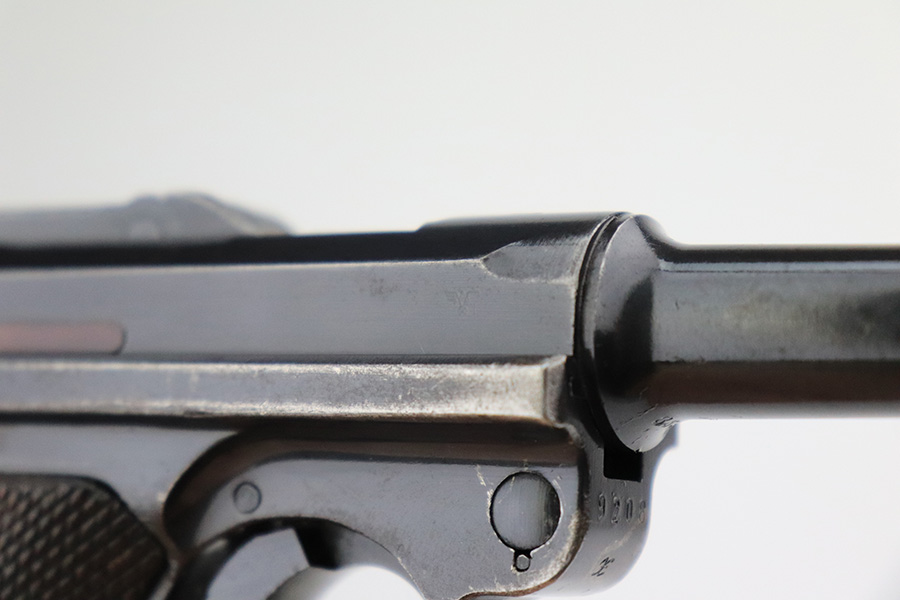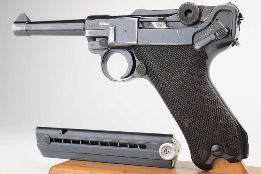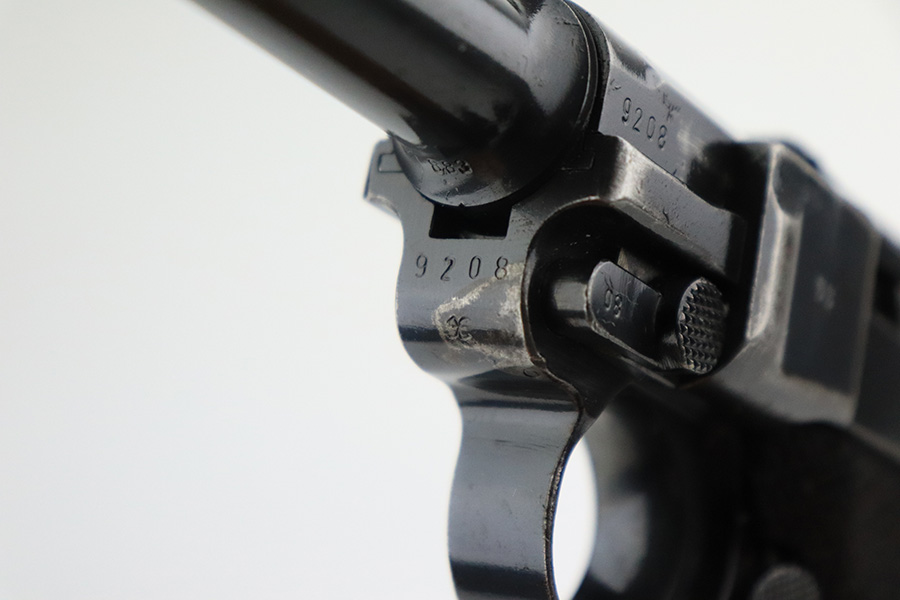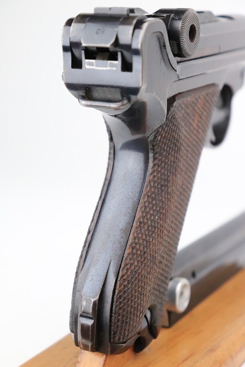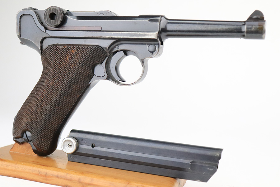 6/28/22 – This is an excellent example of a Mauser Banner Luger issued to the Nazi police in 1941. It is all matching, has an added police sear safety, and a proper police “Eagle L” proof on the right side of the slide. It has retained about 94-95% of its original finish. Minor wear on the side plate, side rails, and around the muzzle. Some light spotty wear along the barrel. Brown patina and spotty oxidation on the grip straps. One tiny scratch on the left side of the frame. Comes with excellent wood grips that are not numbered but are “Eagle 655” proofed. Also comes with a mismatched police arsenal-numbered magazine. Excellent shiny bore with strong rifling.