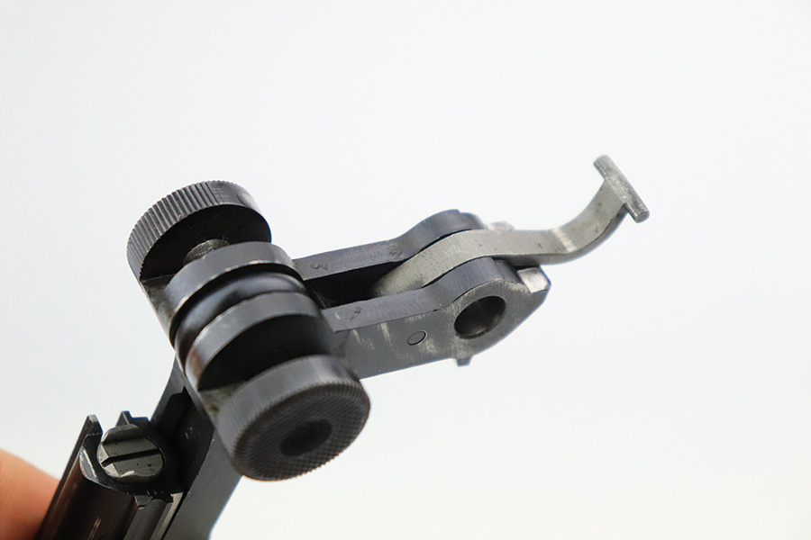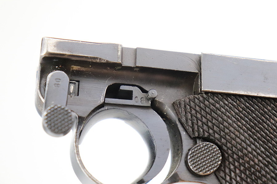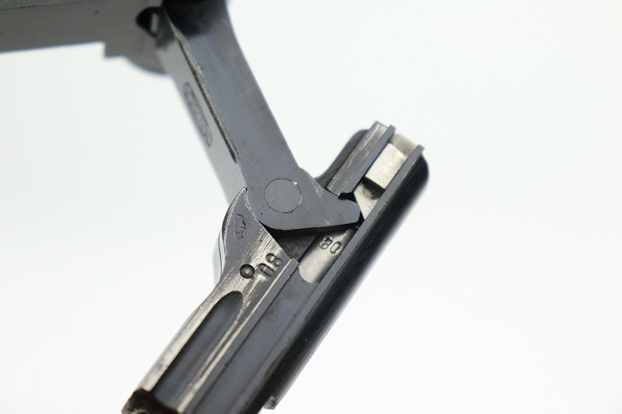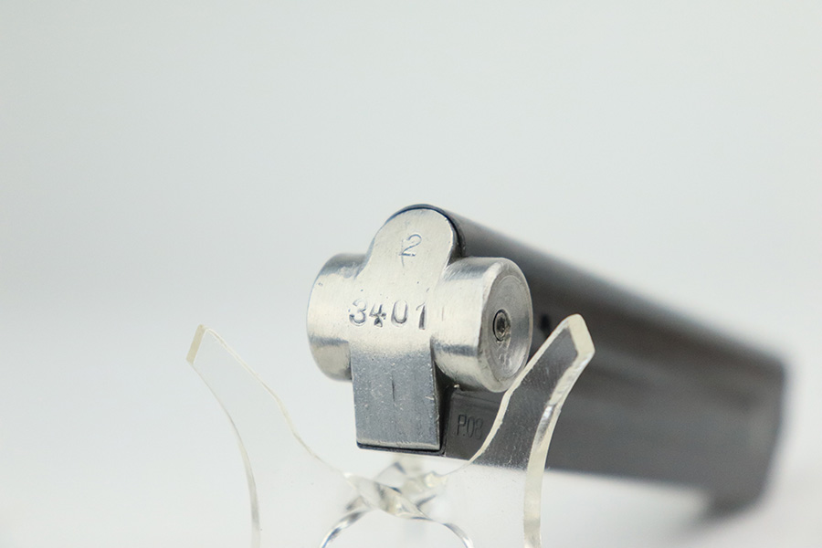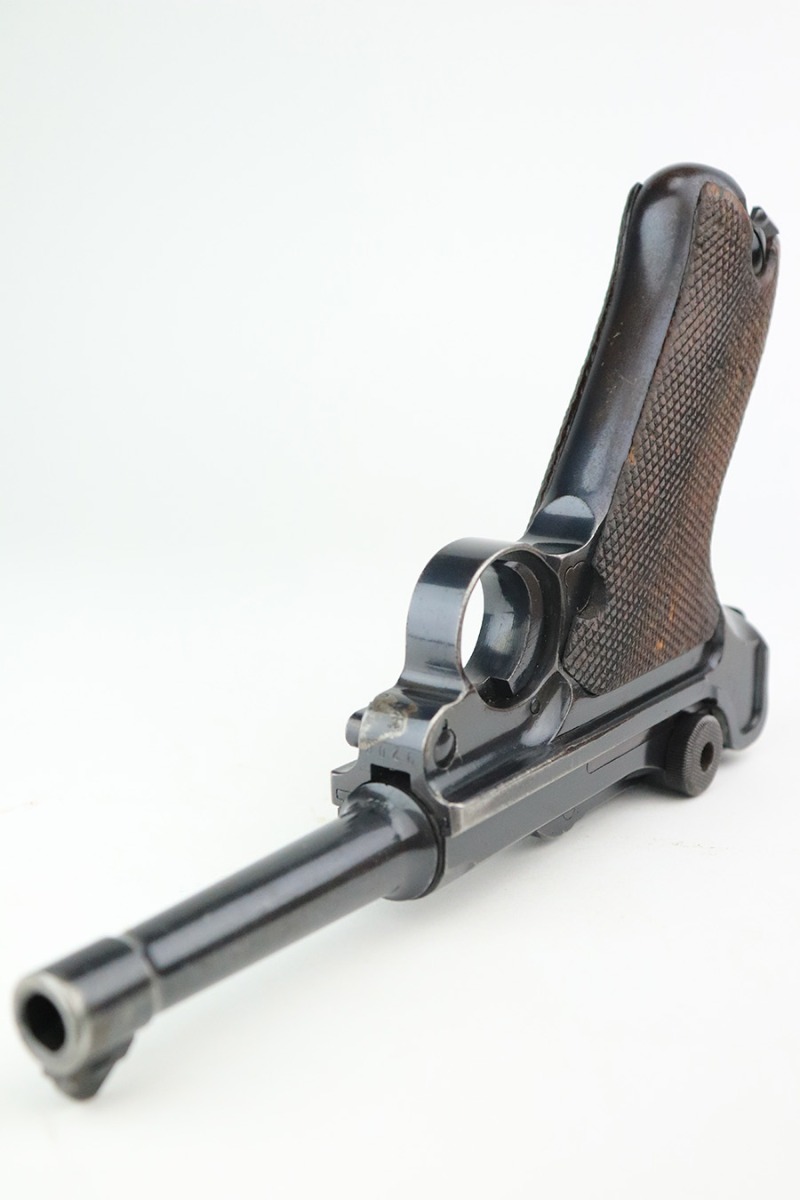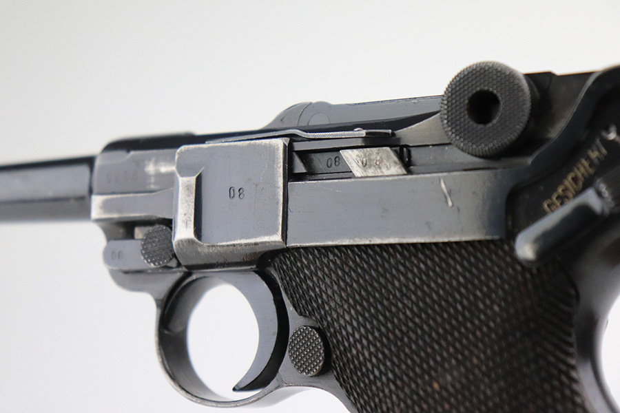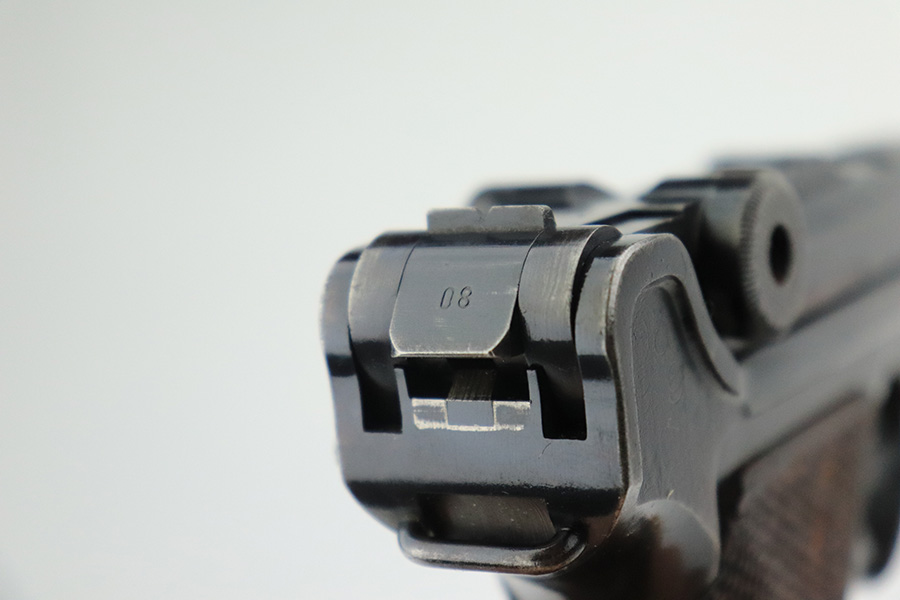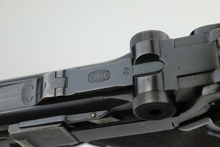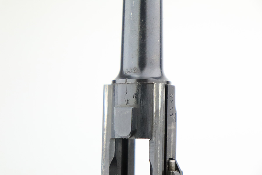 6/28/22 – This is an excellent example of a Mauser Banner Luger issued to the Nazi police in 1941. It is all matching, has an added police sear safety, and a proper police “Eagle L” proof on the right side of the slide. It has retained about 94-95% of its original finish. Minor wear on the side plate, side rails, and around the muzzle. Some light spotty wear along the barrel. Brown patina and spotty oxidation on the grip straps. One tiny scratch on the left side of the frame. Comes with excellent wood grips that are not numbered but are “Eagle 655” proofed. Also comes with a mismatched police arsenal-numbered magazine. Excellent shiny bore with strong rifling.