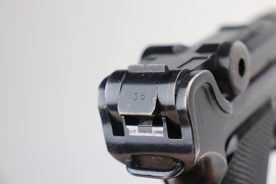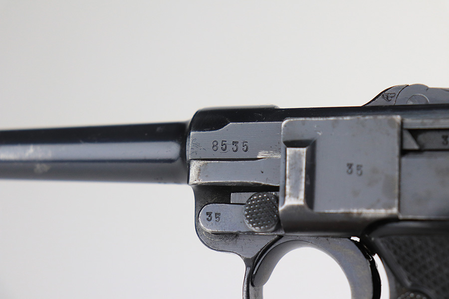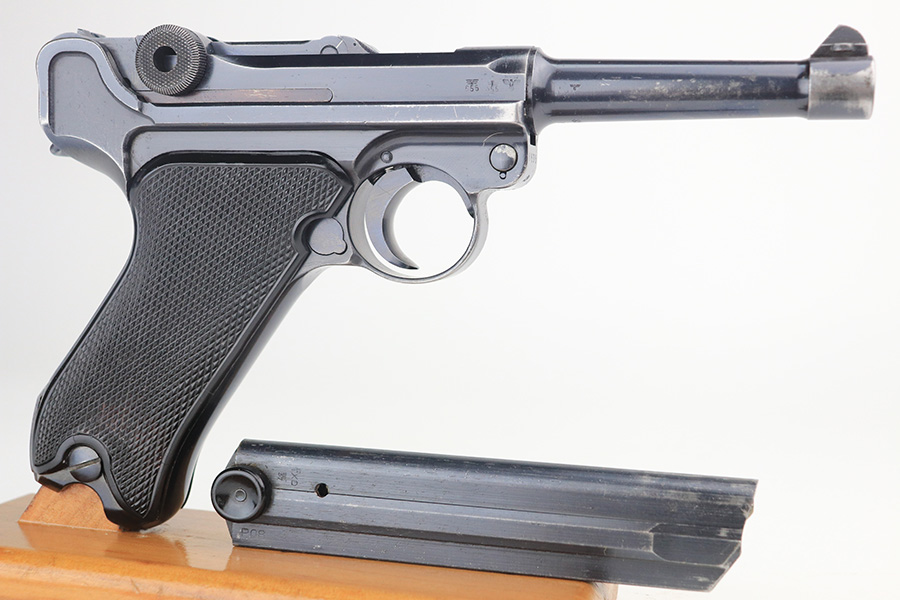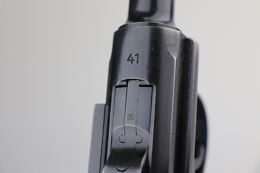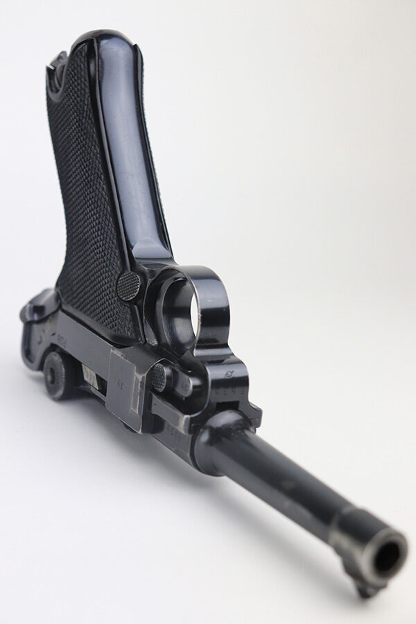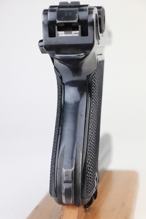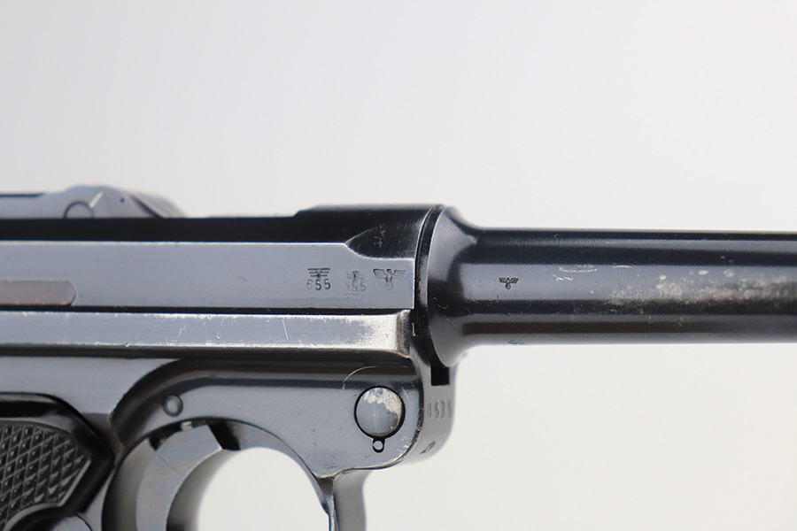 12/15/21 – This is a very nice example of a “Black Widow” Mauser Luger issued to the Nazi military in 1941. It is all matching and has the proper “Eagle 655” Nazi military acceptance proofs on the right side of the slide. It comes with a set of excellent original black widow grips and one proper black widow magazine. It has retained about 92% of its original finish. There is wear around the muzzle, on the side rails, and at the base of the front strap. Very minor wear on the side plate. Spotty wear on both sides of the barrel. There is minor scratchy wear on the front strap and freckling on the back strap. Some spotty oxidation on the side plate and left side of the frame. The bore has decent rifling, but there is minor pitting in the grooves.