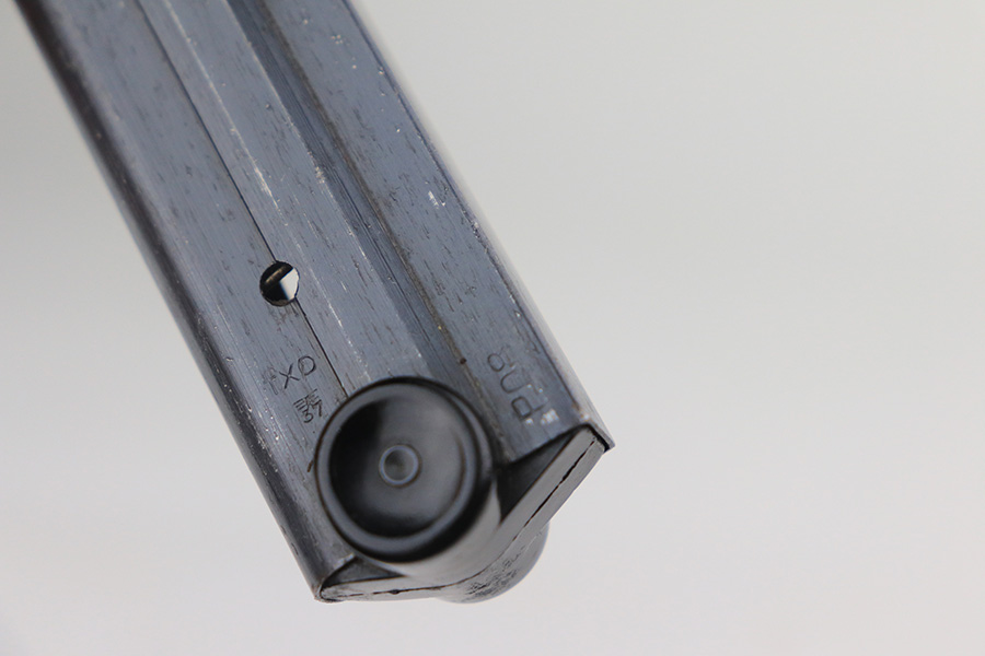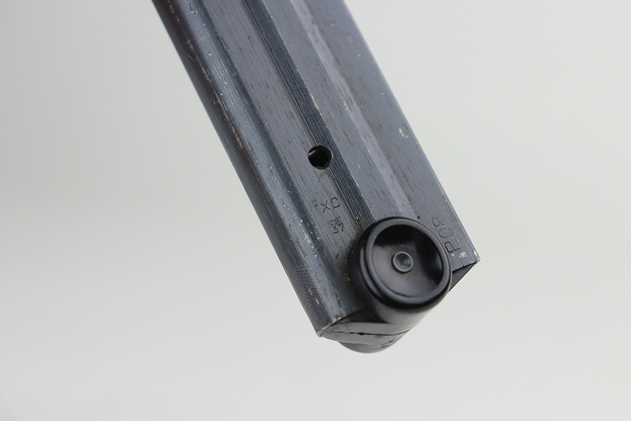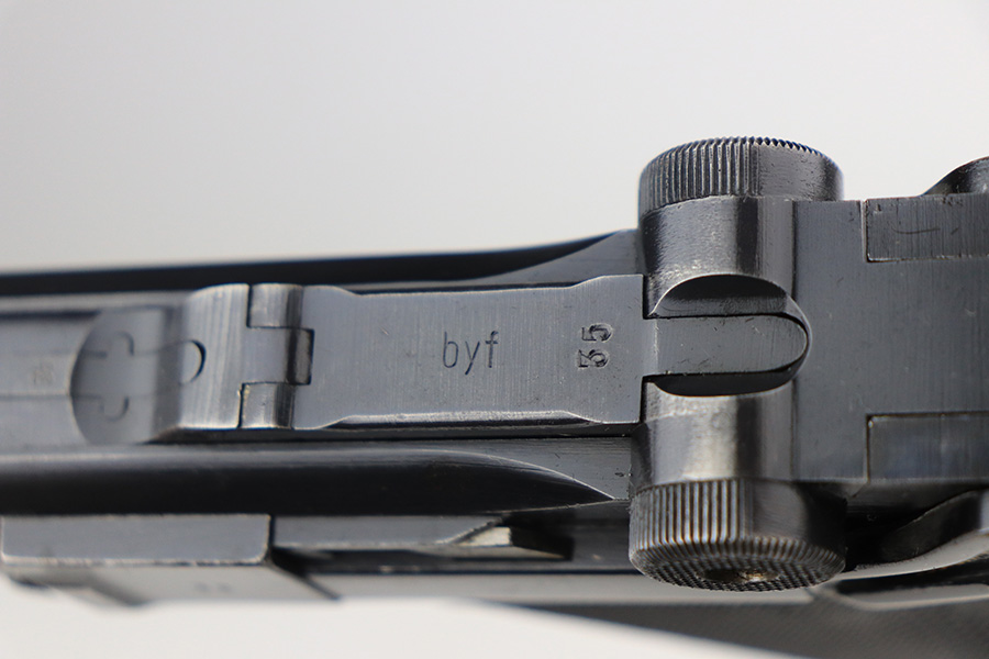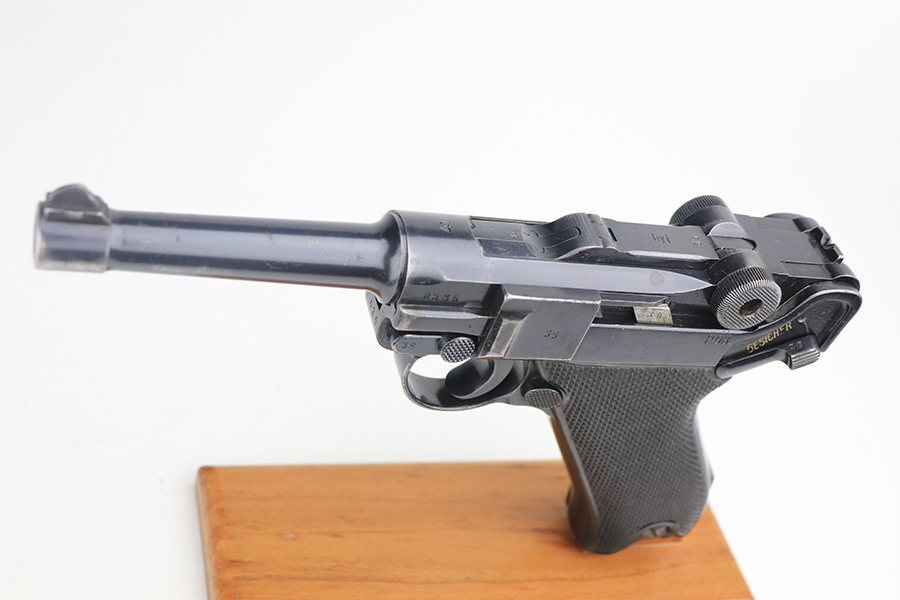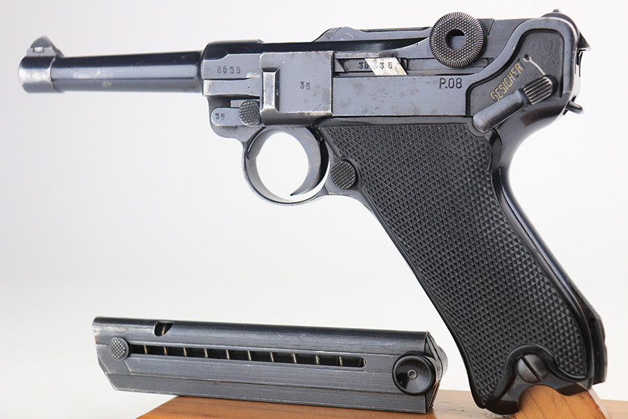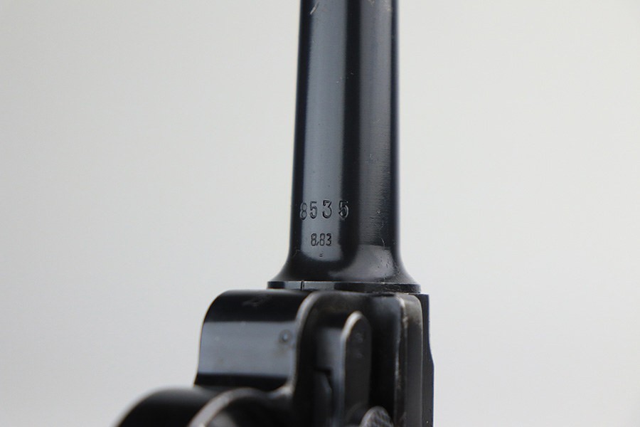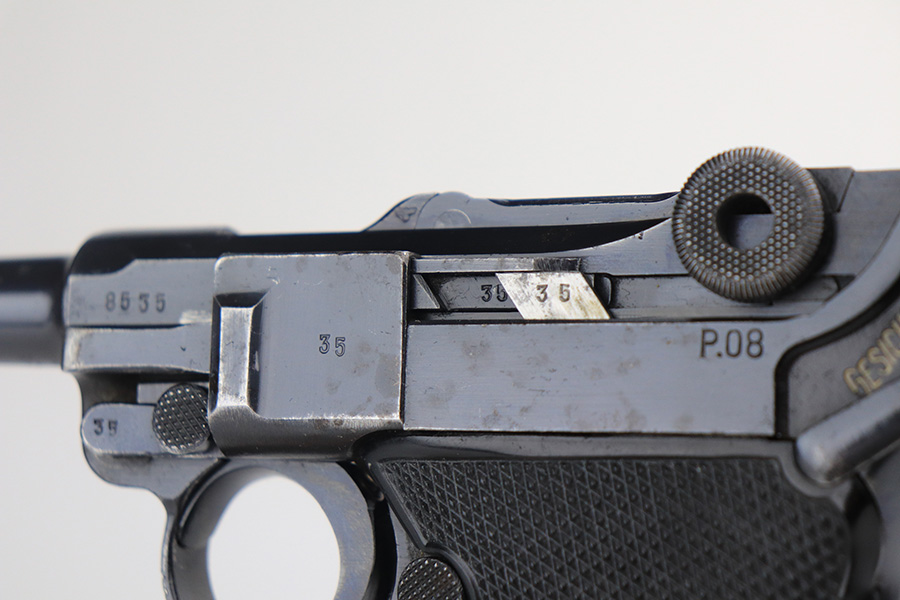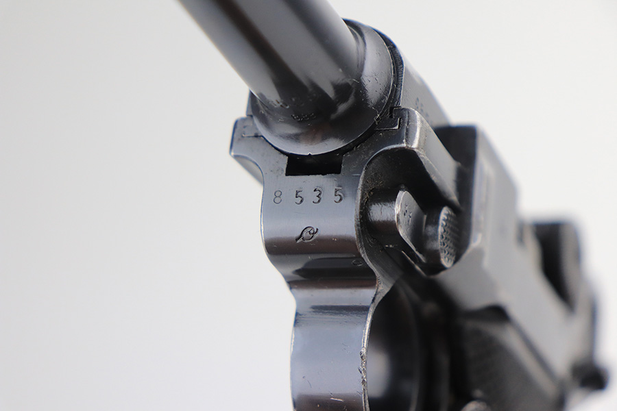12/15/21 – This is a very nice example of a “Black Widow” Mauser Luger issued to the Nazi military in 1941. It is all matching and has the proper “Eagle 655” Nazi military acceptance proofs on the right side of the slide. It comes with a set of excellent original black widow grips and one proper black widow magazine. It has retained about 92% of its original finish. There is wear around the muzzle, on the side rails, and at the base of the front strap. Very minor wear on the side plate. Spotty wear on both sides of the barrel. There is minor scratchy wear on the front strap and freckling on the back strap. Some spotty oxidation on the side plate and left side of the frame. The bore has decent rifling, but there is minor pitting in the grooves.