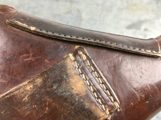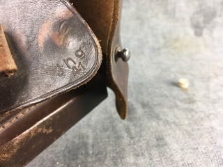 7/28/17 – This is an original WW2 era Mauser Hsc holster. The holster is dated 1941 and maker code stamped “jhg” below the closure strap. The holster has nice leather with some normal wear and light exterior scuffing that can easily be cleaned or polished if desired. The biggest issue with the holster is the missing stitching on the side flap – which the photos clearly show. The flap is still attached and completely in tact. Guaranteed original and authentic.