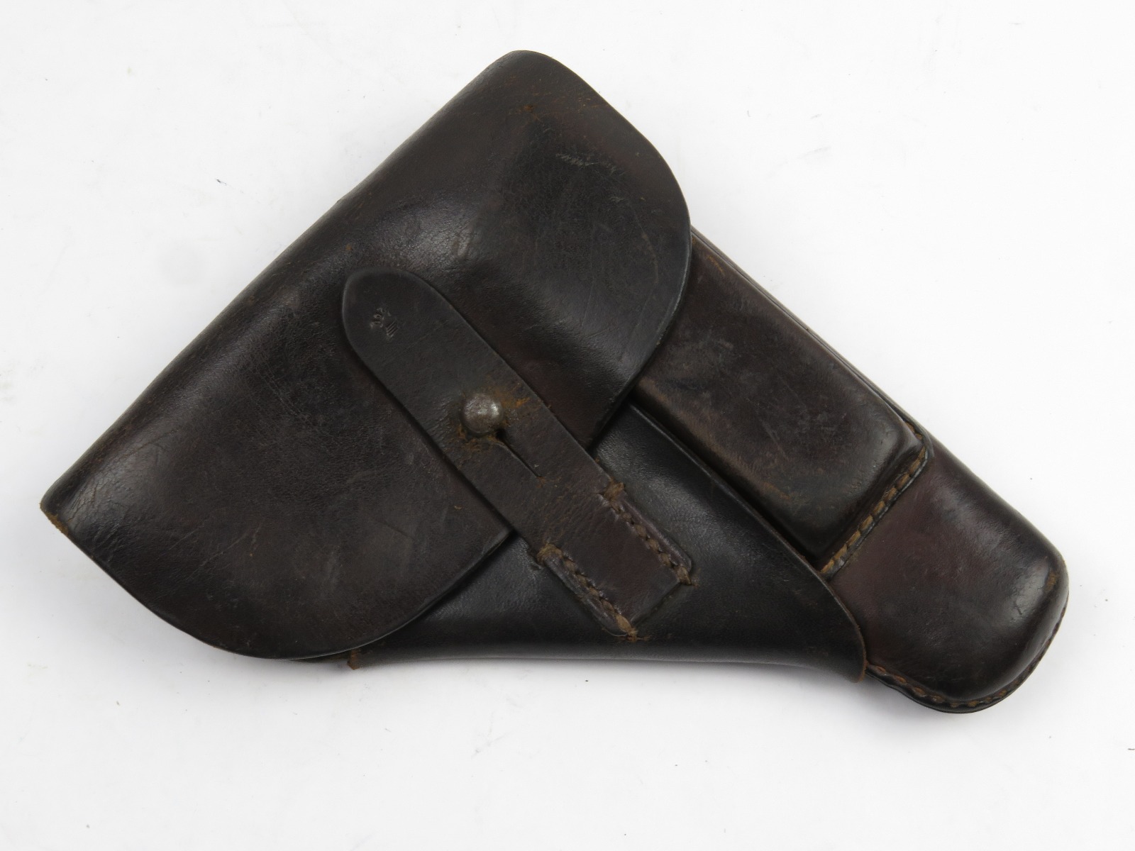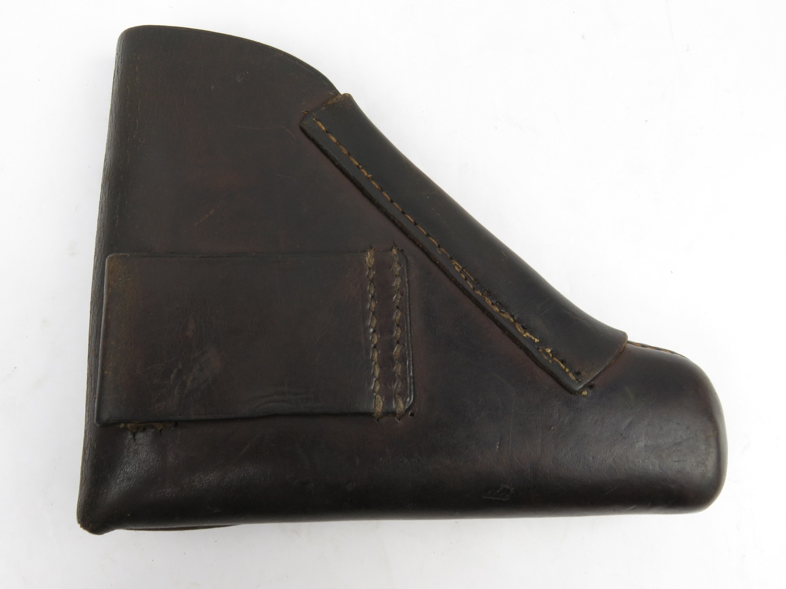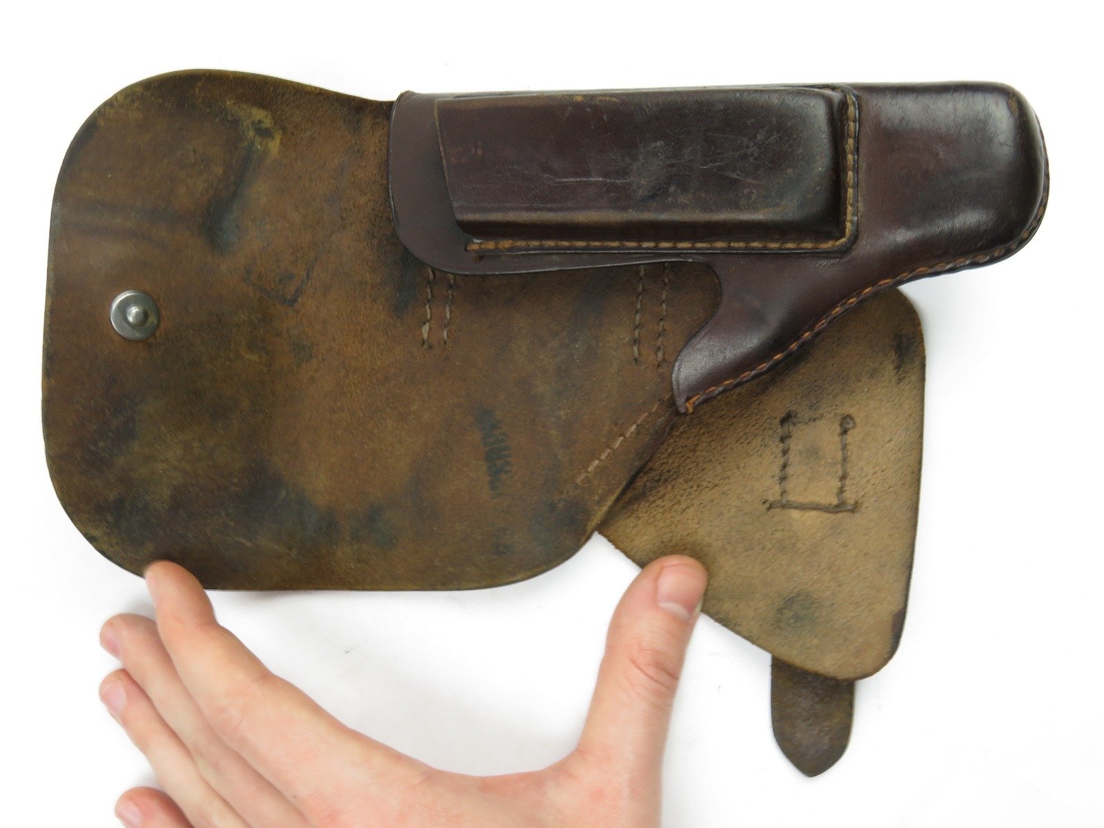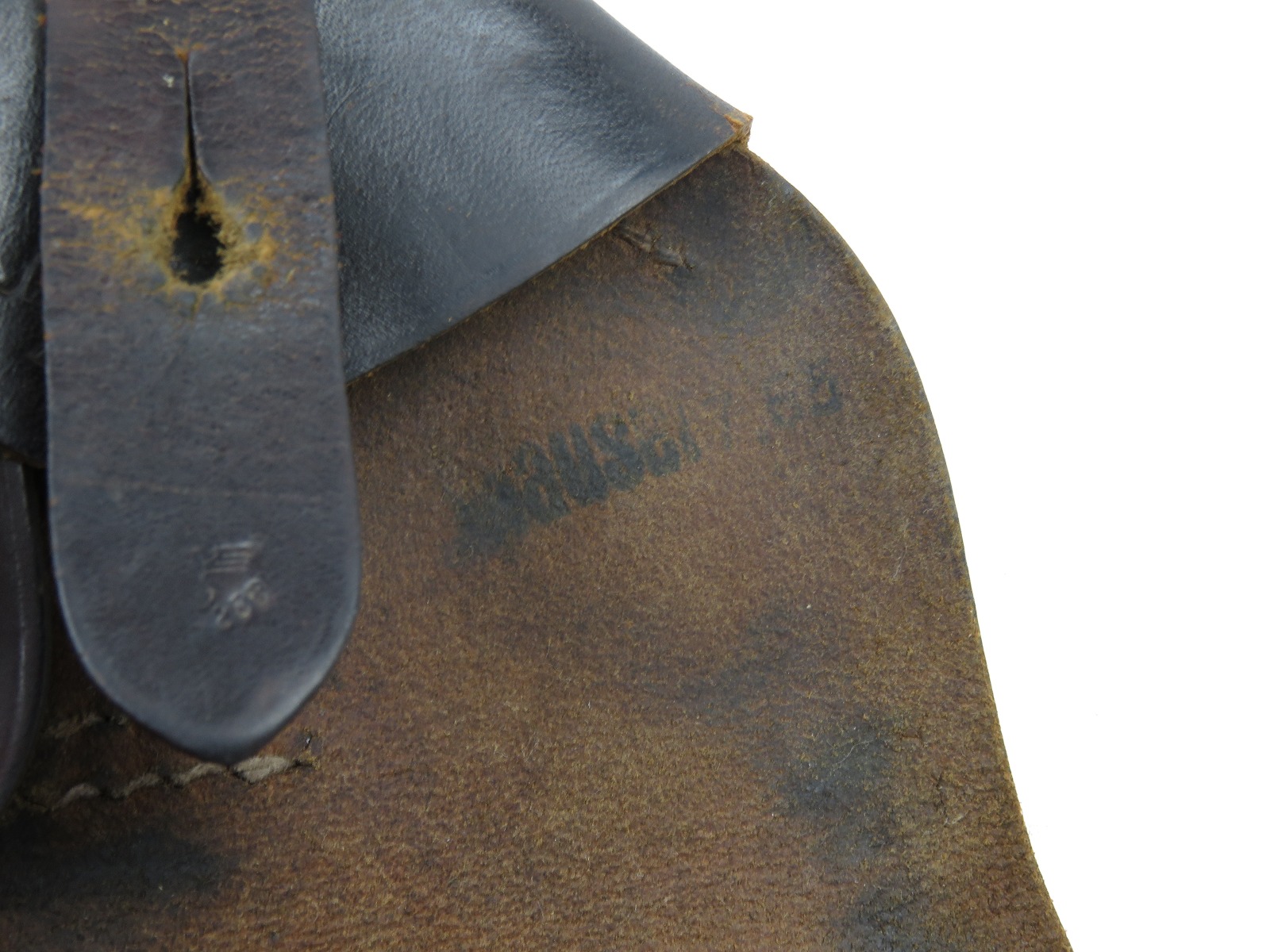 12/14/17 – This is an original waffen proofed WW2 pistol holster for the Mauser HSC or similar sized pistol. The closure strap has a waffen eagle military proof stamp. Under the closure strap is a “jhg” maker code and 1941 date stamp. The interior leather also has a light ink stamp that reads “Mauser 7,65”. The leather is in great condition with some normal aging and use wear. The stitching is all original and in tact.