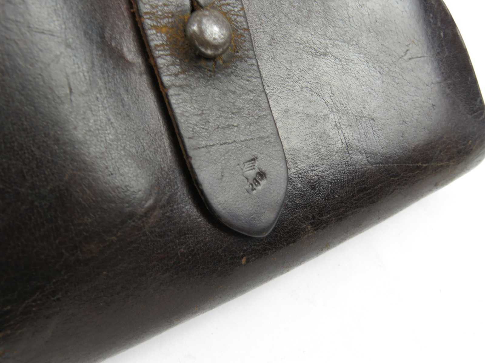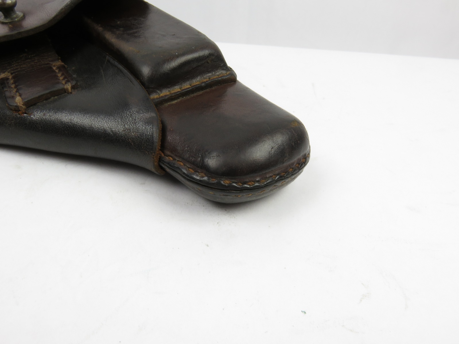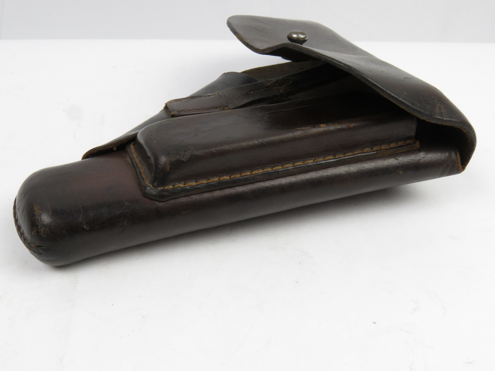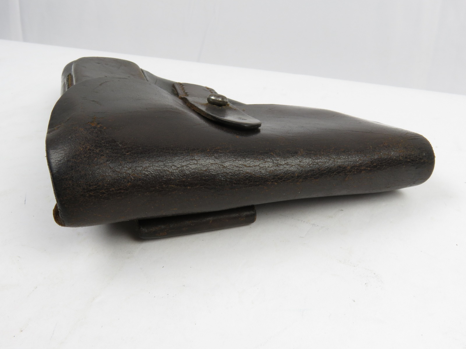 12/14/17 – This is an original waffen proofed WW2 pistol holster for the Mauser HSC or similar sized pistol. The closure strap has a waffen eagle military proof stamp. Under the closure strap is a “jhg” maker code and 1941 date stamp. The interior leather also has a light ink stamp that reads “Mauser 7,65”. The leather is in great condition with some normal aging and use wear. The stitching is all original and in tact.