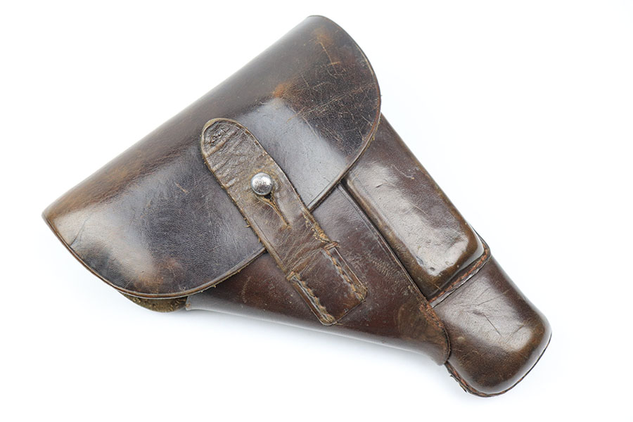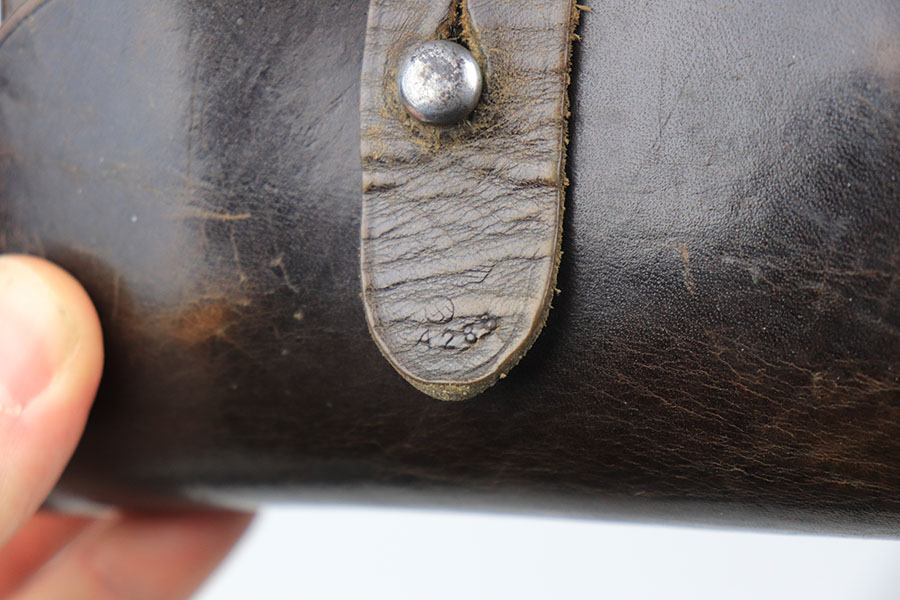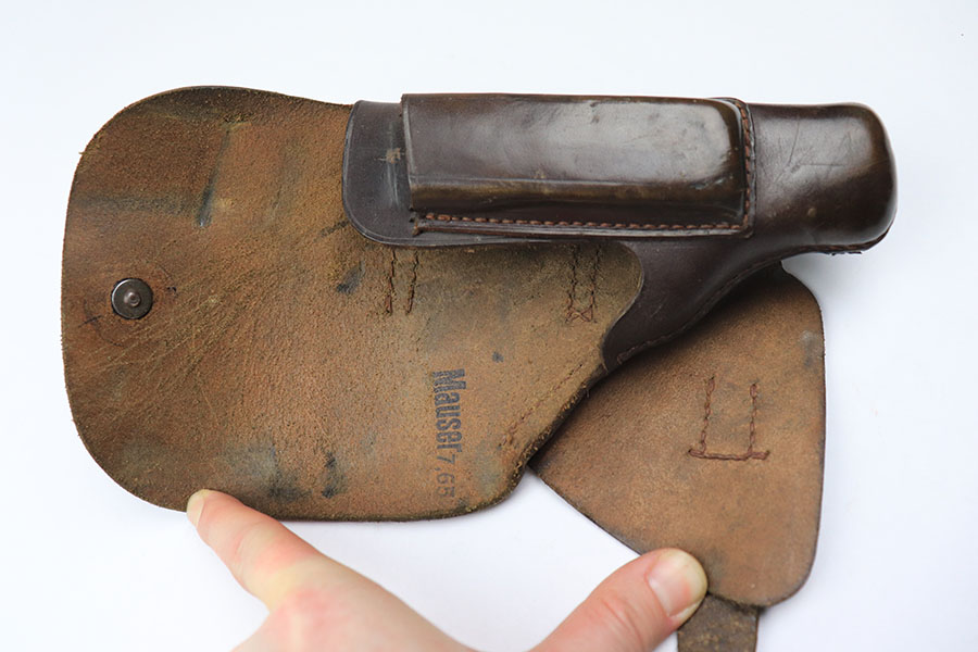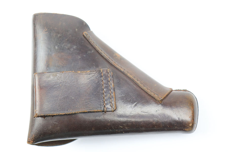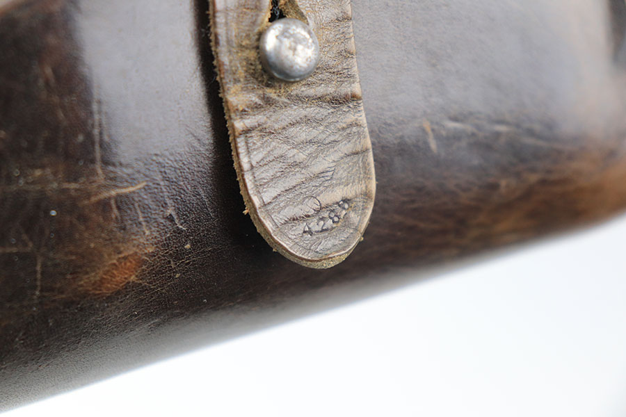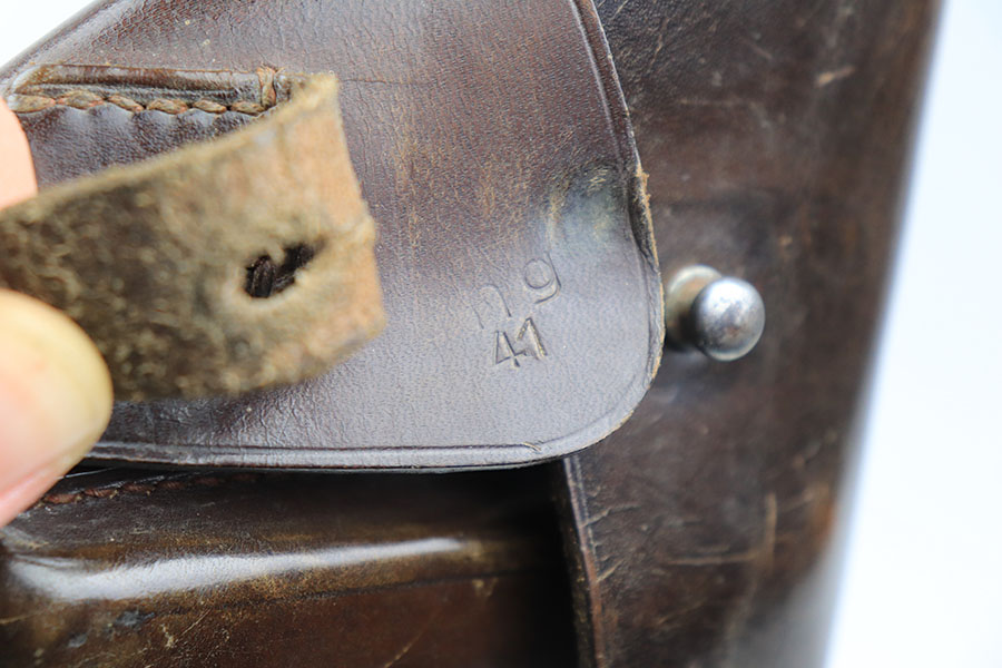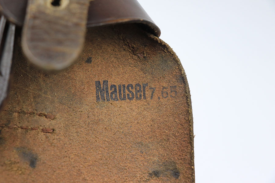 11/23/21 – This is an excellent, textbook example of a 1941 dated Mauser HSc holster. The holster is very well marked, with a waffen stamp on the closure strap, maker stamp and date under the closure strap, and a Mauser 7.65mm ink stamp on the interior leather. The brown leather is in great overall condition with typical signs of previous use and aging. The stitching is all original and in tact.