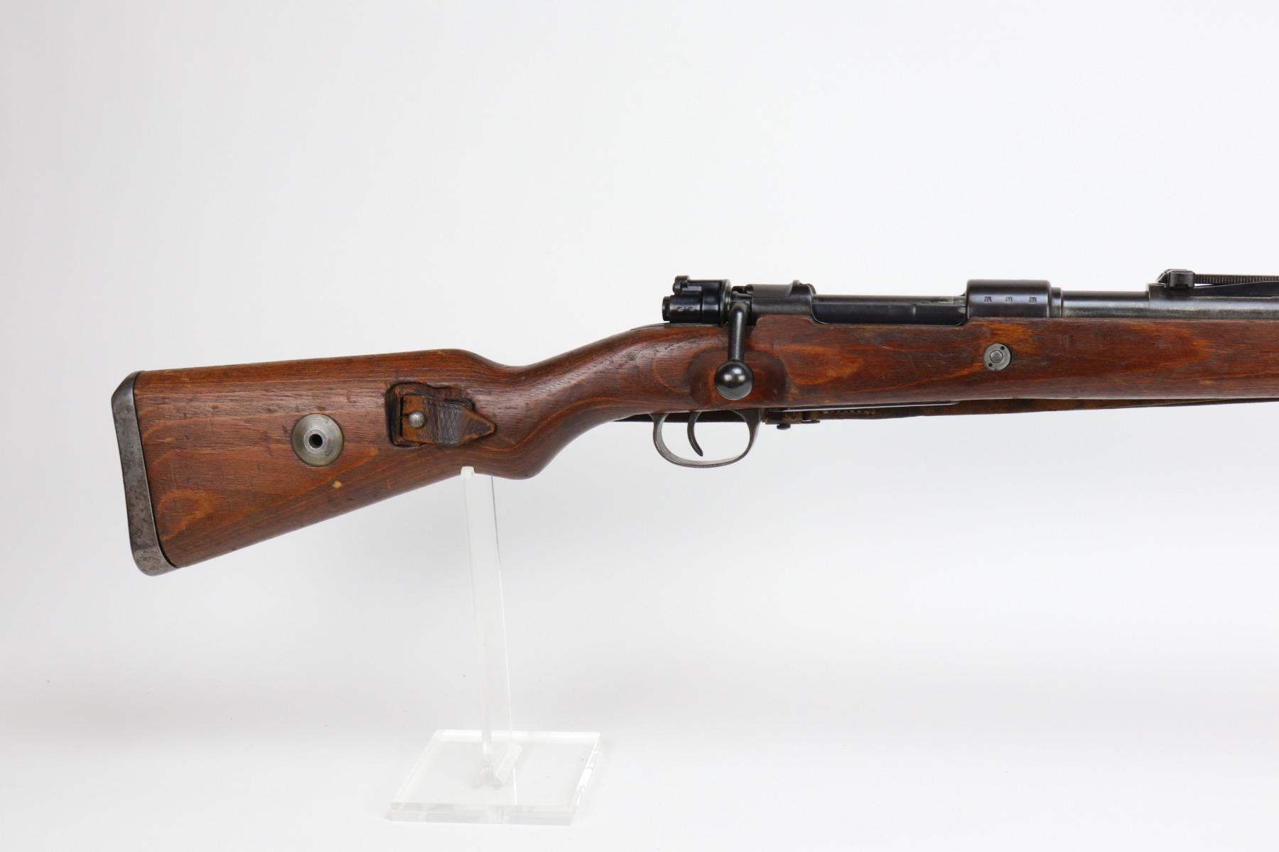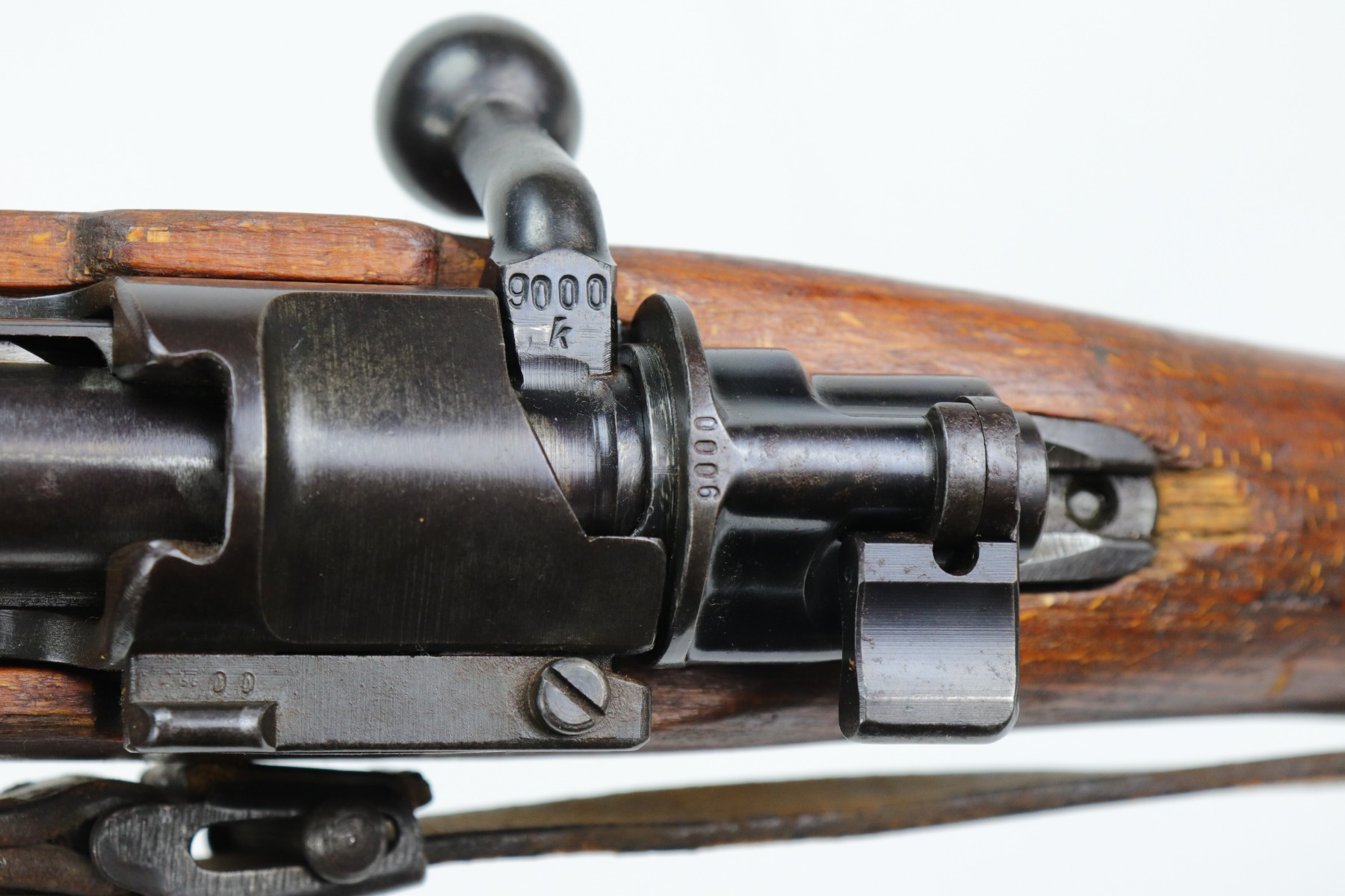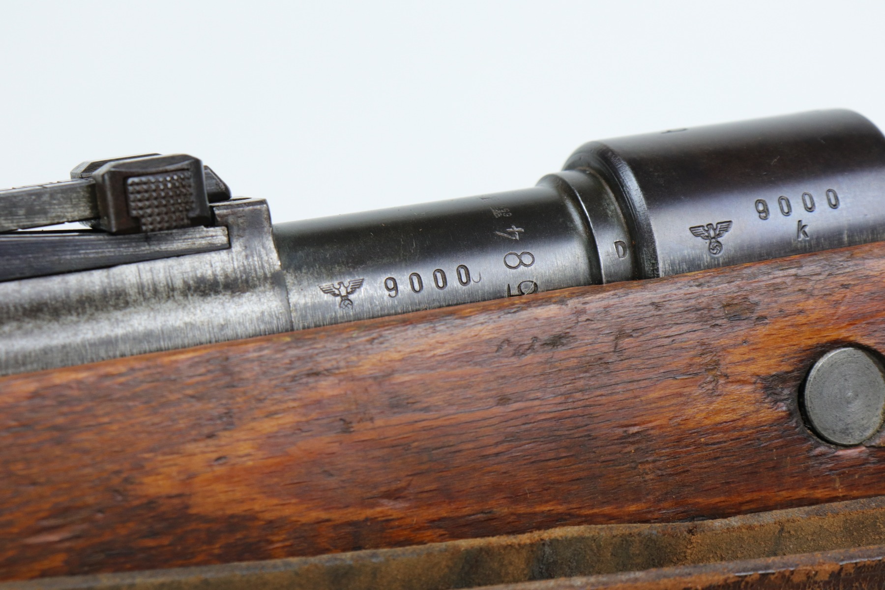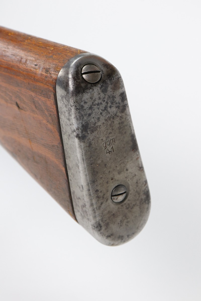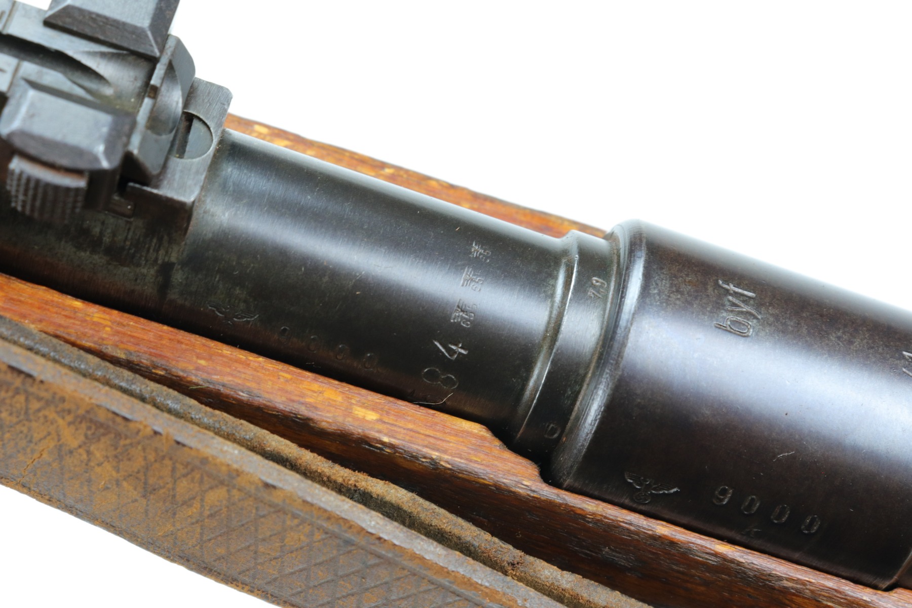 1/6/21 – This is an excellent example of a Mauser K98 rifle issued to the Nazi military in 1941. The gun is completely matching except for the barrel bands and safety lever, which are un-numbered. It is possible they were replaced at some point. There are waffen proofs throughout. The metal parts have retained most of their finish, but there is spotty oxidation throughout. The stock is very nice and has visible waffen proofs – there are a couple of light cracks and small chip behind the action. The gun comes with a sight hood, cleaning rod, and sling. The bore is shiny with strong rifling, just a bit of pin-pricking in the grooves.