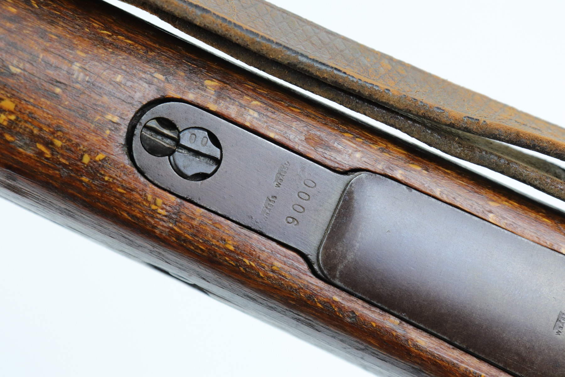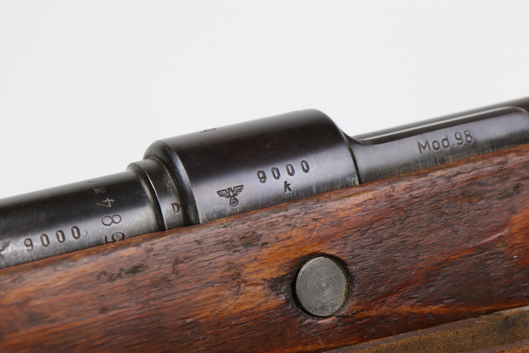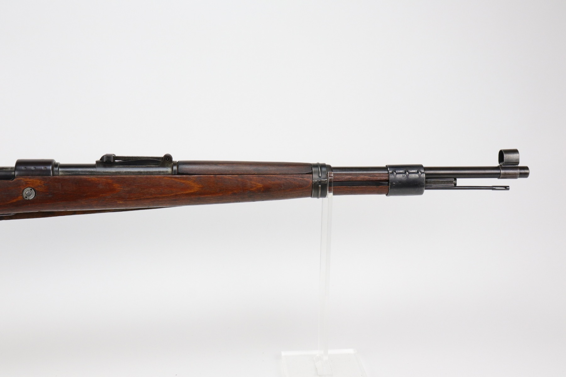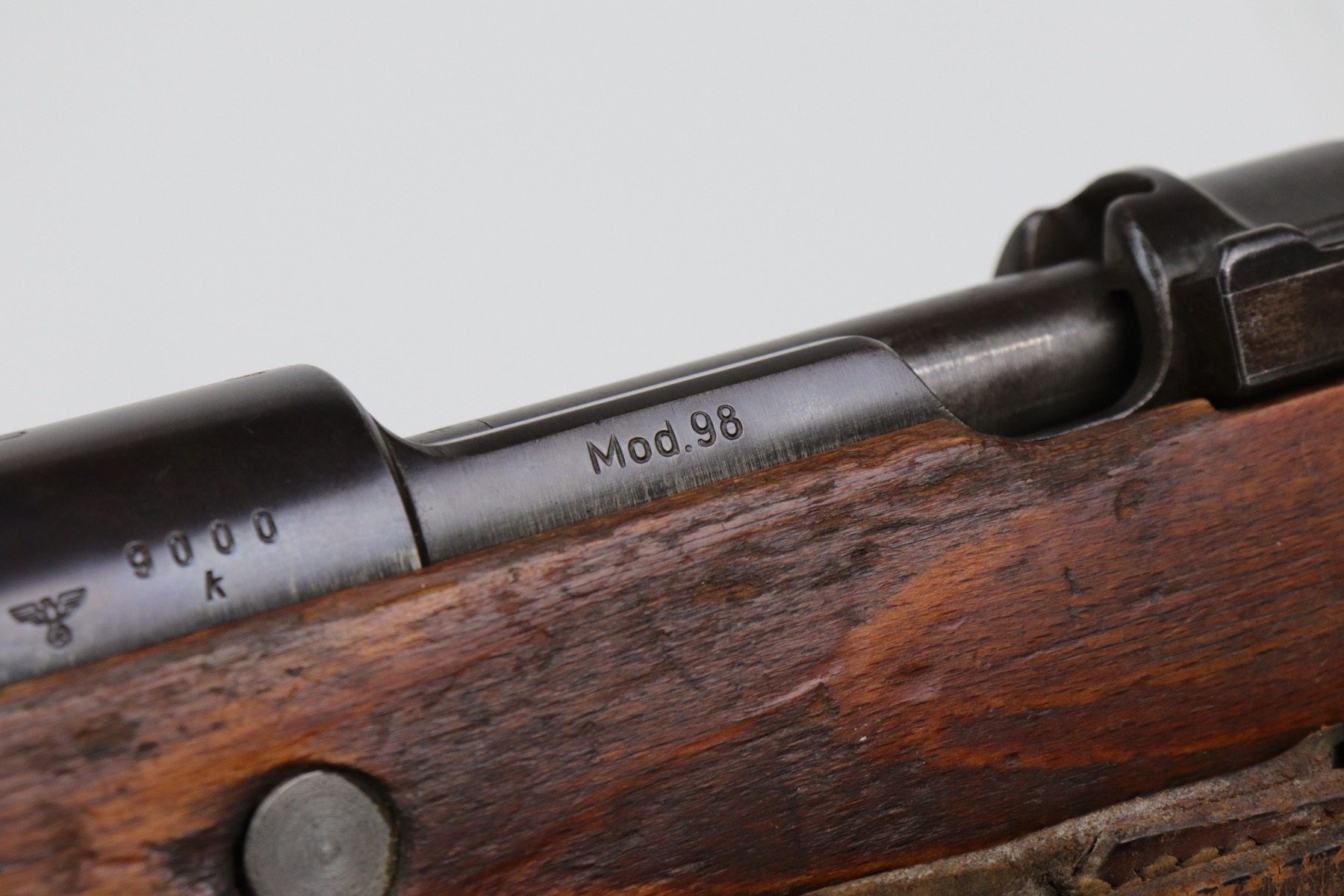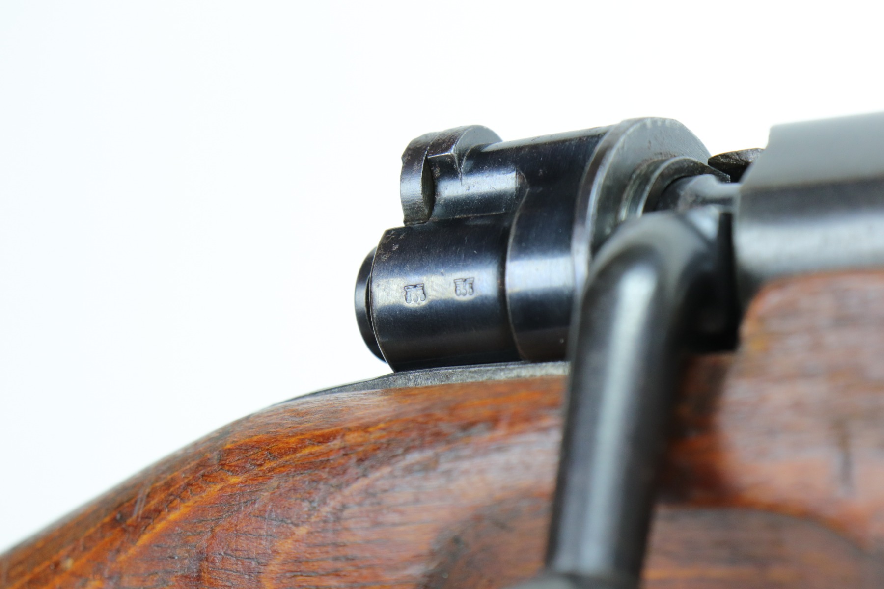 1/6/21 – This is an excellent example of a Mauser K98 rifle issued to the Nazi military in 1941. The gun is completely matching except for the barrel bands and safety lever, which are un-numbered. It is possible they were replaced at some point. There are waffen proofs throughout. The metal parts have retained most of their finish, but there is spotty oxidation throughout. The stock is very nice and has visible waffen proofs – there are a couple of light cracks and small chip behind the action. The gun comes with a sight hood, cleaning rod, and sling. The bore is shiny with strong rifling, just a bit of pin-pricking in the grooves.