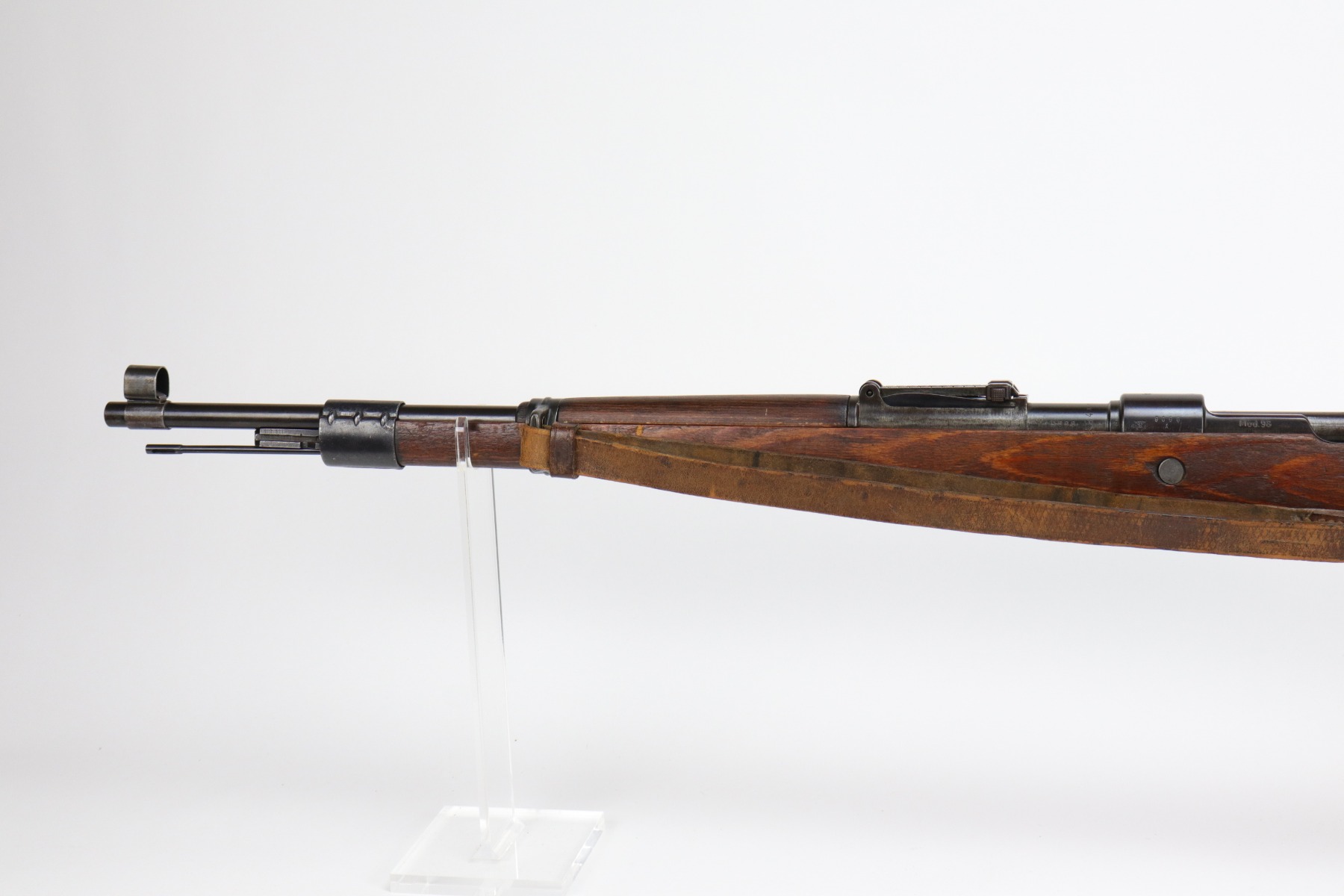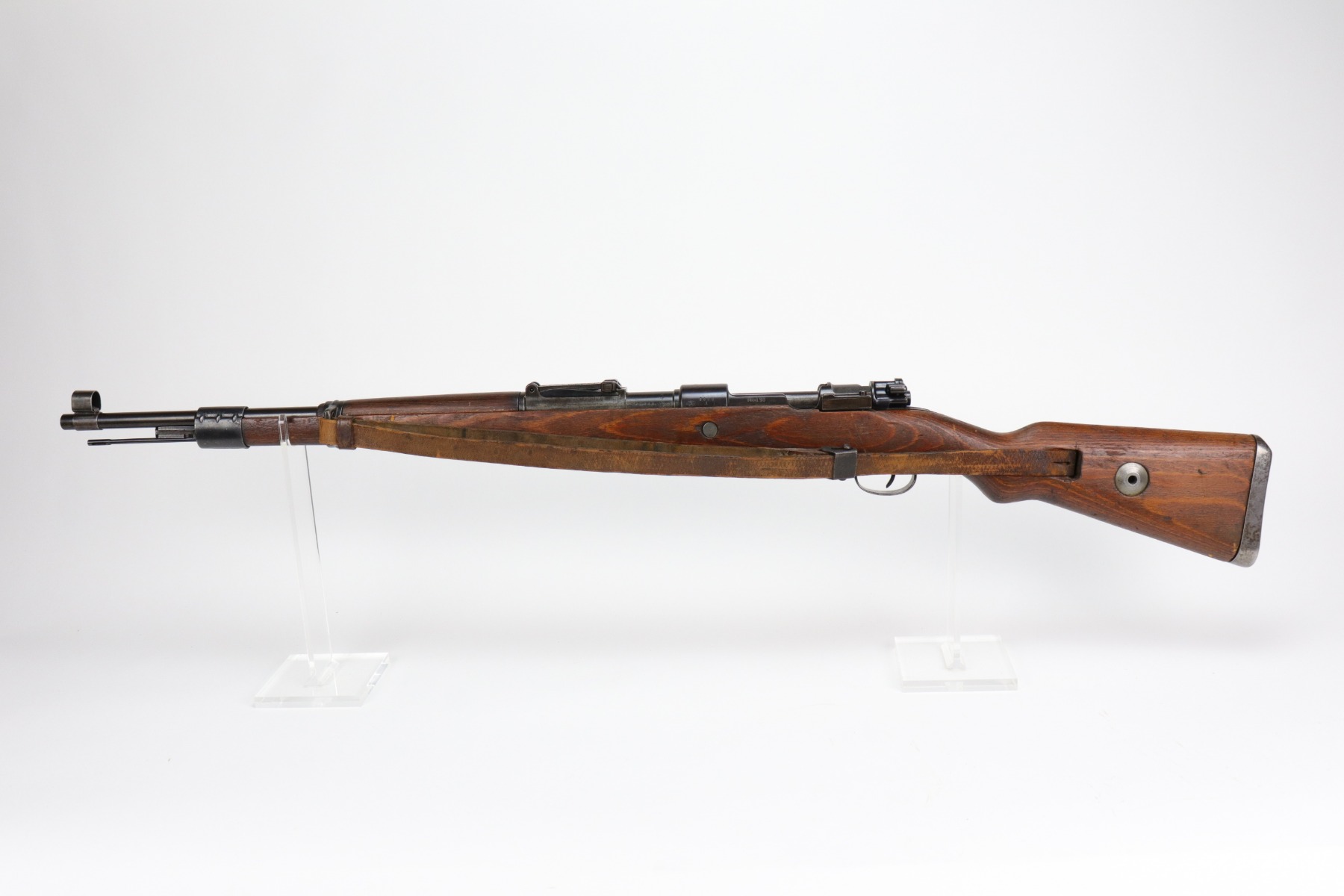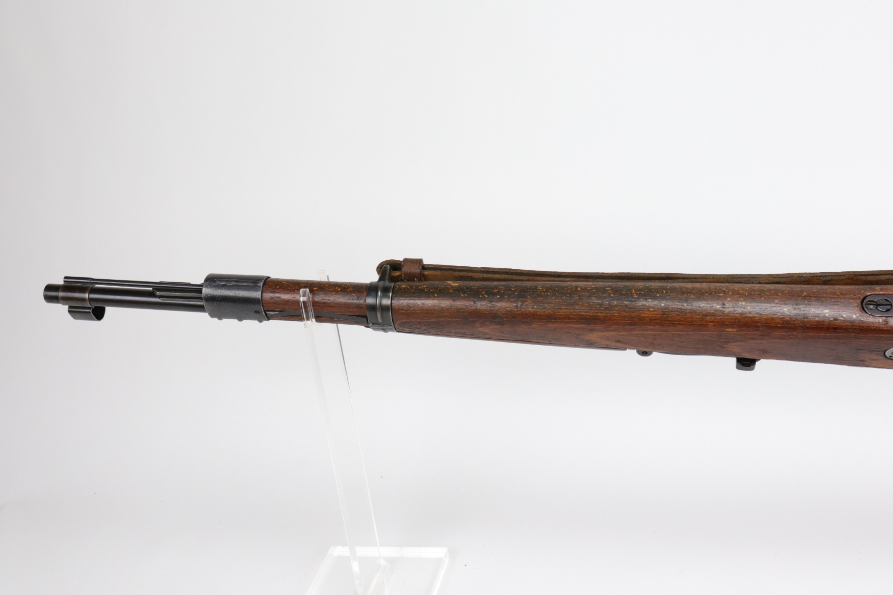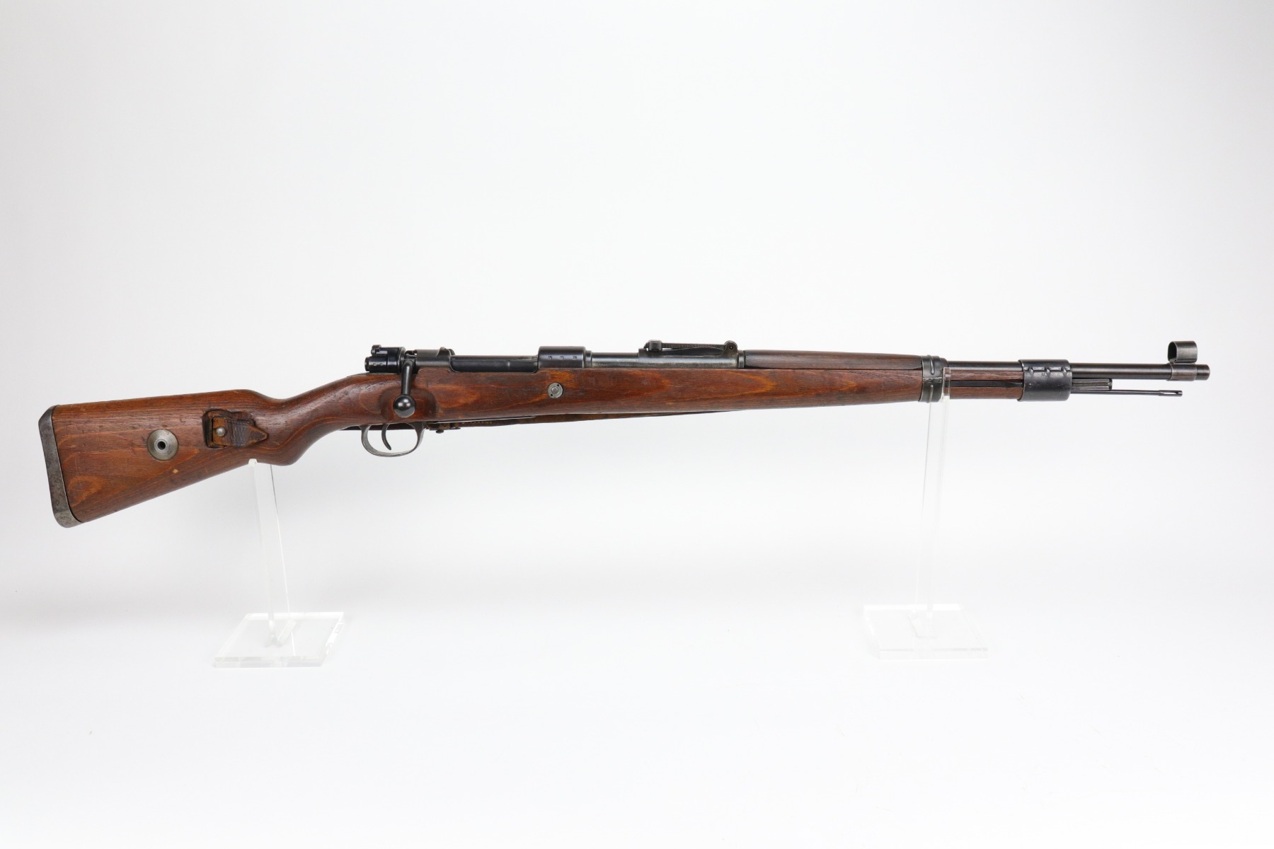 1/6/21 – This is an excellent example of a Mauser K98 rifle issued to the Nazi military in 1941. The gun is completely matching except for the barrel bands and safety lever, which are un-numbered. It is possible they were replaced at some point. There are waffen proofs throughout. The metal parts have retained most of their finish, but there is spotty oxidation throughout. The stock is very nice and has visible waffen proofs – there are a couple of light cracks and small chip behind the action. The gun comes with a sight hood, cleaning rod, and sling. The bore is shiny with strong rifling, just a bit of pin-pricking in the grooves.