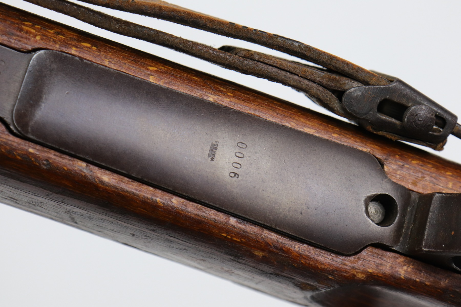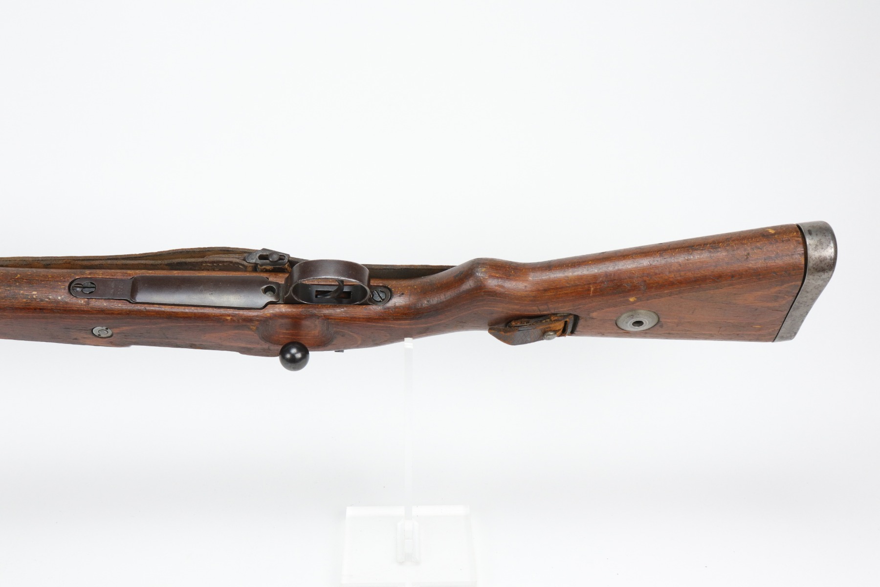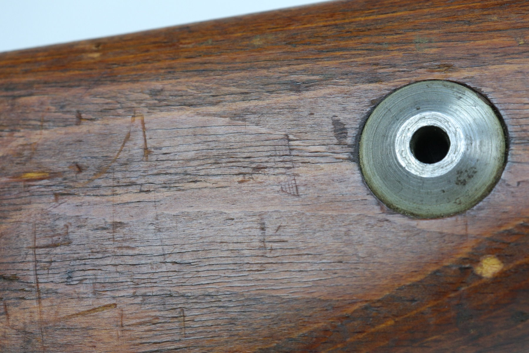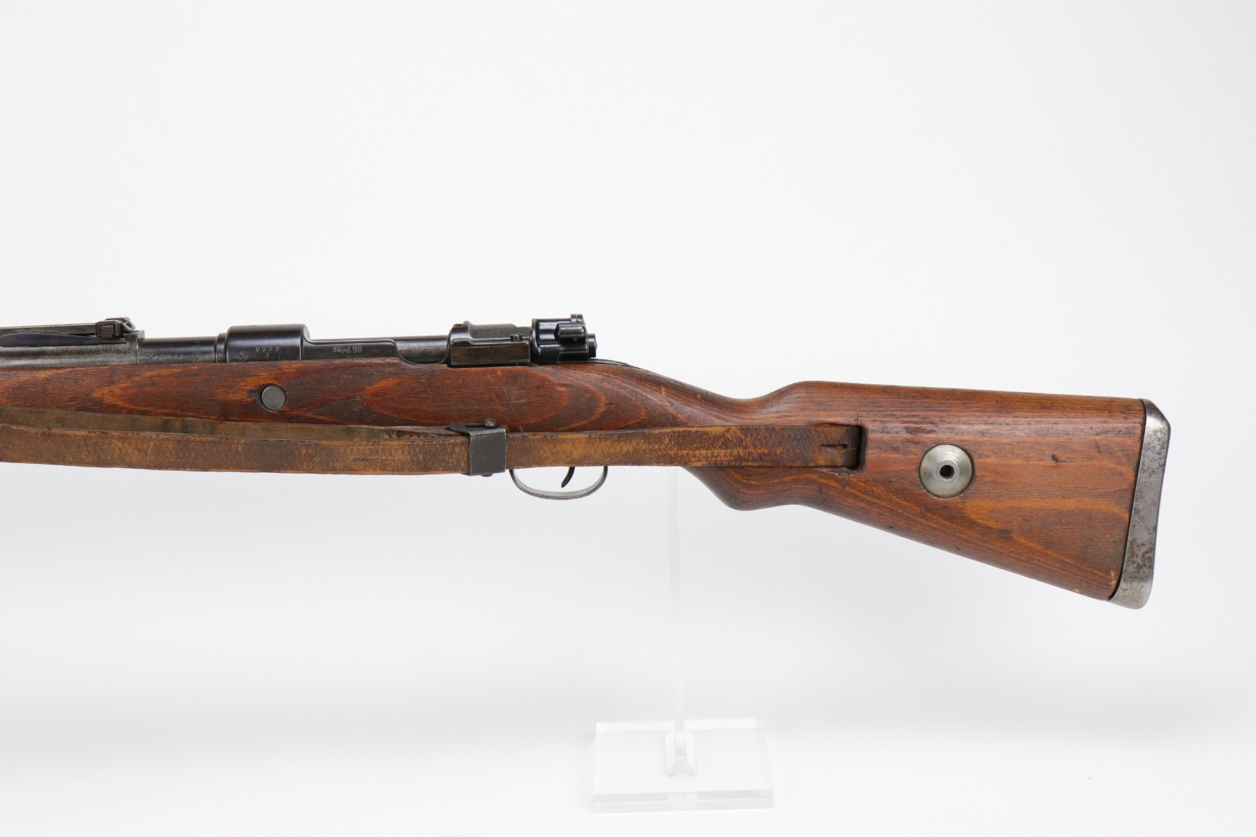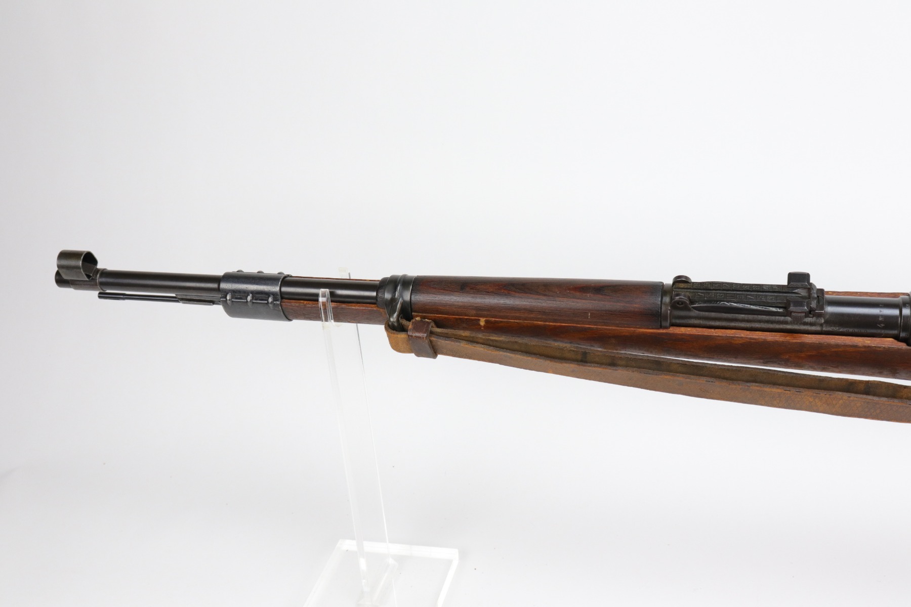 1/6/21 – This is an excellent example of a Mauser K98 rifle issued to the Nazi military in 1941. The gun is completely matching except for the barrel bands and safety lever, which are un-numbered. It is possible they were replaced at some point. There are waffen proofs throughout. The metal parts have retained most of their finish, but there is spotty oxidation throughout. The stock is very nice and has visible waffen proofs – there are a couple of light cracks and small chip behind the action. The gun comes with a sight hood, cleaning rod, and sling. The bore is shiny with strong rifling, just a bit of pin-pricking in the grooves.