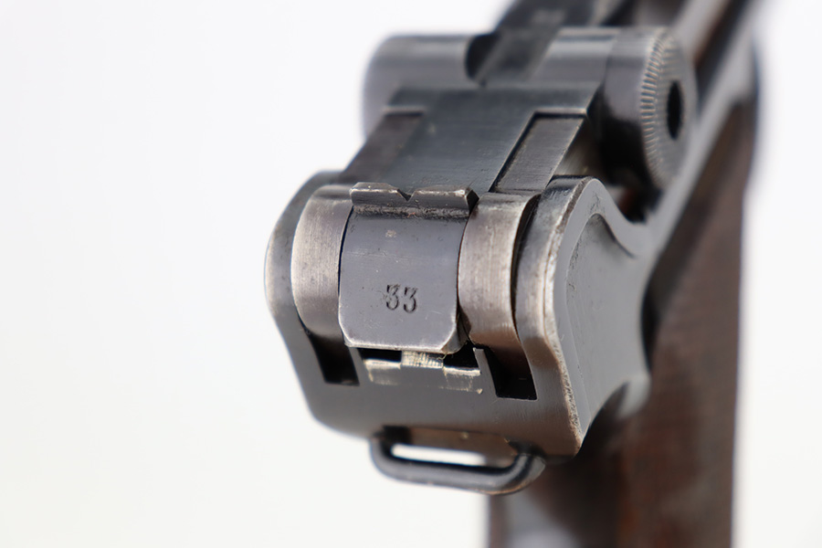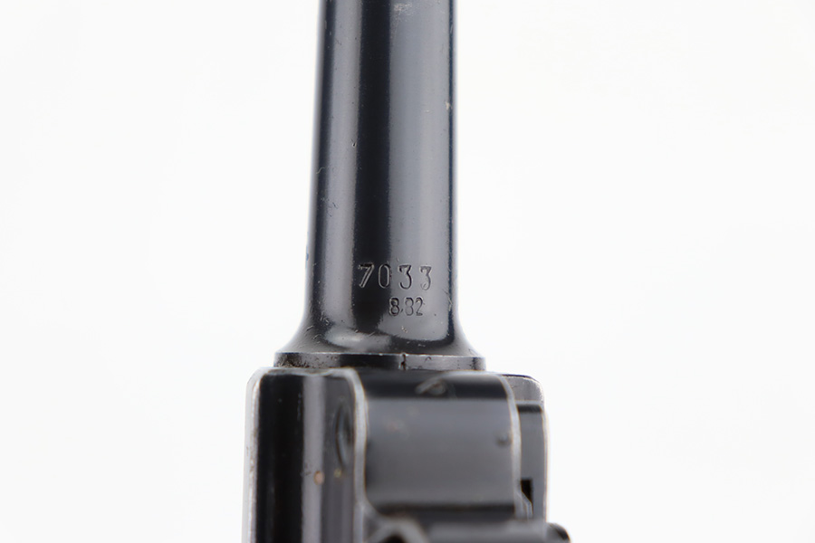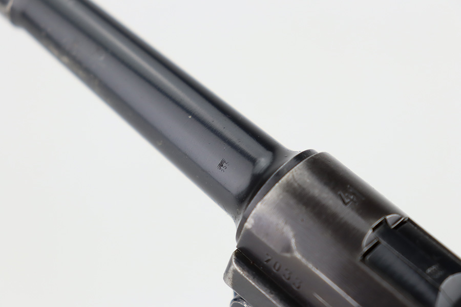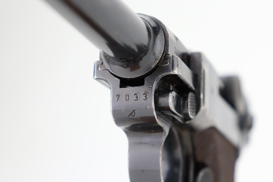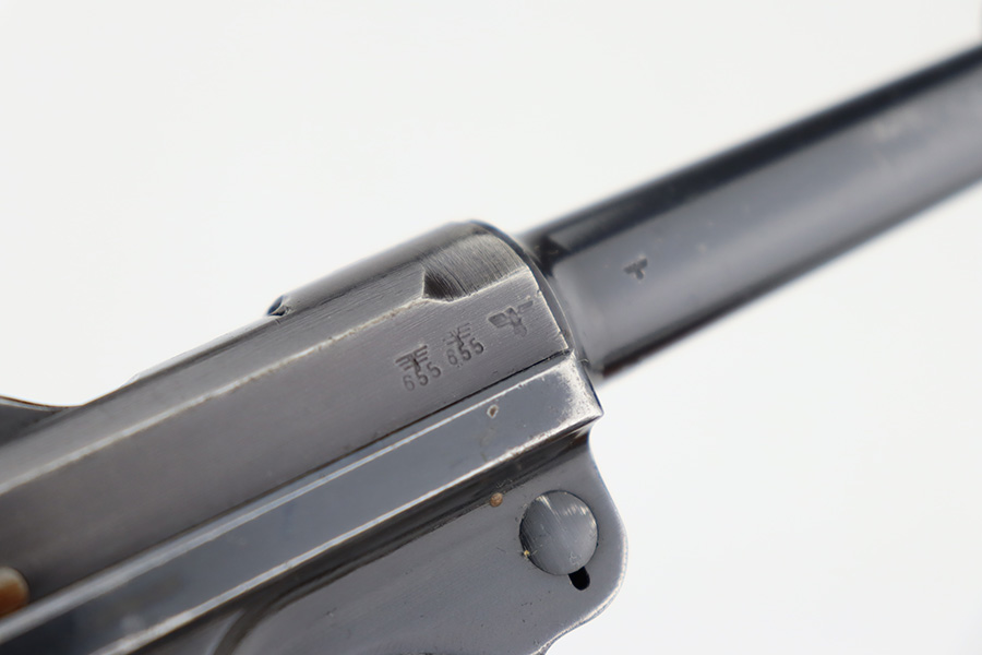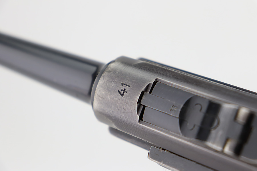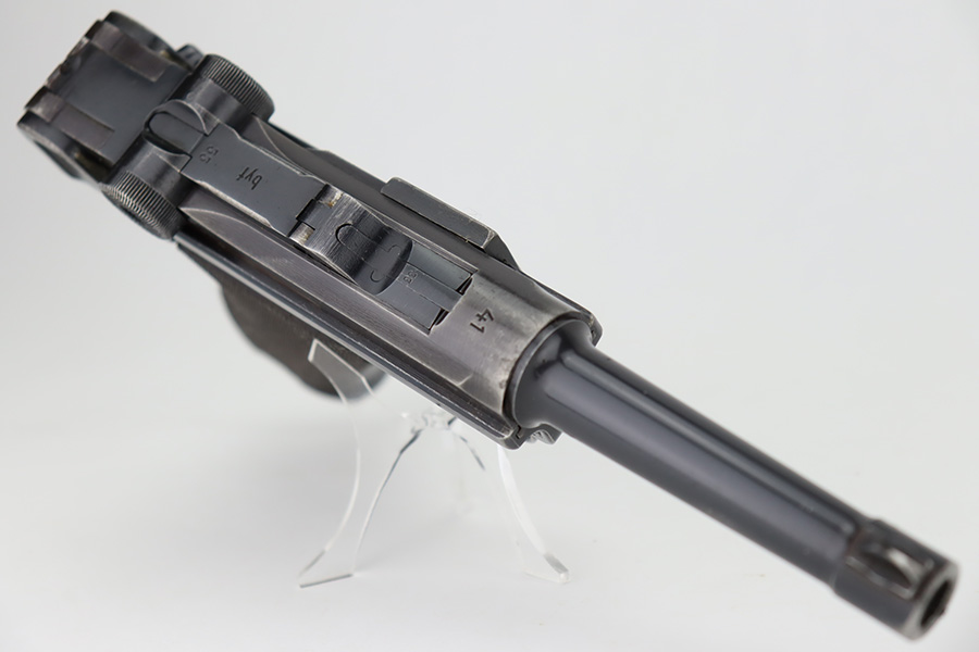 12/6/23 – This is a nice BYF 41 Mauser Luger issued to the German military in 1941. All matching with the proper “Eagle 655” military acceptance proofs. The original finish rates about 92% with areas of wear around the muzzle, on the barrel, on the side plate, and on the high edges. Some tiny handling marks on the grip straps. Fitted with matching-numbered and “Eagle 655” proofed wood grips – small chip in the upper corner of the left side. Comes with a period-correct “black widow” magazine. The bore has strong rifling, but there is spotty freckling throughout.