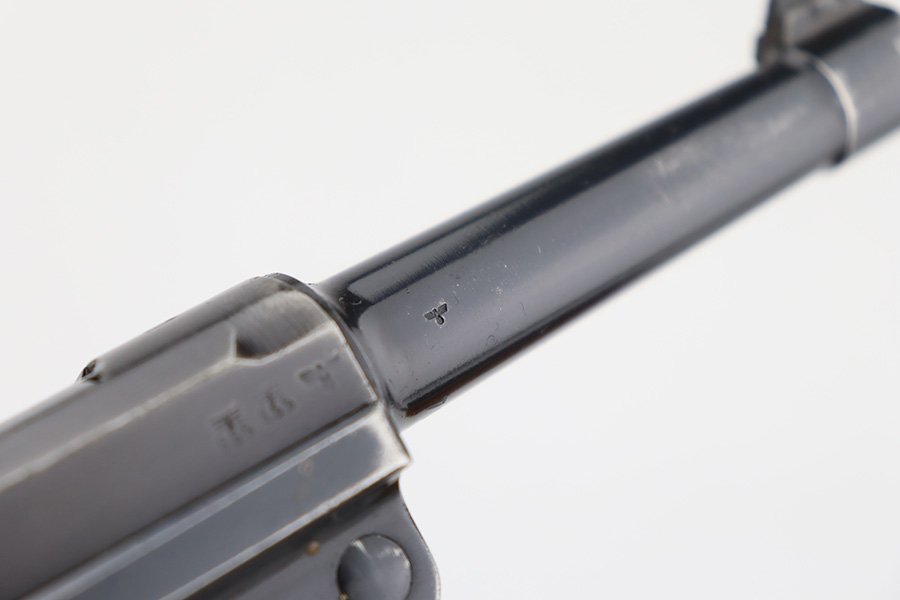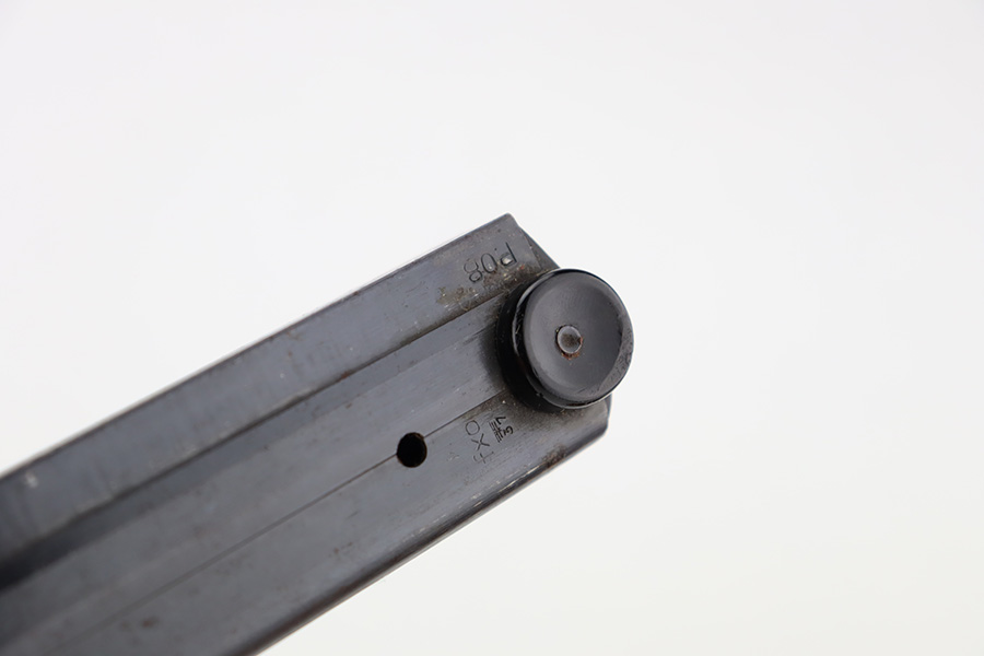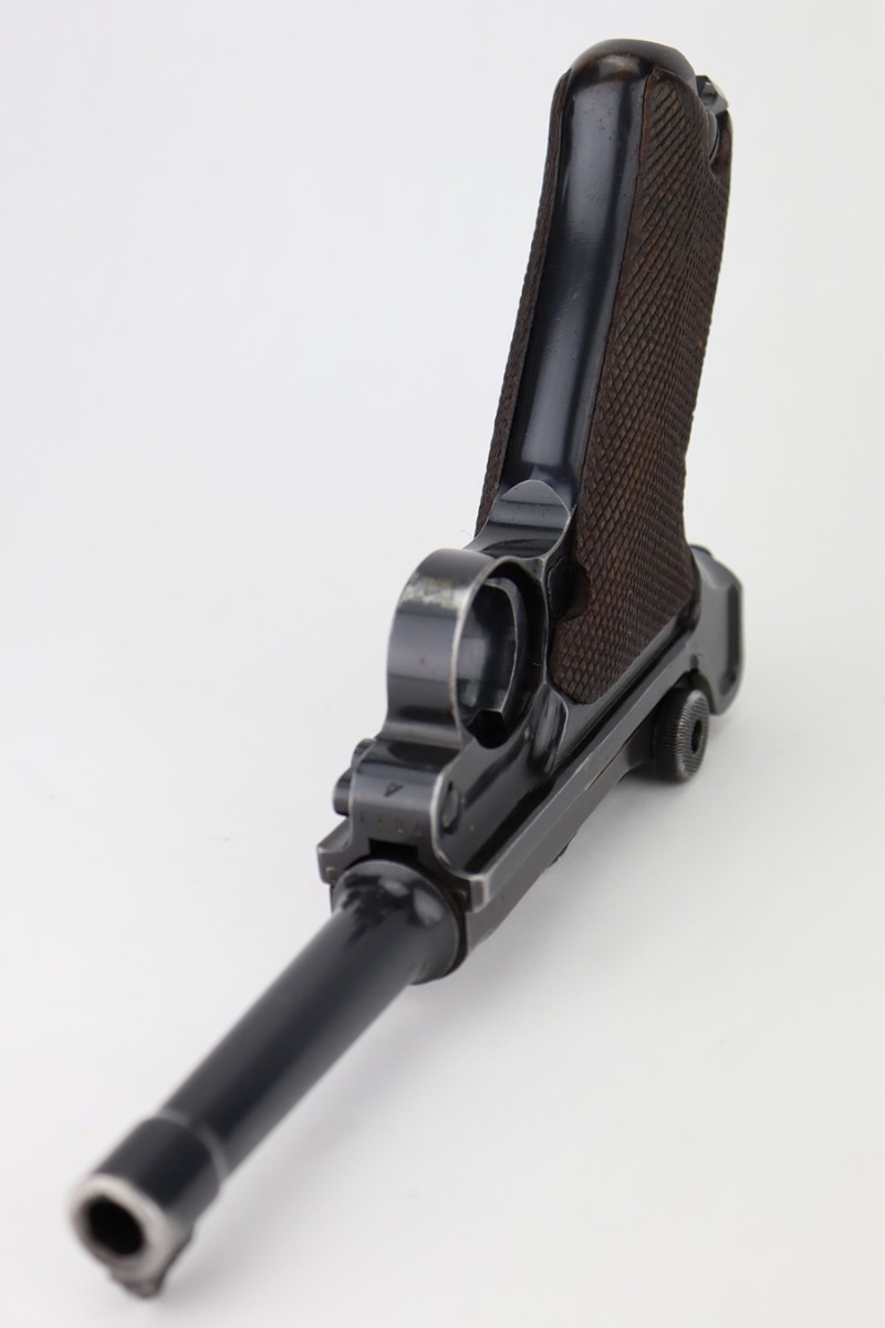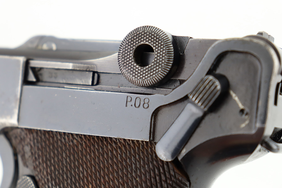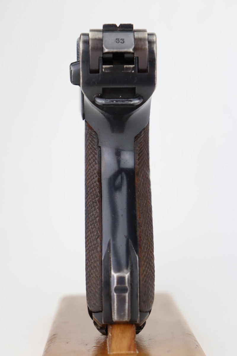 12/6/23 – This is a nice BYF 41 Mauser Luger issued to the German military in 1941. All matching with the proper “Eagle 655” military acceptance proofs. The original finish rates about 92% with areas of wear around the muzzle, on the barrel, on the side plate, and on the high edges. Some tiny handling marks on the grip straps. Fitted with matching-numbered and “Eagle 655” proofed wood grips – small chip in the upper corner of the left side. Comes with a period-correct “black widow” magazine. The bore has strong rifling, but there is spotty freckling throughout.