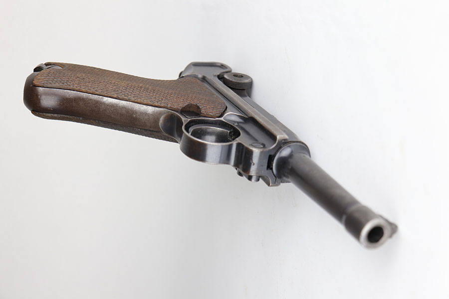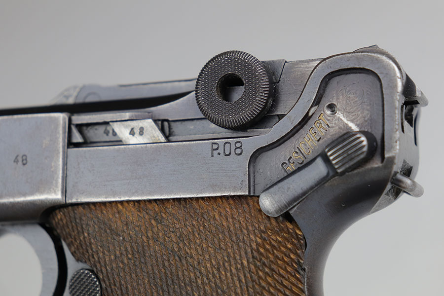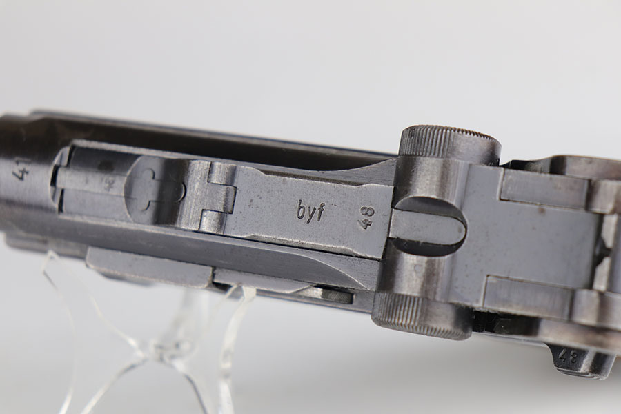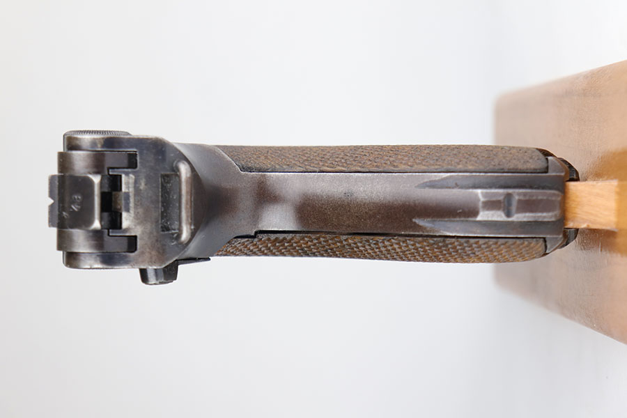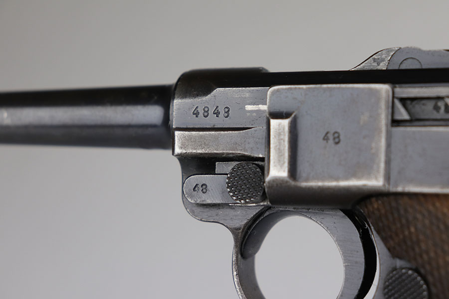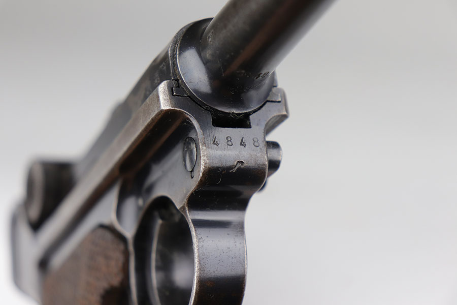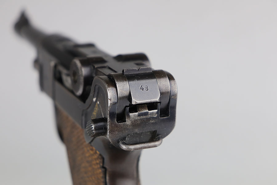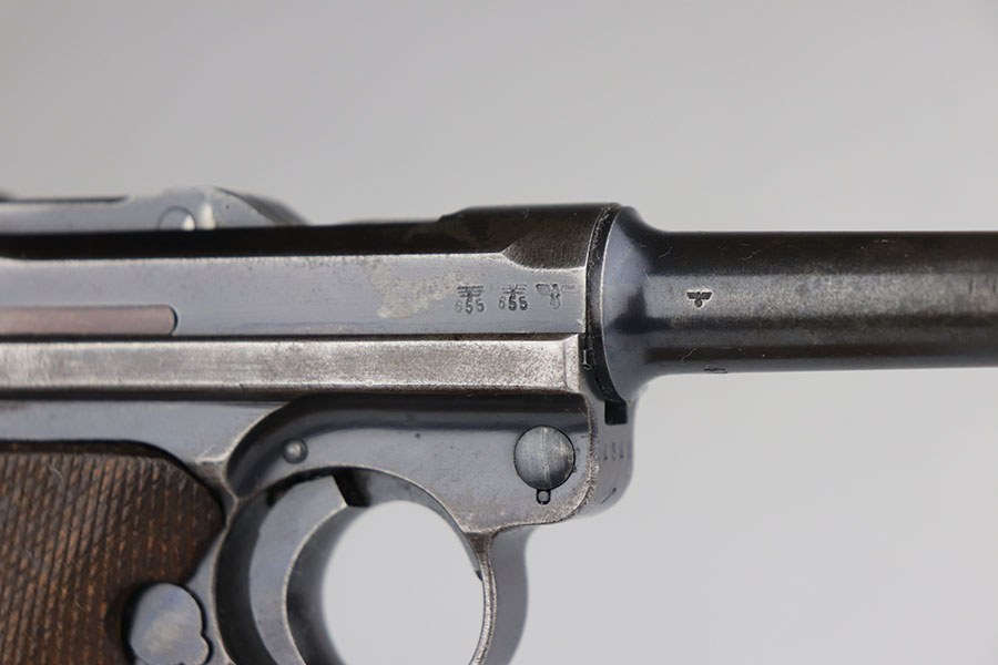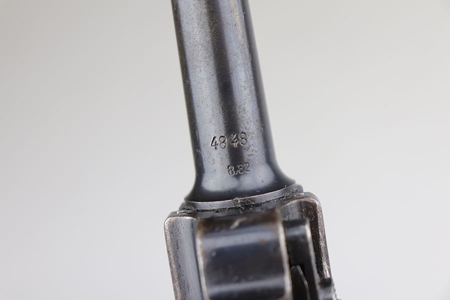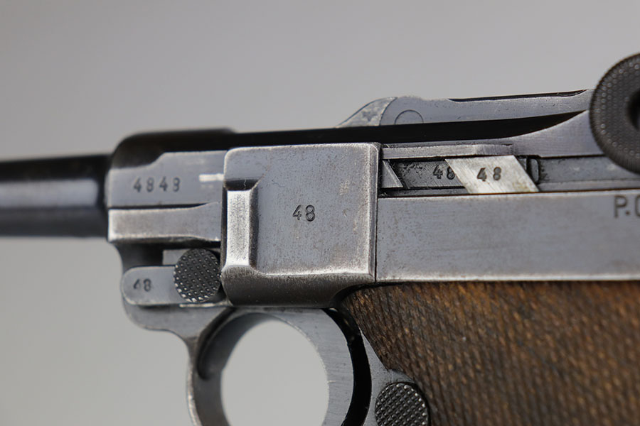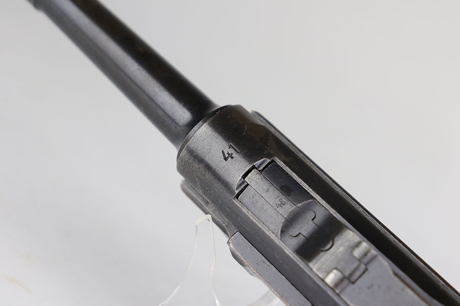 6/30/20 – This is a matching and original military Mauser Luger from 1941, including one of the factory numbered magazines. The pistol shows honest wear and patina throughout, though it is most pronounced on the straps and right side of barrel and rail. Grips are in very good condition and unmarked, with common chip under safety. Magazine is numbered and matching to the pistol. Bore is shiny with good rifling but does have some minor frost throughout.