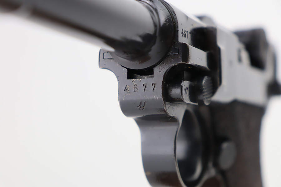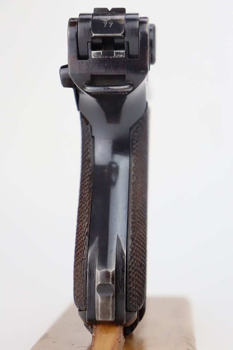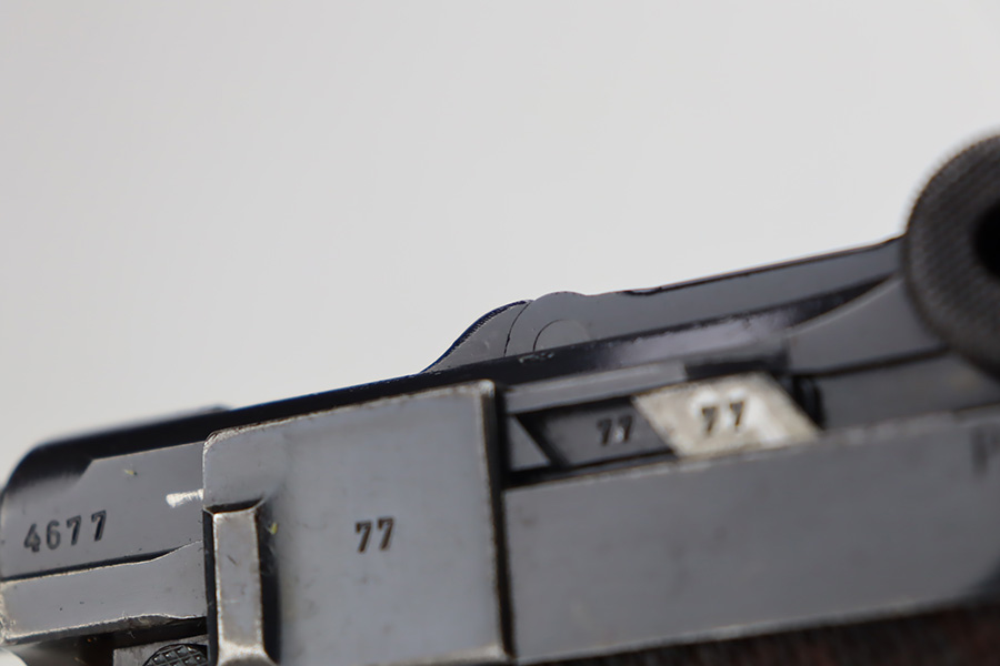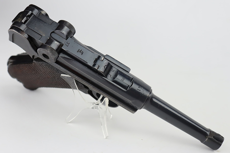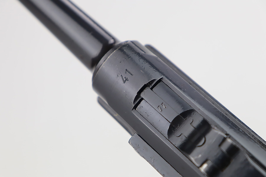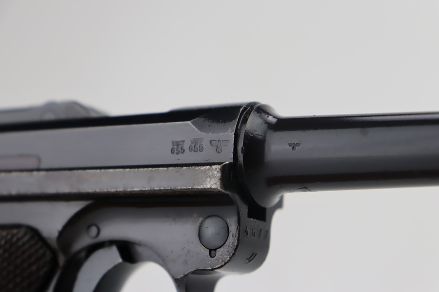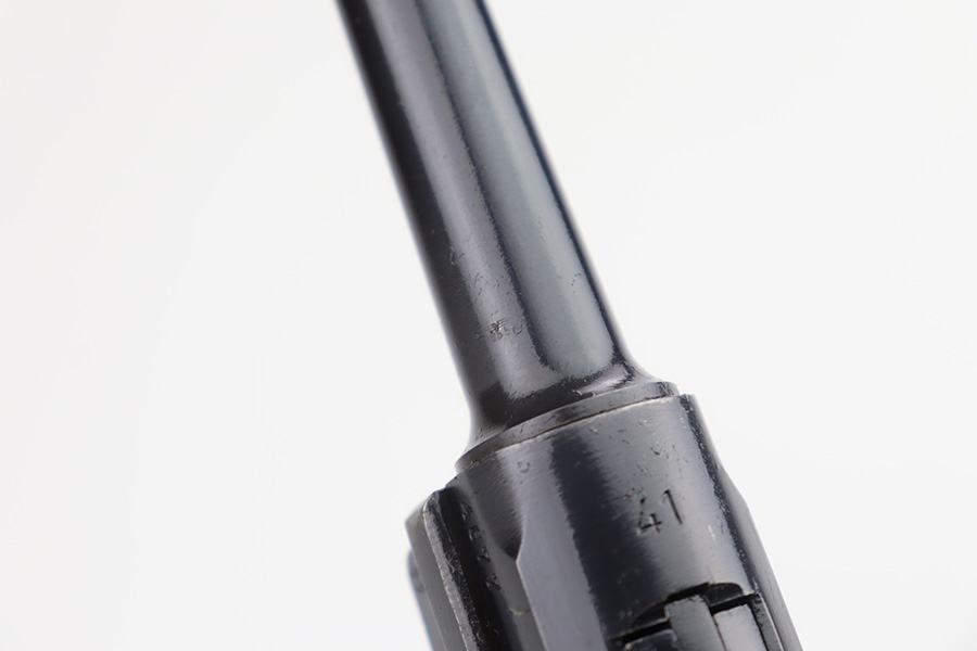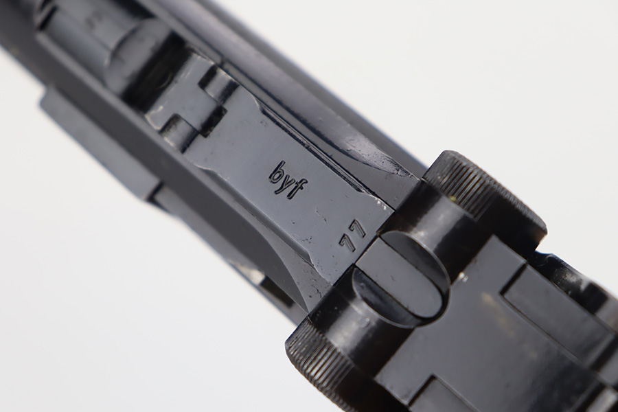 11/1/23 – This is an excellent example of a BYF 41 Mauser Luger issued to the Nazi military in 1941. All matching with the proper “Eagle 655” military acceptance proofs. It comes as a rig with a 1942-dated holster and two period-correct “black widow” magazines. The gun itself has retained about 94% of its original finish. There is just minor general high edge wear, some tiny scratches here and there, and some areas of very light freckling. Fitted with excellent matching-numbered and “Eagle 655” proofed grips – tiny chip in the upper corner of the left panel. Very nice bore with great rifling.