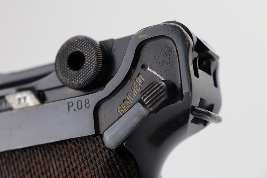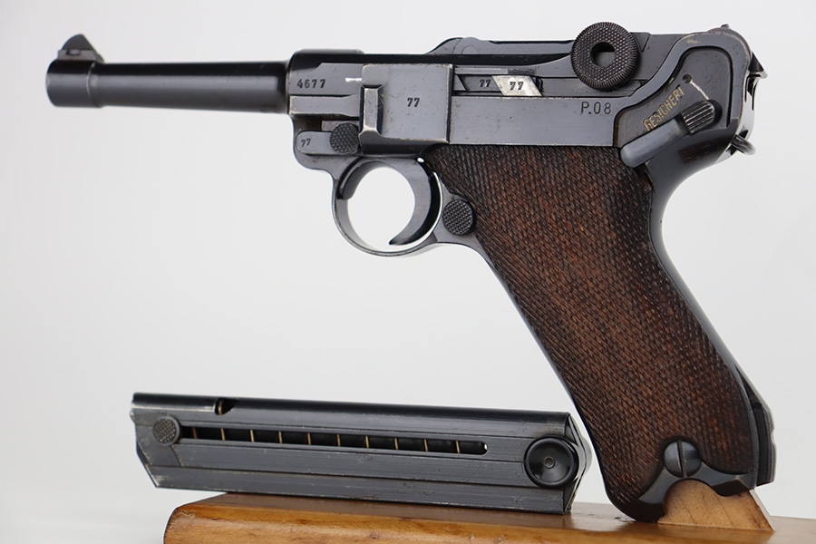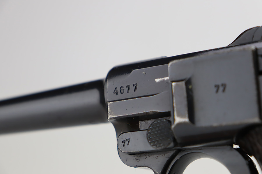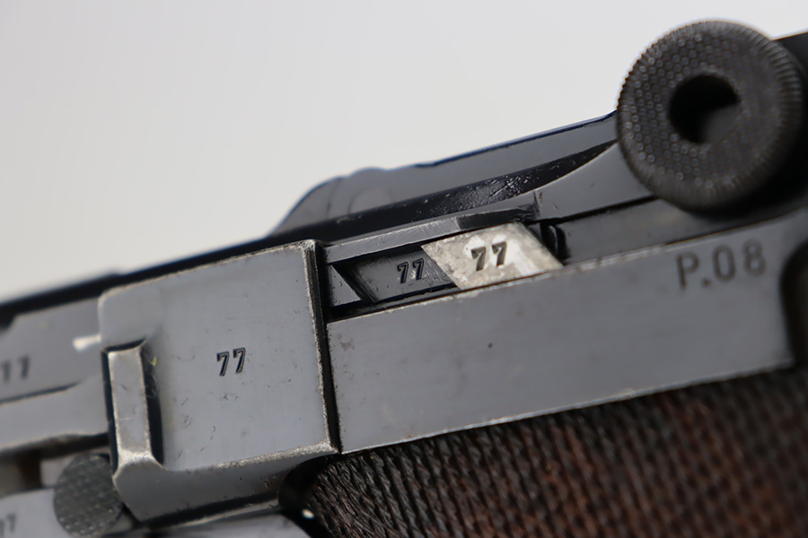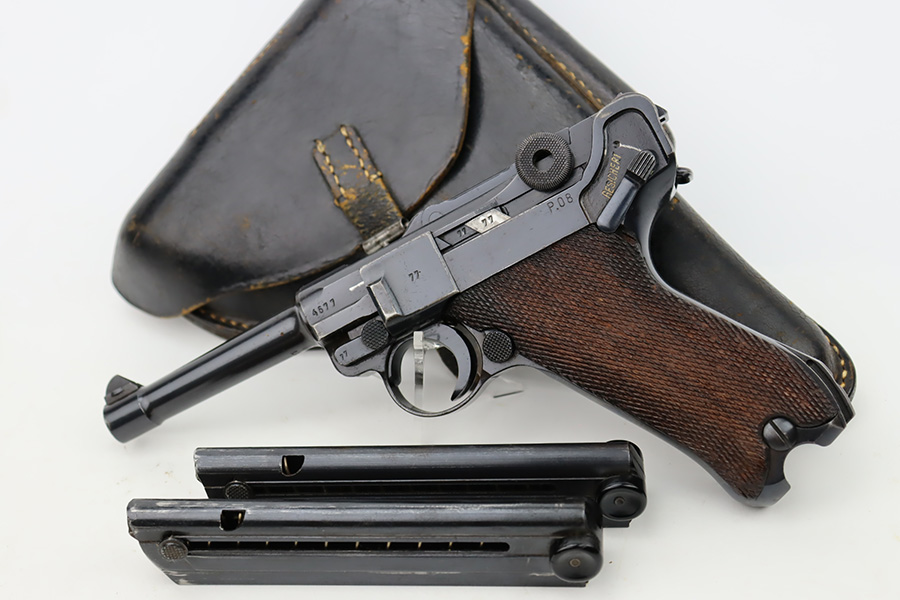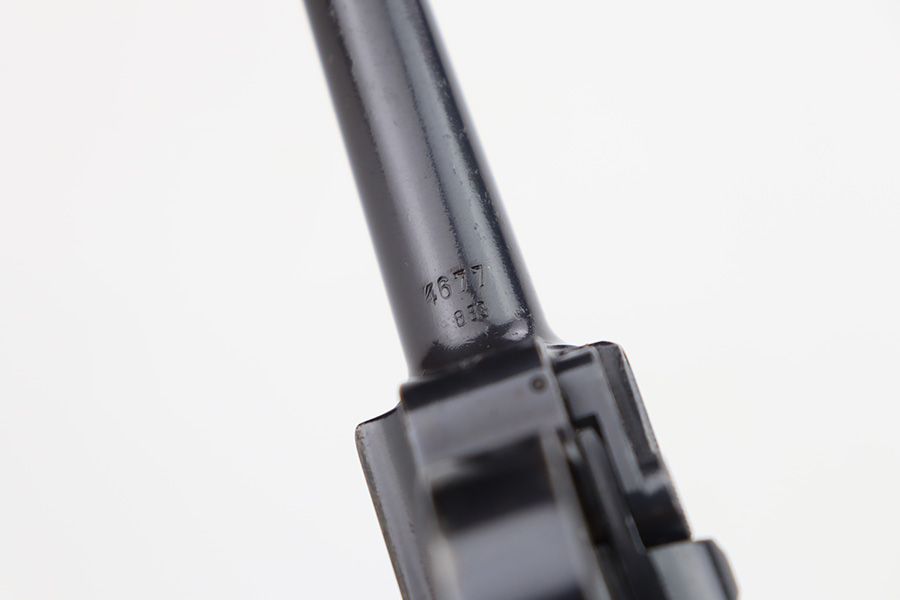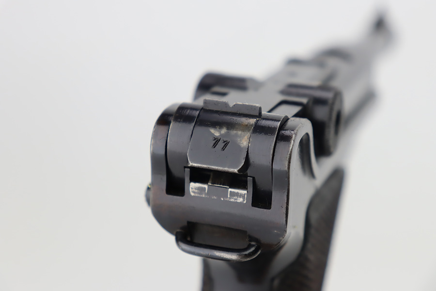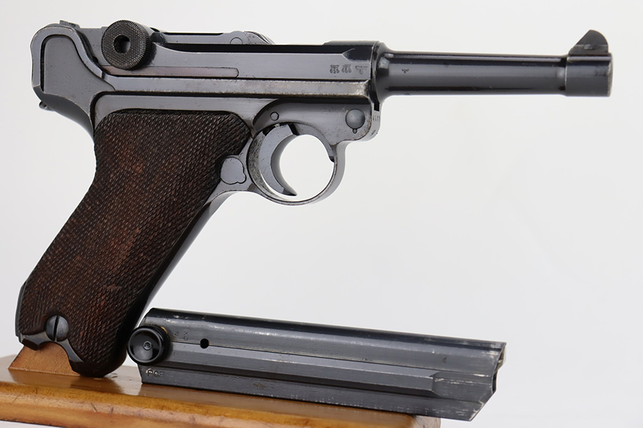 11/1/23 – This is an excellent example of a BYF 41 Mauser Luger issued to the Nazi military in 1941. All matching with the proper “Eagle 655” military acceptance proofs. It comes as a rig with a 1942-dated holster and two period-correct “black widow” magazines. The gun itself has retained about 94% of its original finish. There is just minor general high edge wear, some tiny scratches here and there, and some areas of very light freckling. Fitted with excellent matching-numbered and “Eagle 655” proofed grips – tiny chip in the upper corner of the left panel. Very nice bore with great rifling.