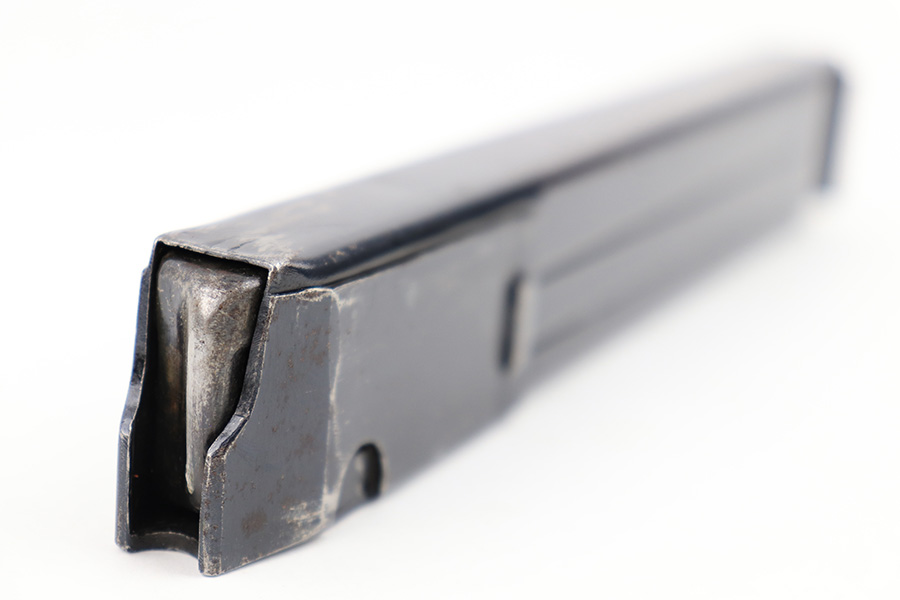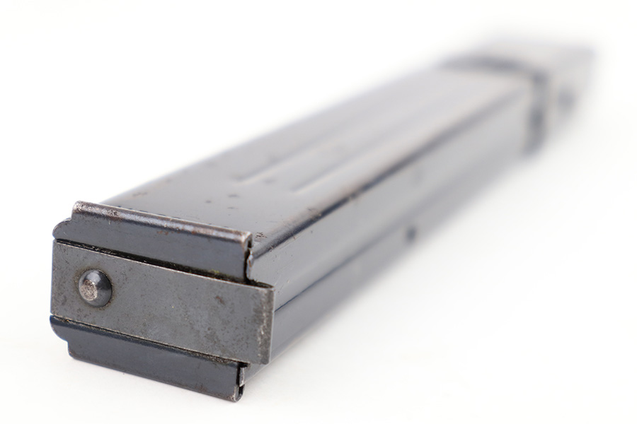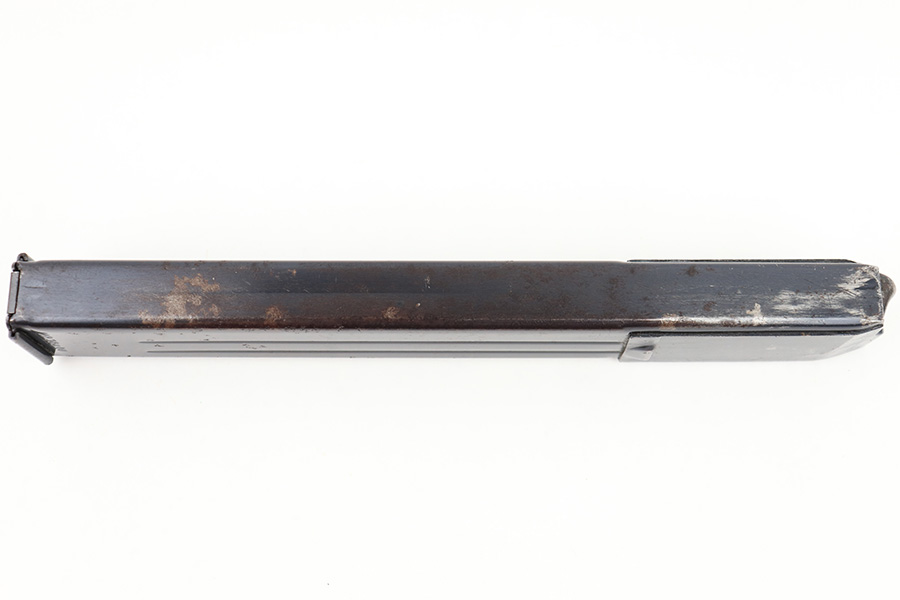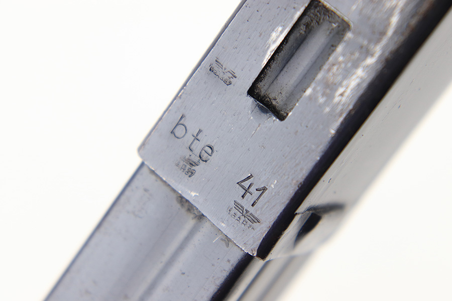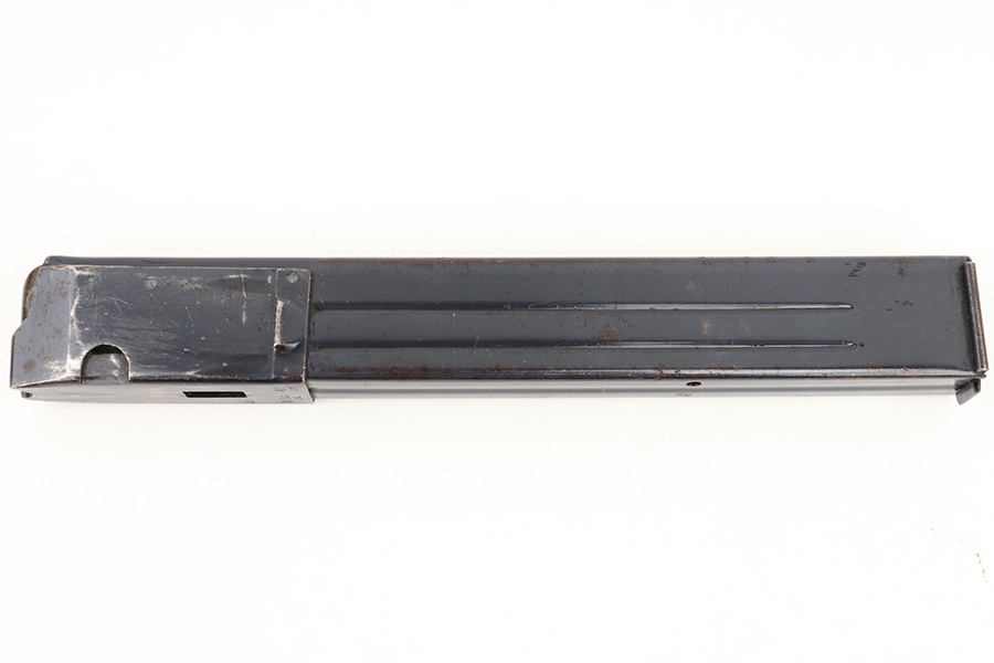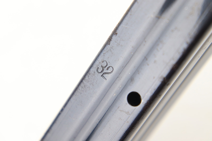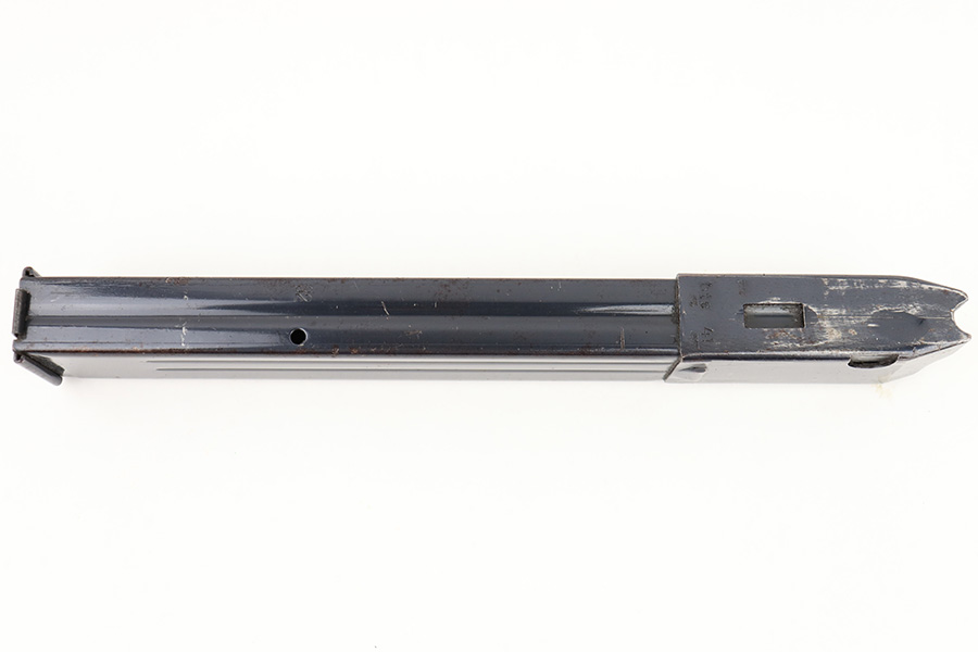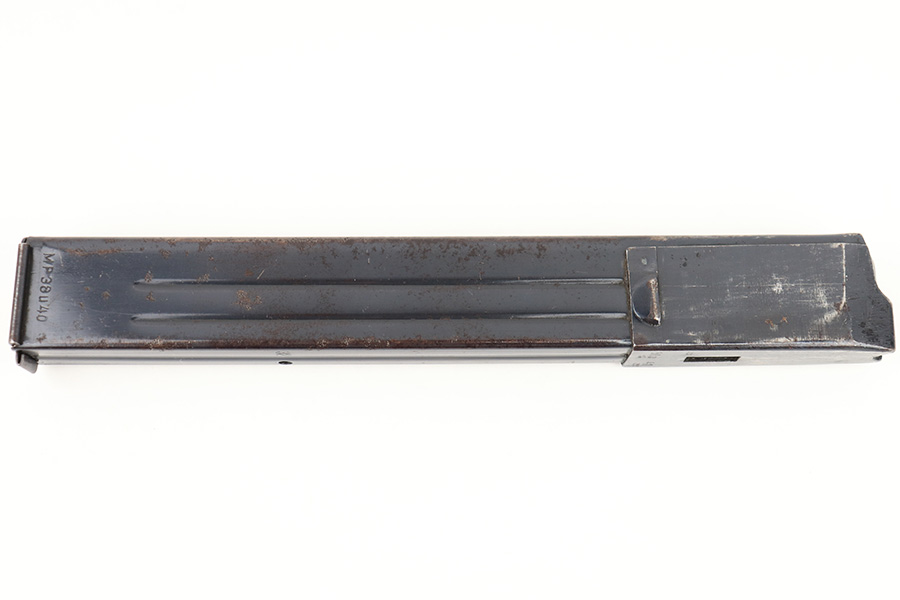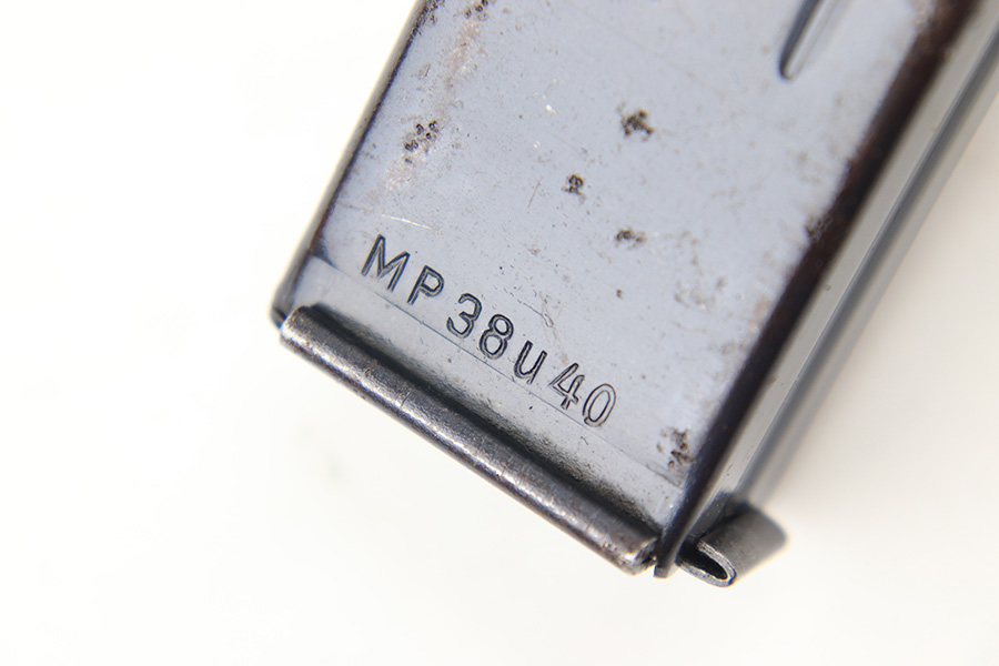 7/26/23 – This is an original WW2 production MP.40 submachine gun magazine. The magazine is in very good overall condition with some light speckling patina, mild finish loss, and a few small areas of pitting on the frame. Well marked with a maker code, date, and waffen military proof stamps. The spring is strong and fully functional.