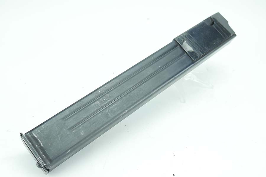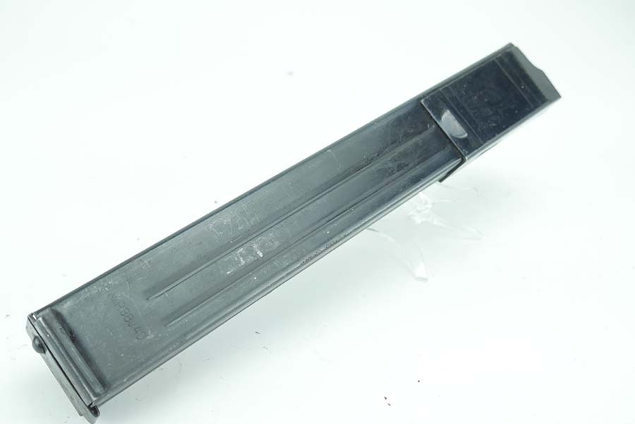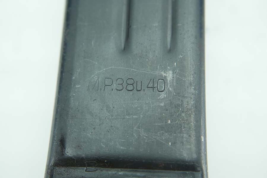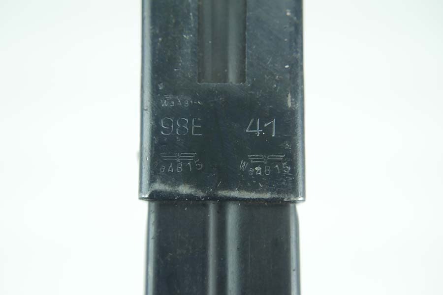 11/14/24 – This is an excellent example of a 1941 production WW2 MP.40 magazine. One side is “M.P. 38u.40” stamped. The spine is waffen proofed with WaA815 stamps and “98E” maker stamped with a ’41 date. The spring is strong and fully functional. The bluing is mostly intact, but there is use wear on the sides.