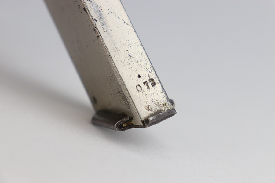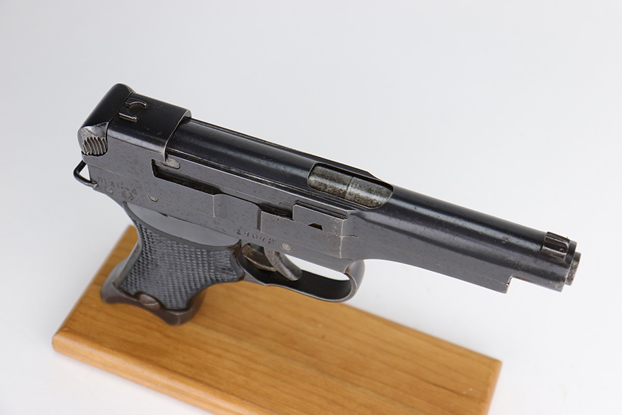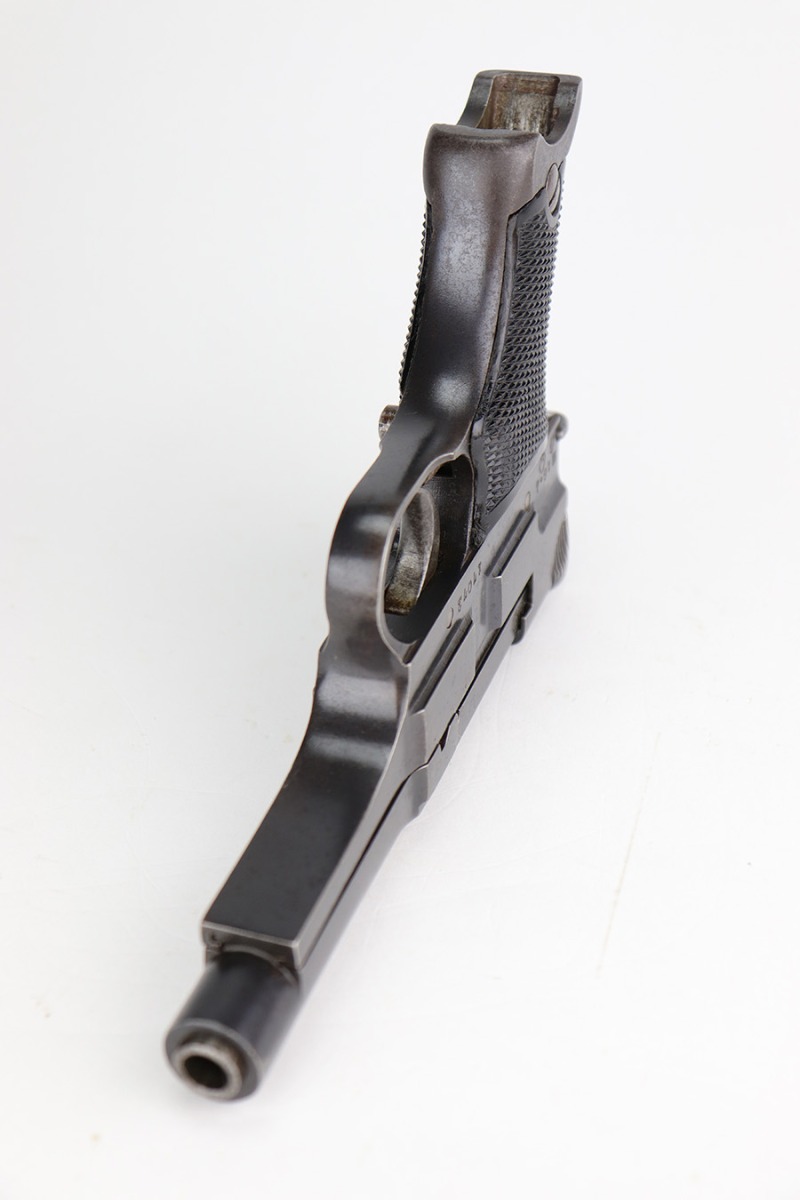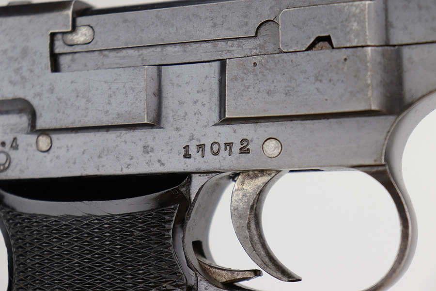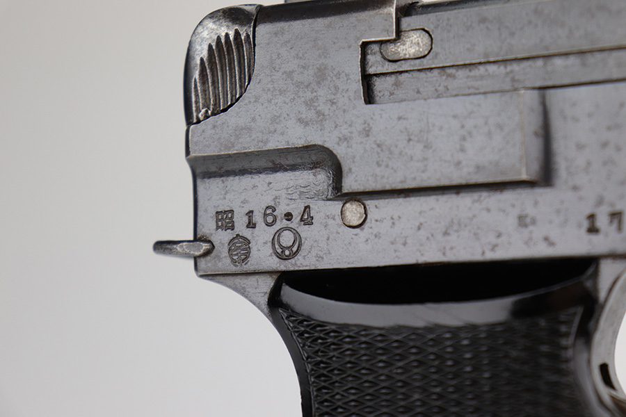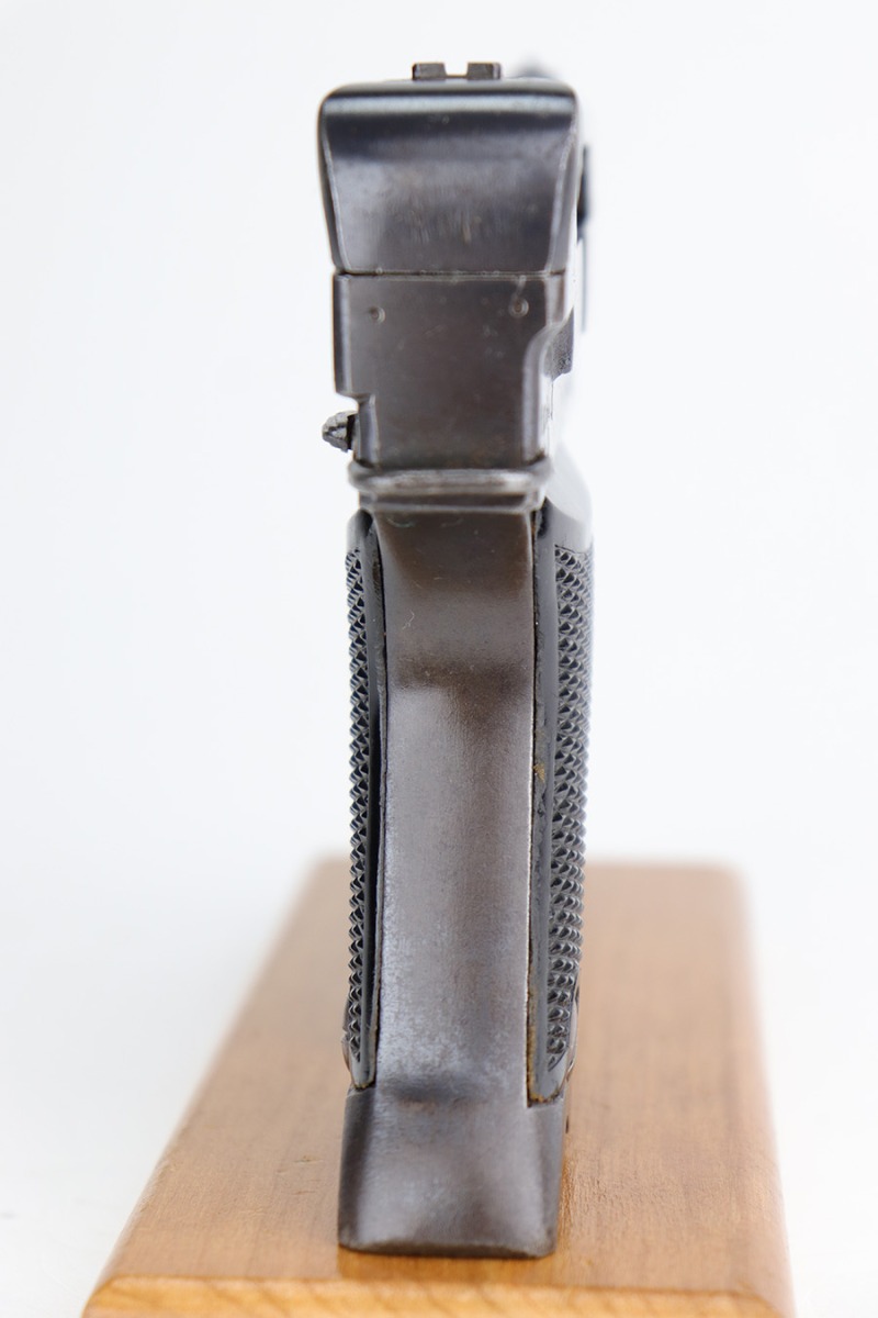 12/17/22 – This is an excellent example of a Nambu Type 94 issued to the Japanese military in April of 1941. It is all matching and comes with one original matching-numbered magazine. It has retained nearly all of its original bluing with just some very minor wear around the muzzle and on some of the high edges. While there is next-to-no actual finish loss, there is light spotty oxidation on the whole gun and some light brown patina on the grip straps. Fitted with very nice period-correct black bakelite grips. Excellent bore with strong rifling.