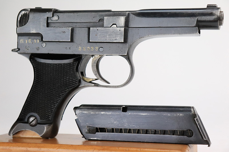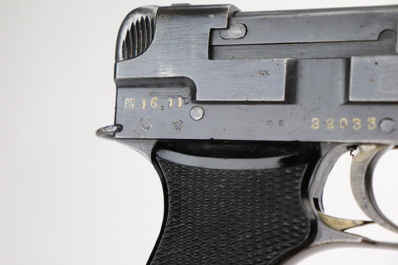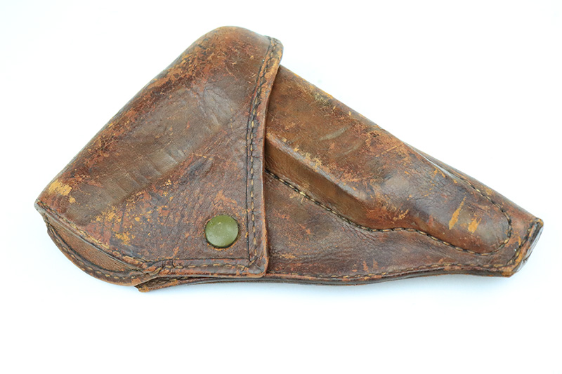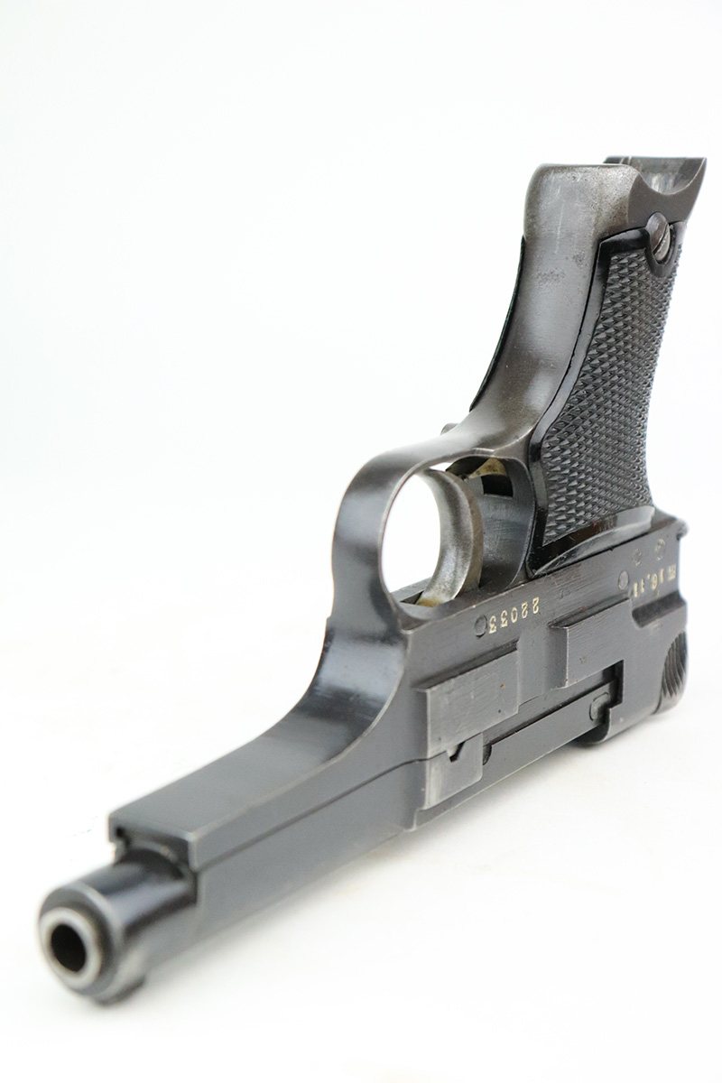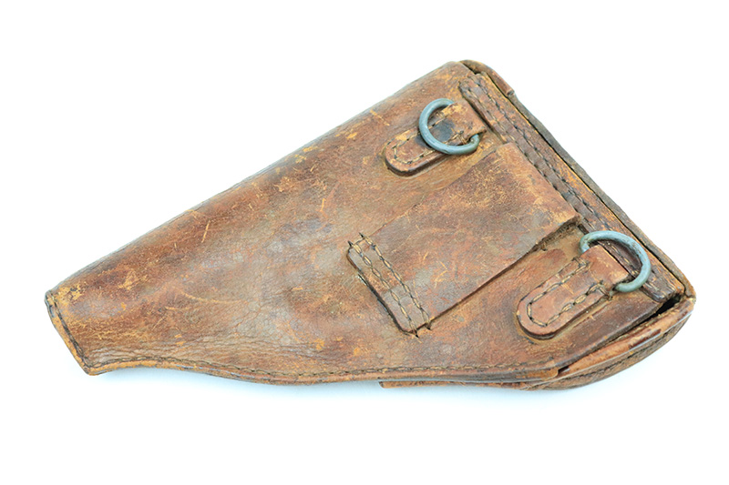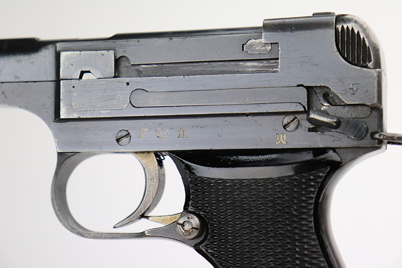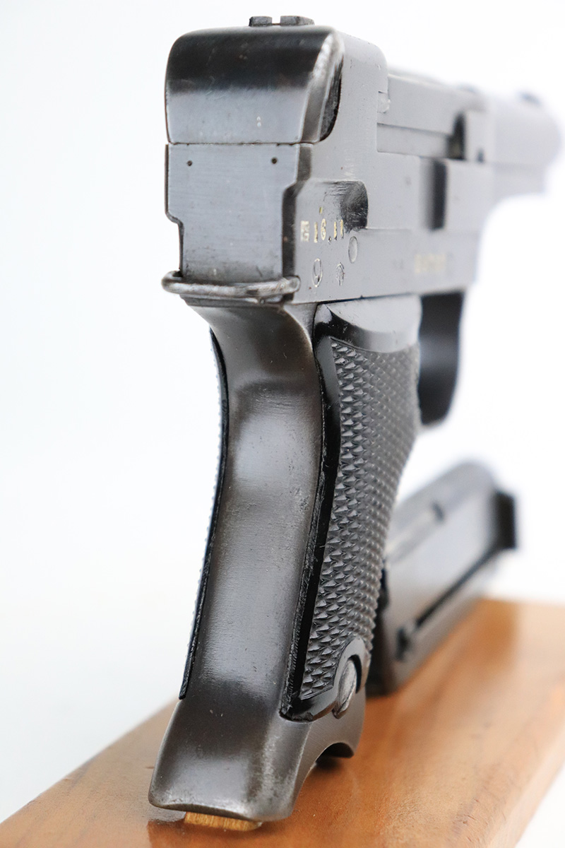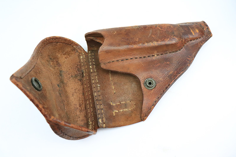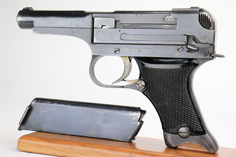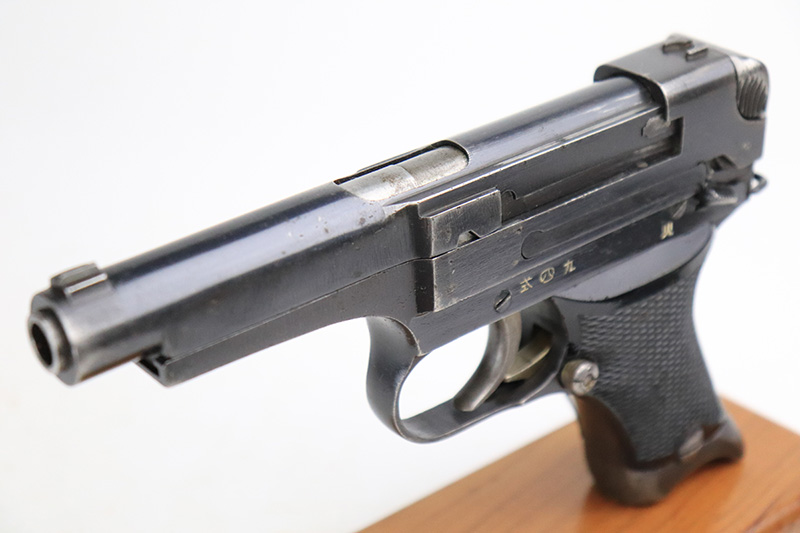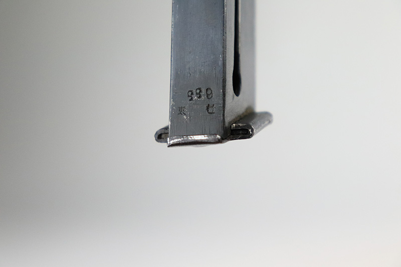 8/23/22 – This is an excellent example of a Nambu Type 94 issued to the Japanese military in November of 1941. It is all matching and comes as a rig with a nice period-correct leather holster and a period-correct but mismatched magazine. The gun itself has retained about 95% of its original finish. Generally, there is minor wear around the high edges and around the muzzle. Some dulling in the finish and minor pin-pricking on the grip straps. Comes with excellent period-correct black bakelite grips. Minty bore.