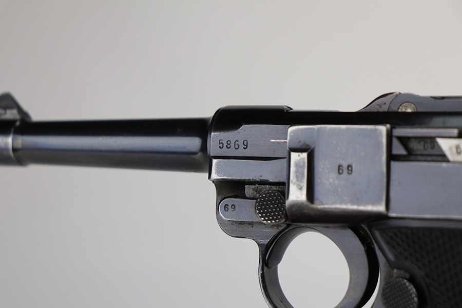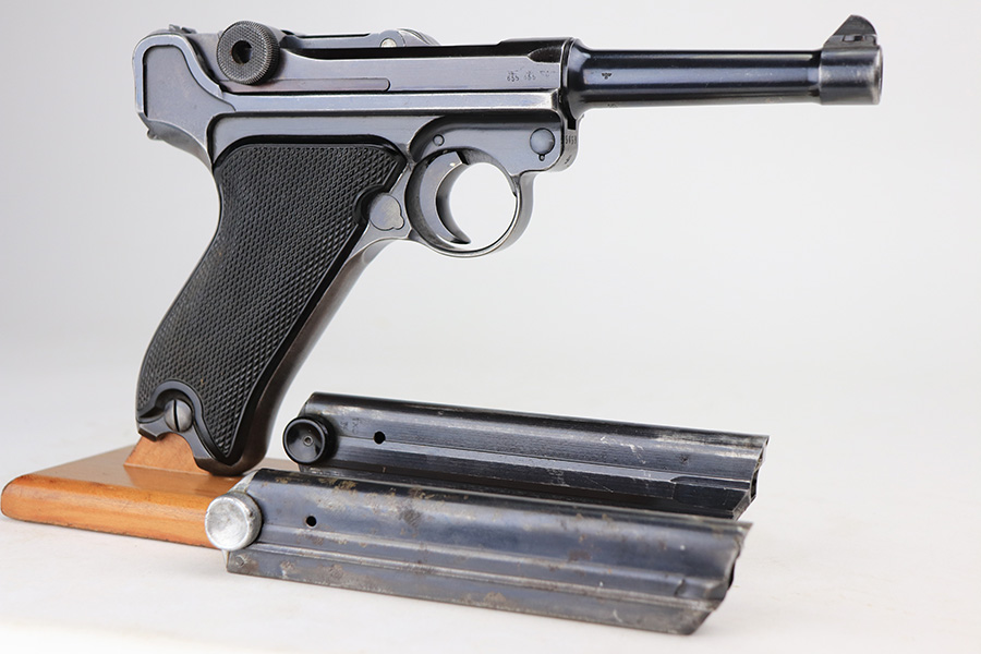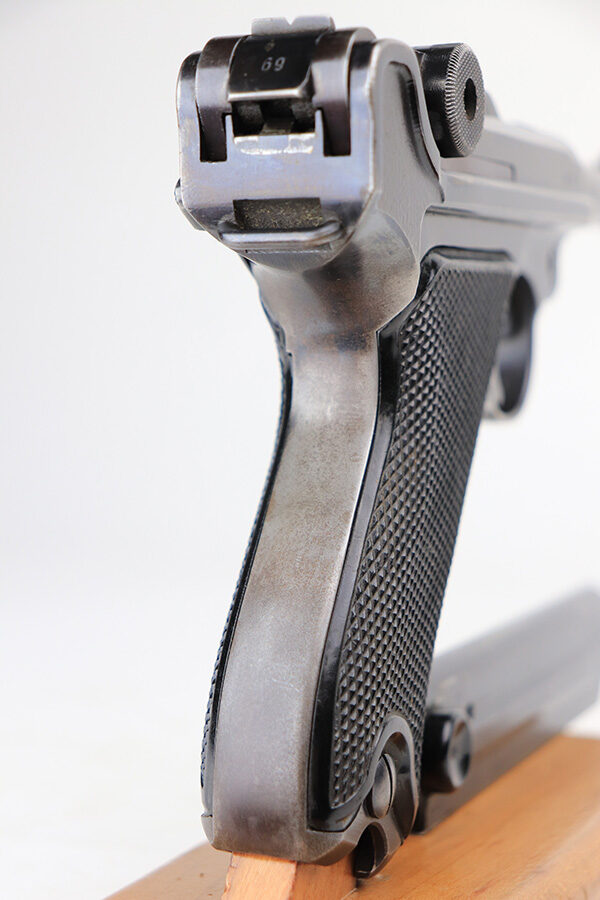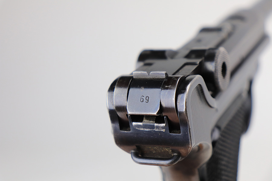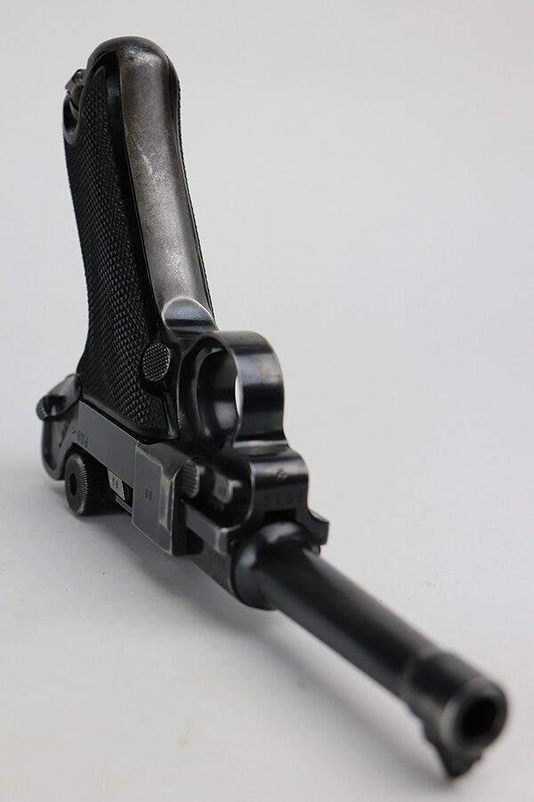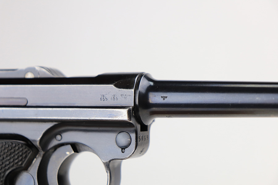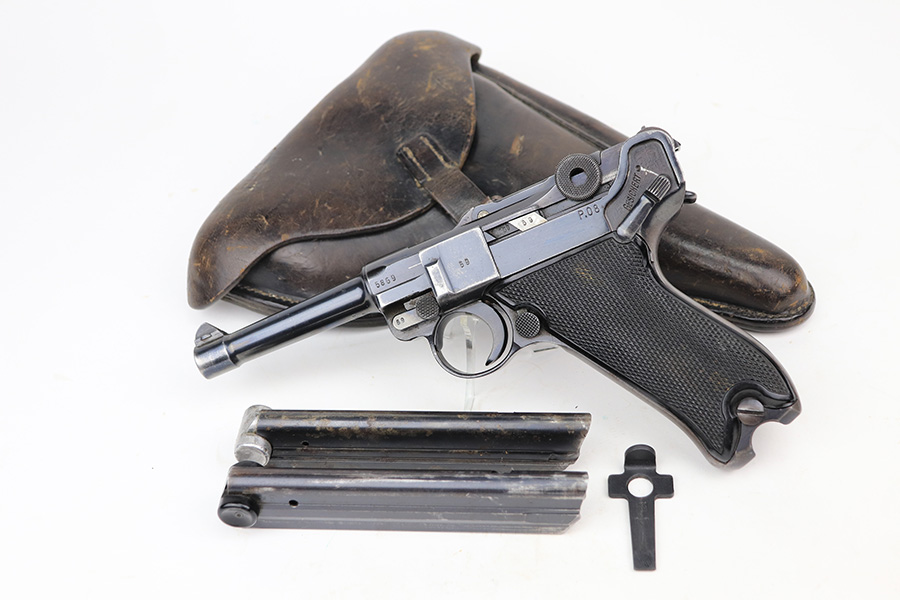 1/11/22 – This is a nice example of a “Black Widow” Mauser Luger issued to the Nazi military in 1941. It is all matching and has the proper “Eagle 655” Nazi military acceptance proofs on the right side of the slide. It comes as a rig with a nice 1939-dated waffen-proofed holster, one original black widow magazine, one period-correct but mismatched aluminum bottom magazine, and one Finnish-marked Luger tool. The gun has retained roughly 75% of its original finish. Most of the finish loss is on both grip straps, where there is almost no bluing left. There is also minor wear on the side plate, side rails, and around the muzzle. Some tiny handling marks along the barrel. Comes with excellent period-correct black widow grips. The bore has decent rifling with pin-pricking in the grooves.