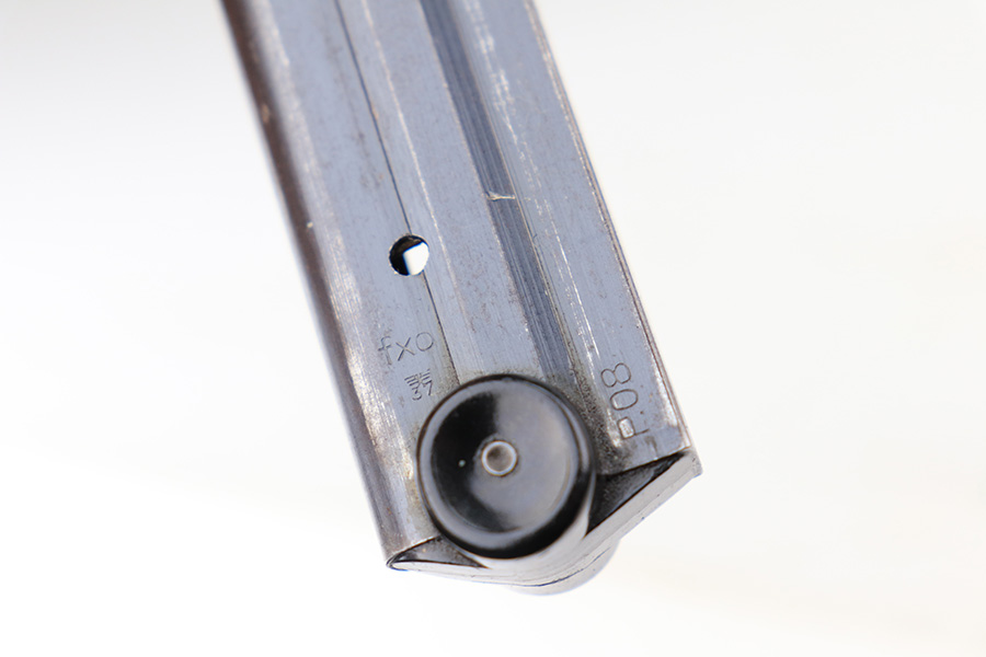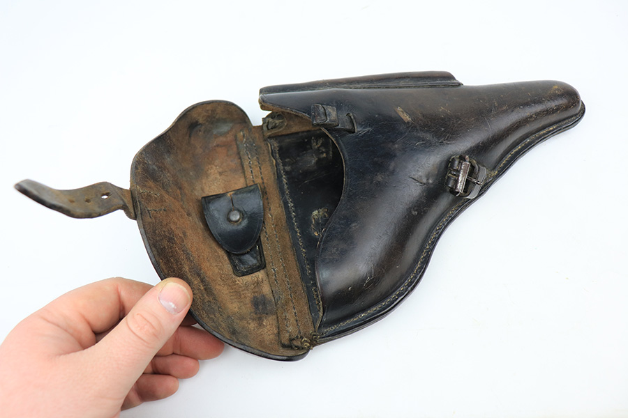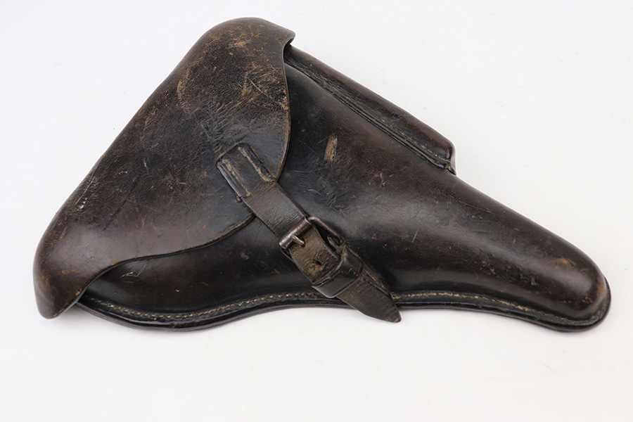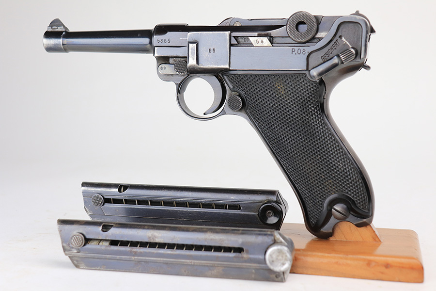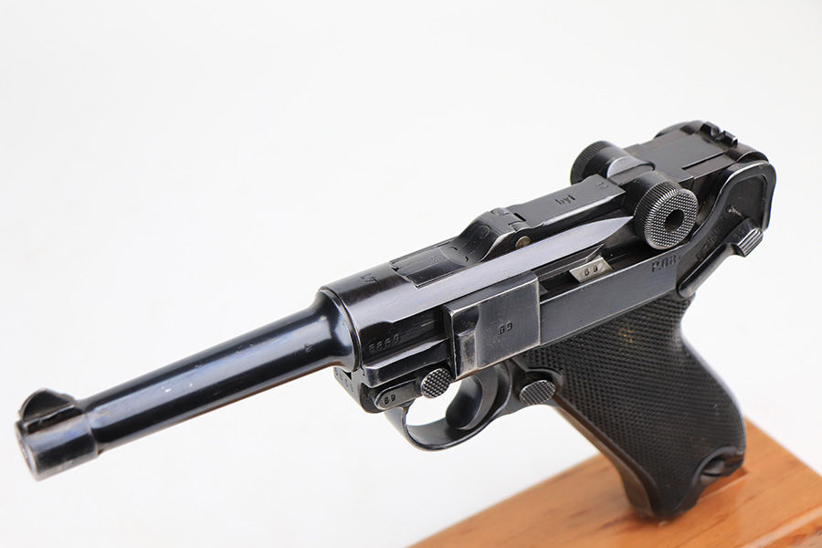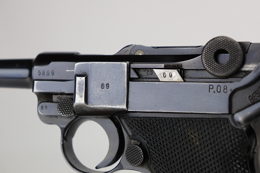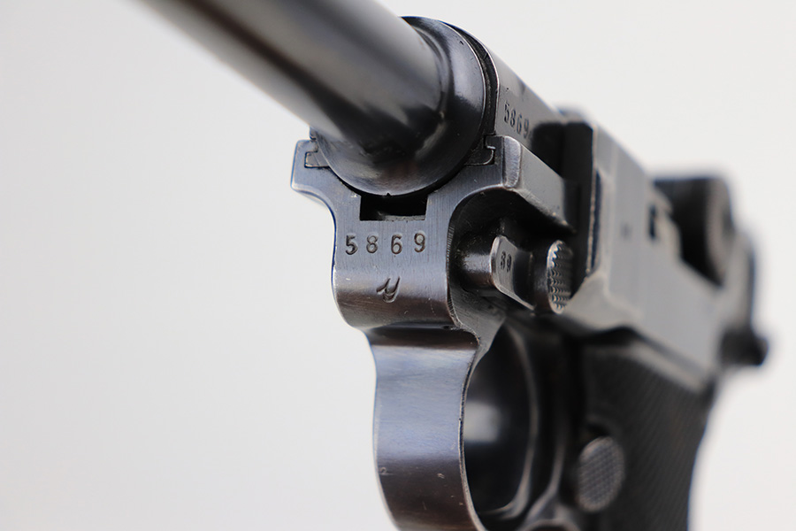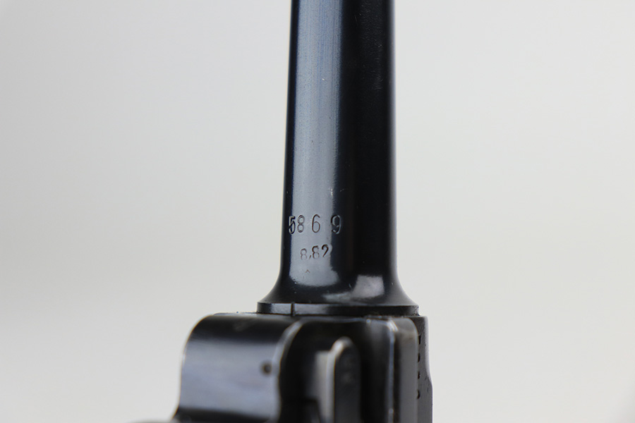 1/11/22 – This is a nice example of a “Black Widow” Mauser Luger issued to the Nazi military in 1941. It is all matching and has the proper “Eagle 655” Nazi military acceptance proofs on the right side of the slide. It comes as a rig with a nice 1939-dated waffen-proofed holster, one original black widow magazine, one period-correct but mismatched aluminum bottom magazine, and one Finnish-marked Luger tool. The gun has retained roughly 75% of its original finish. Most of the finish loss is on both grip straps, where there is almost no bluing left. There is also minor wear on the side plate, side rails, and around the muzzle. Some tiny handling marks along the barrel. Comes with excellent period-correct black widow grips. The bore has decent rifling with pin-pricking in the grooves.