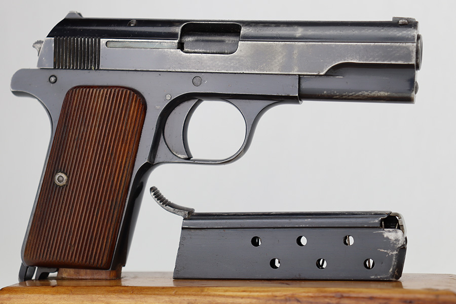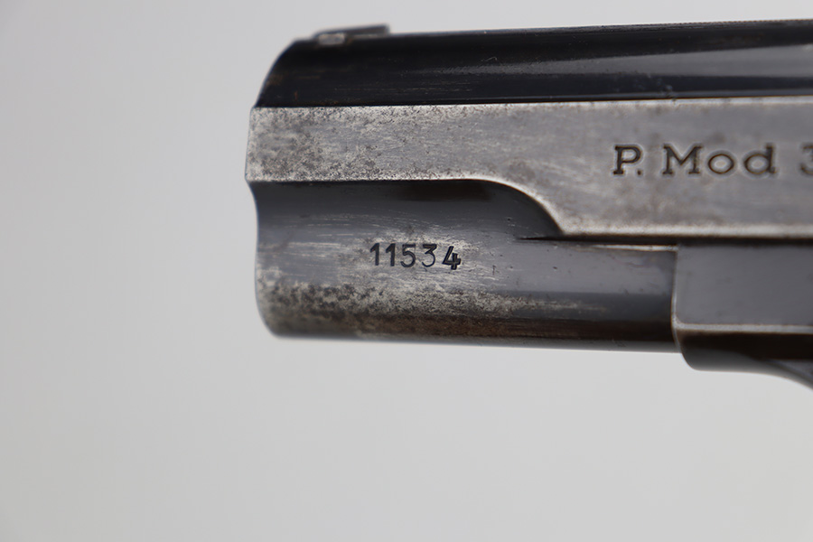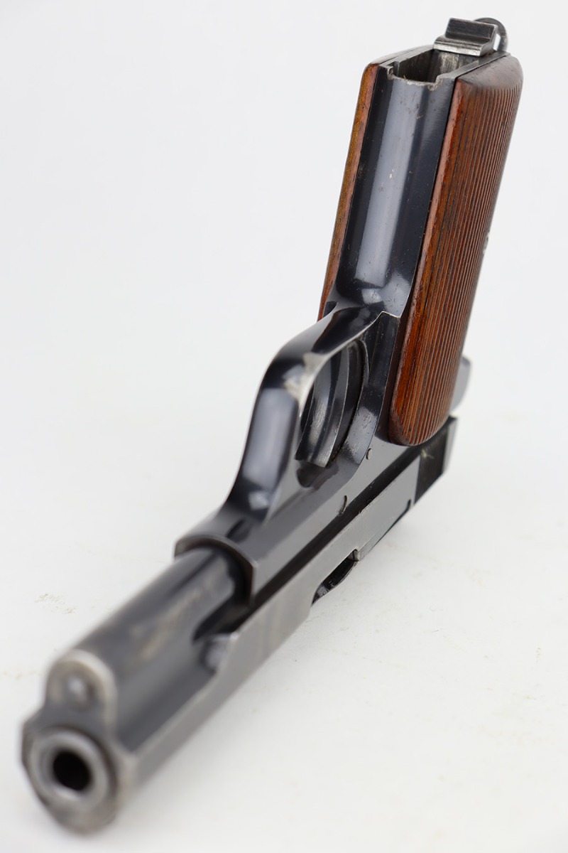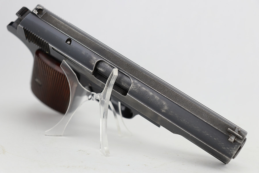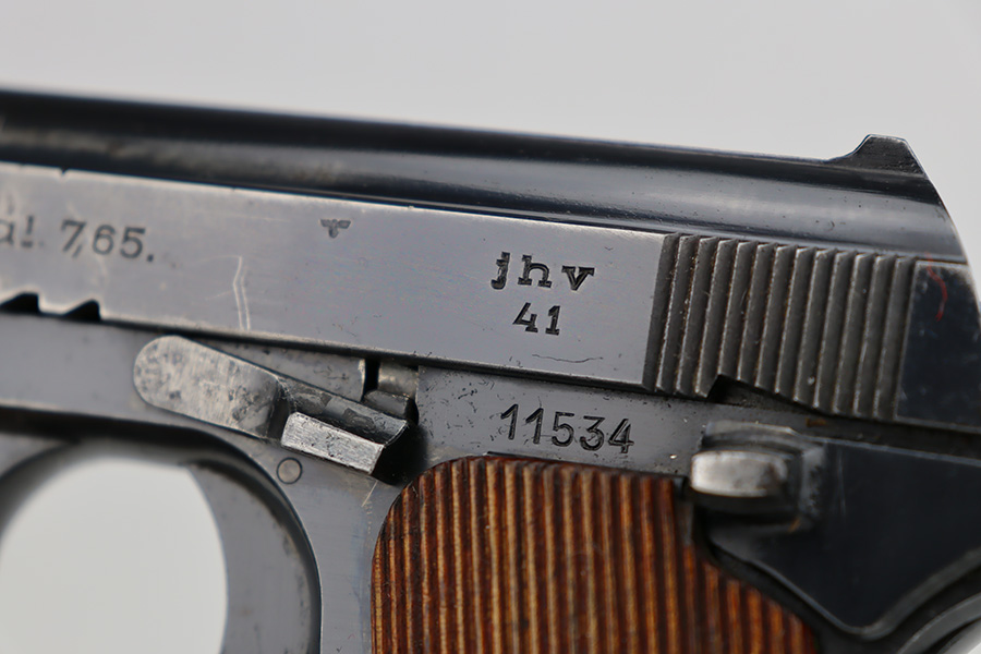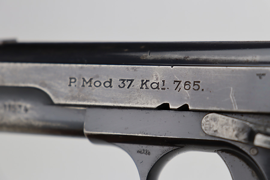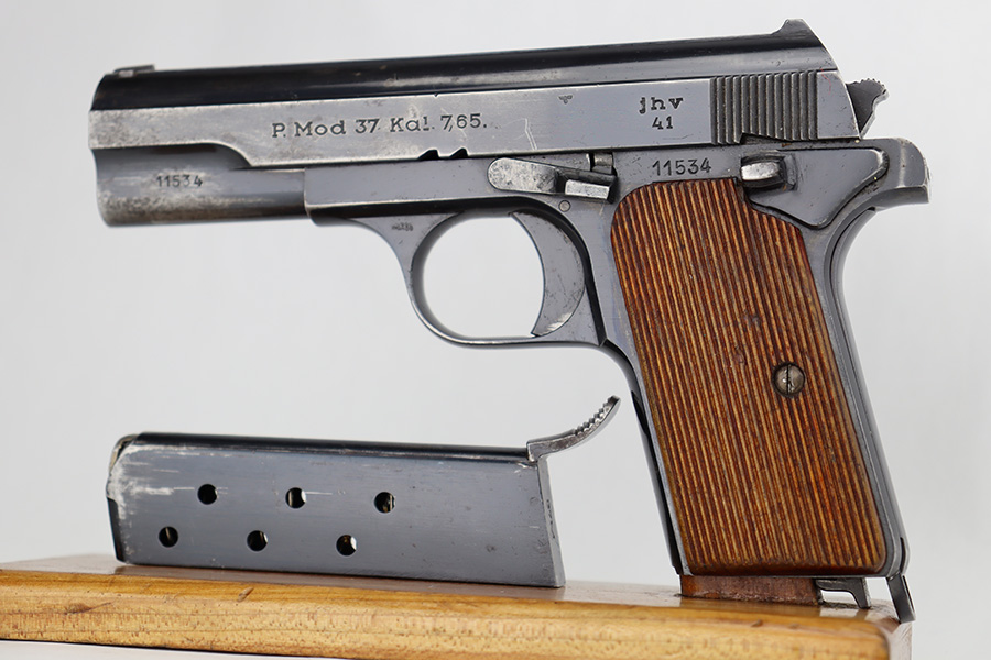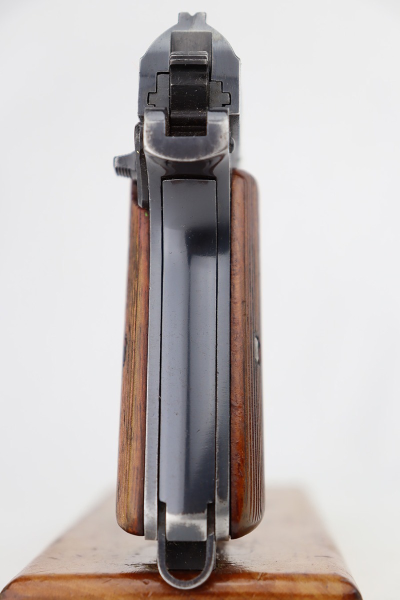 6/12/23 – This is a nice example of a Femaru Model 37 issued to the Luftwaffe in 1941. It is all matching and properly waffen-proofed. It has retained roughly 65% of its original high polish finish. The majority of the finish loss comes in the form of obvious wear along both sides of the slide. Some very light pin-pricking around some of the high edges. Fitted with excellent period-correct wood grips. Comes with one period-correct but un-numbered magazine. Mint bore.