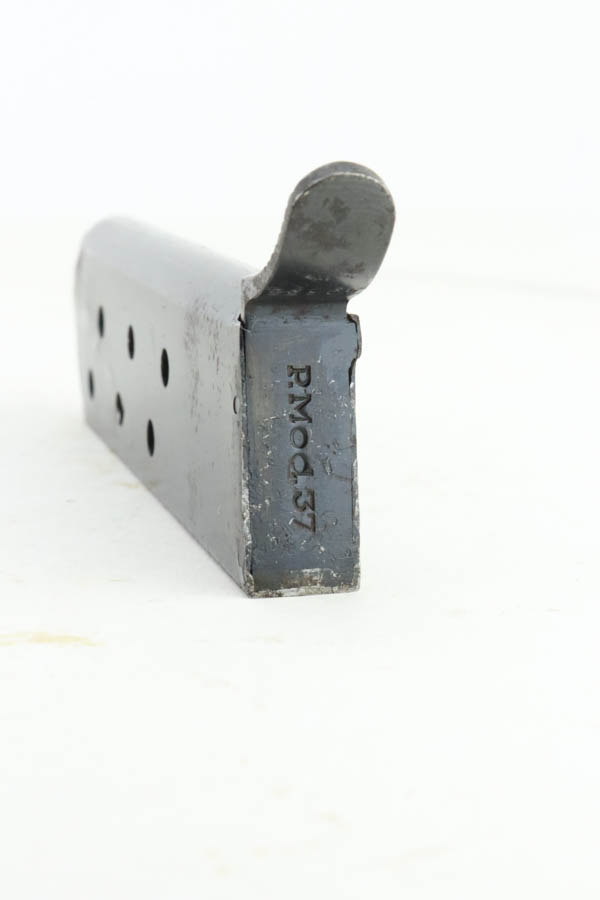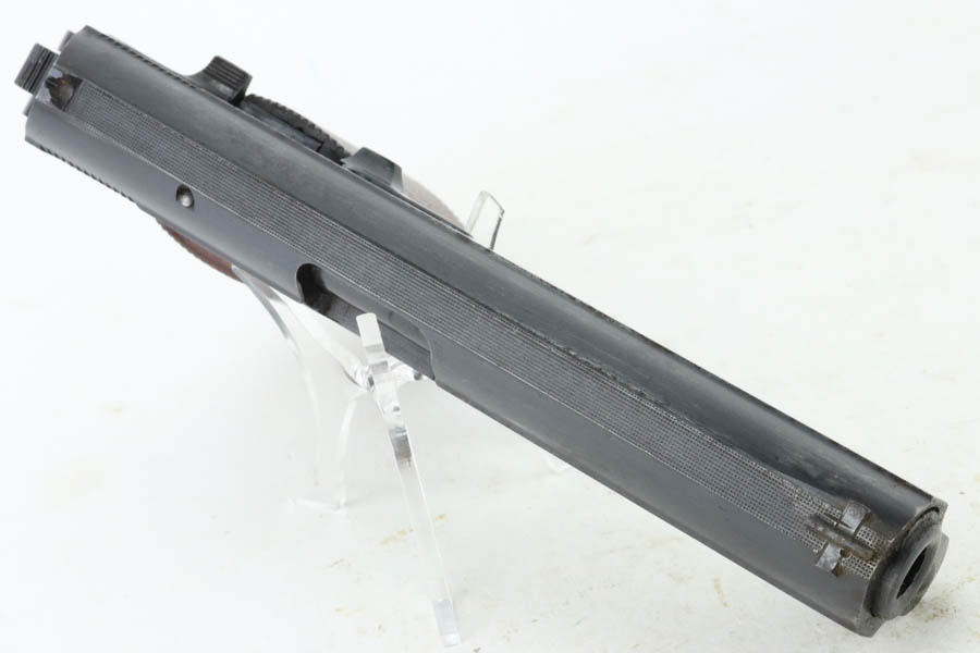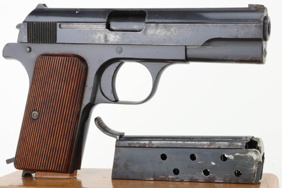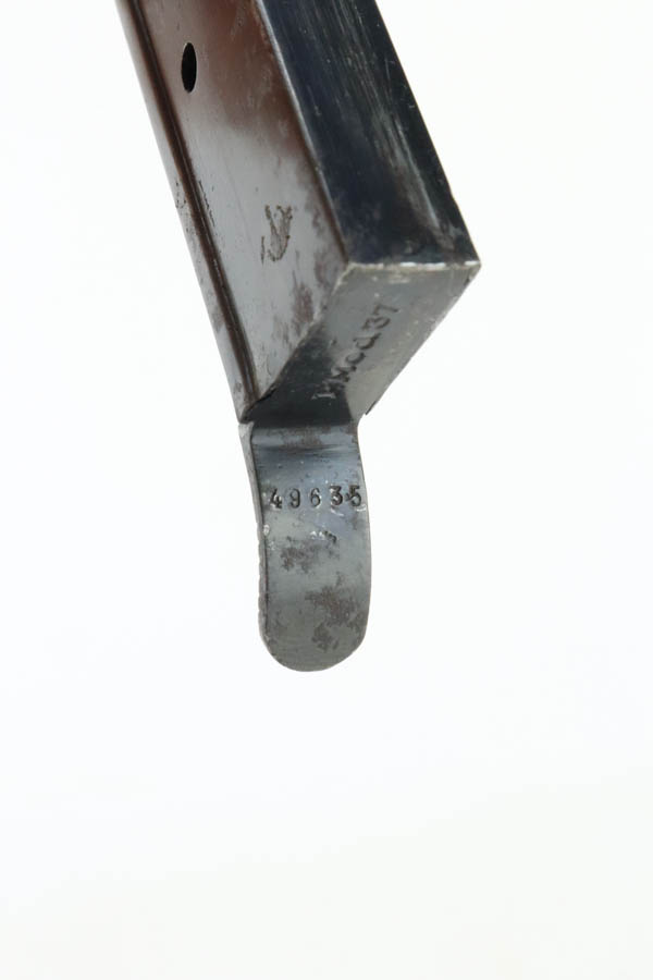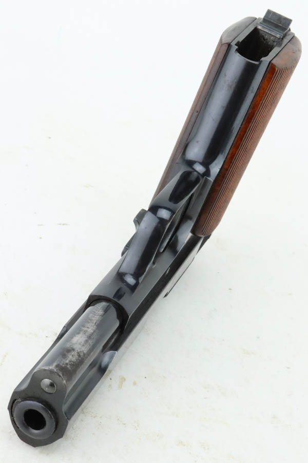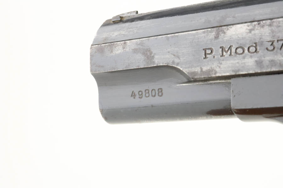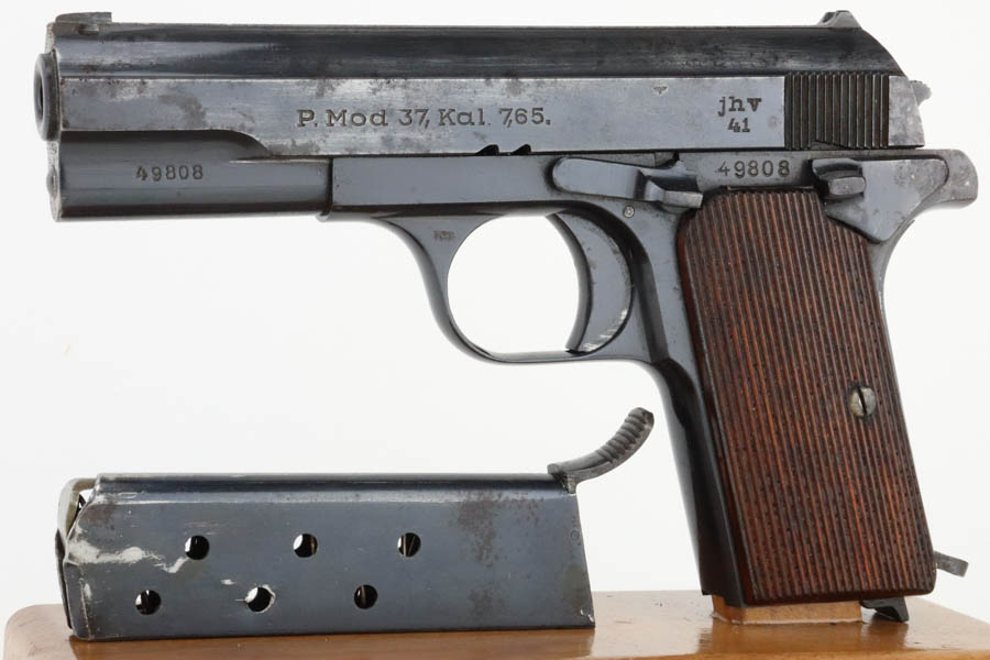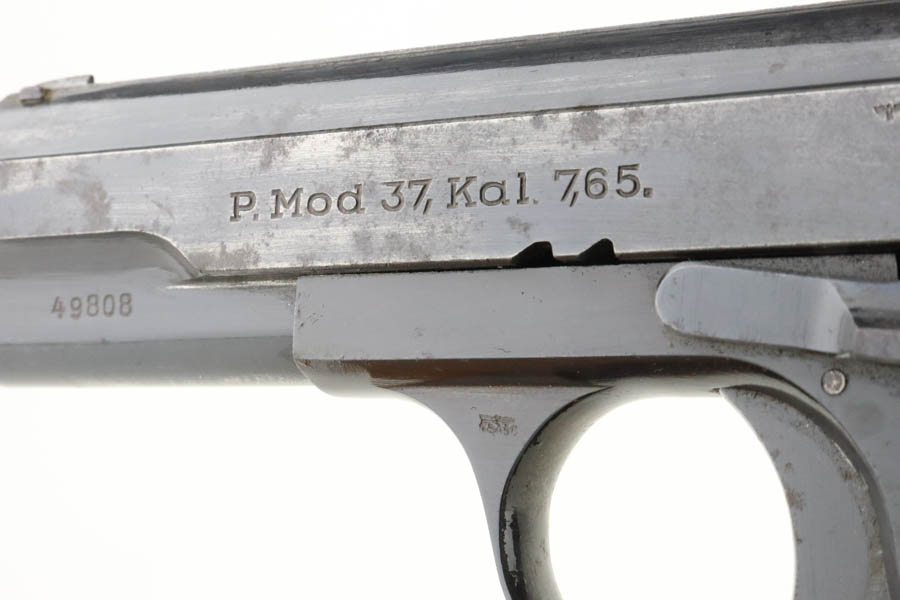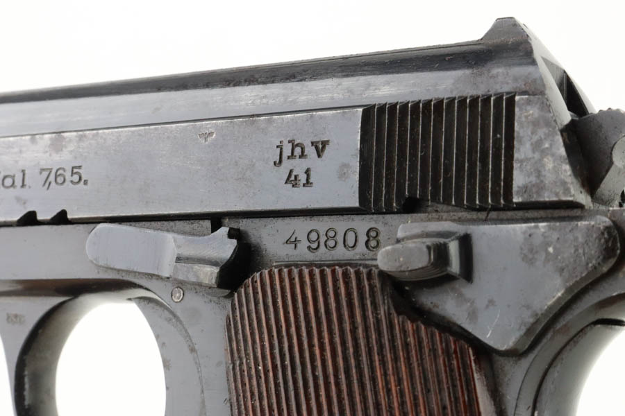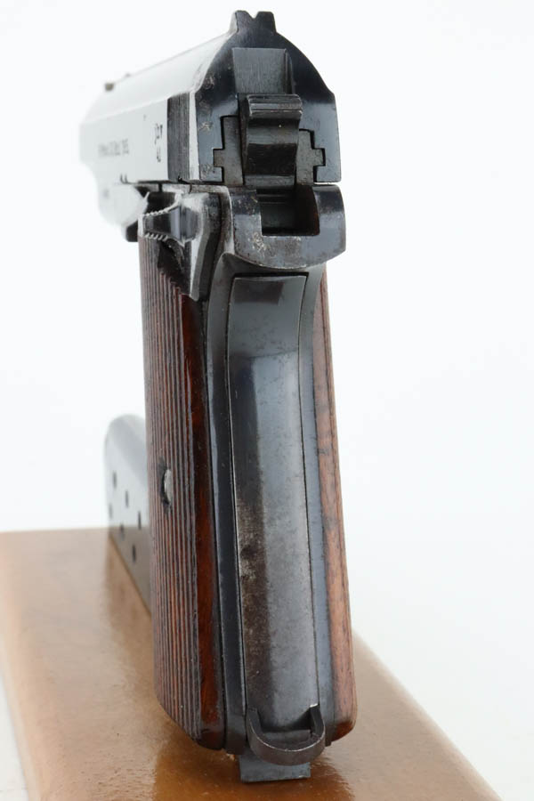 7/15/24 – This is a nice example of a Femaru M37 issued to the Luftwaffe in 1941. All matching with the proper “Waffen 58” military acceptance proof on the trigger guard. It comes with a mismatched but numbered magazine (#49635). There is not much actual finish loss, but there are areas of spotty oxidation with tiny pits on both sides of the slide and on the front strap. Fitted with period-correct wood grips. Mint bore.