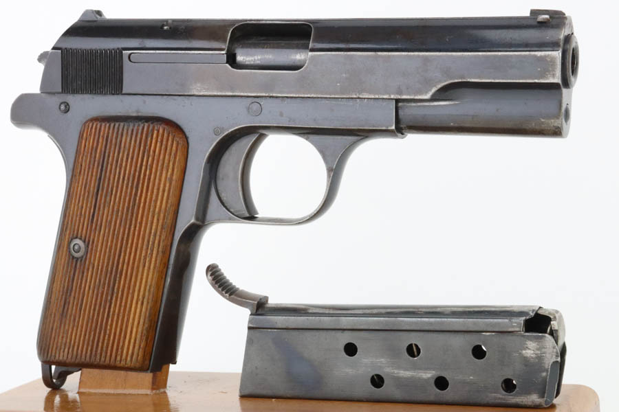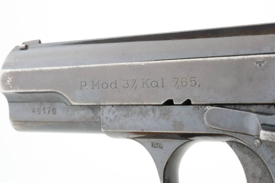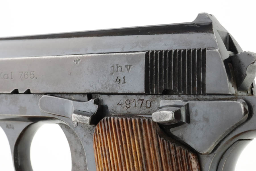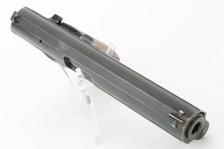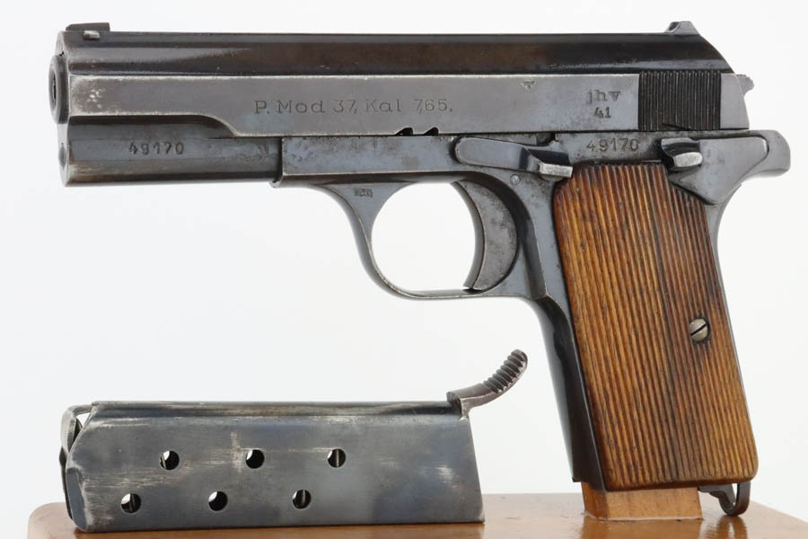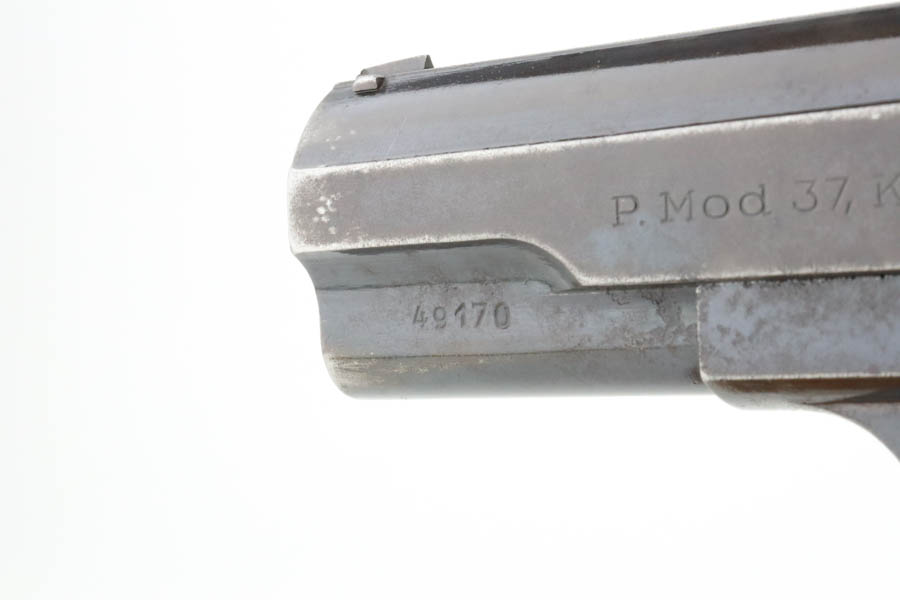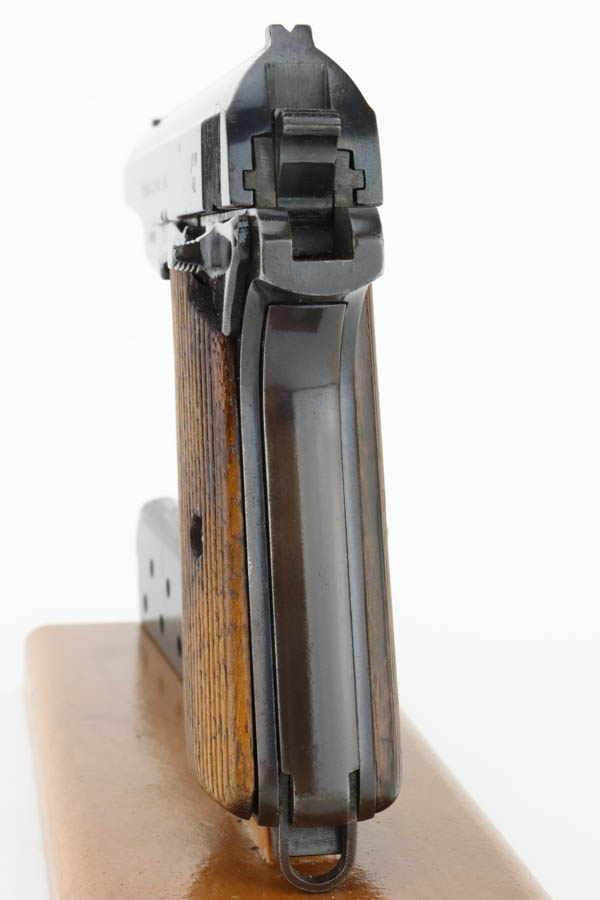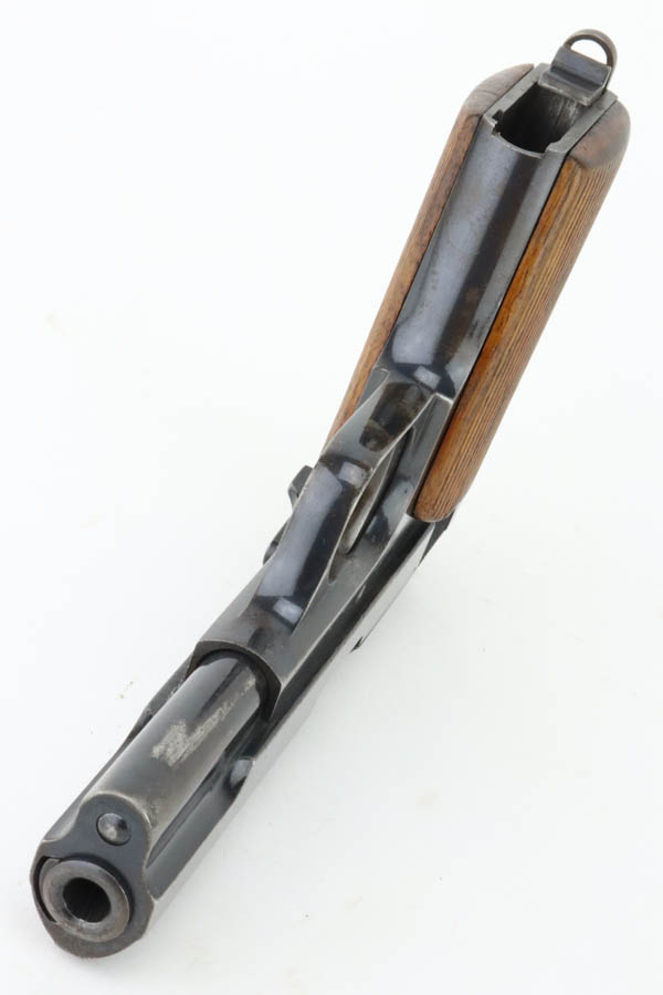 6/18/24 – This is a nice example of a Femaru M37 issued to the Luftwaffe in 1941. All matching with the proper “Waffen 58” military acceptance proof on the trigger guard. It comes with one original matching-numbered magazine. Its original finish rates about 95% with general high edge wear. While there isn’t much actual finish loss, there is light brown patina throughout, some areas of spotty oxidation here and there, and some spots of minor pitting. Fitted with excellent period-correct wood grips. Minty bore.