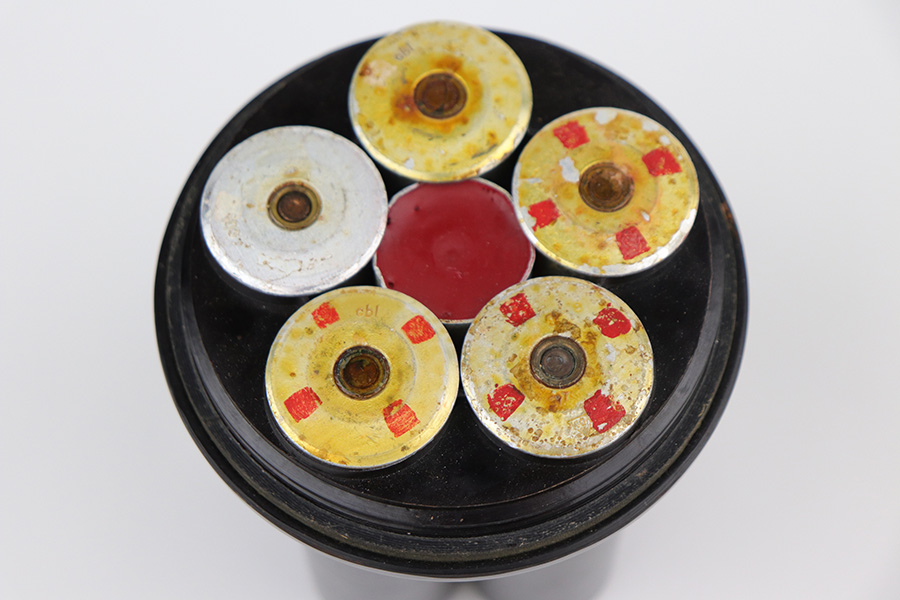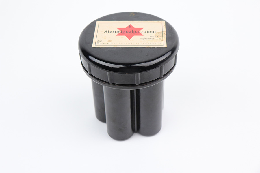 8/27/21 – This is an excellent 1941-dated Nazi Flare Case with 6 original flares. The case is dated September of 1941. It is made of black bakelite. The original label is still intact. The case is minty with no cracks or chips. It comes with 6 original flares. They are all inert. They are maker marked and dated 1940, 1941, and 1945.