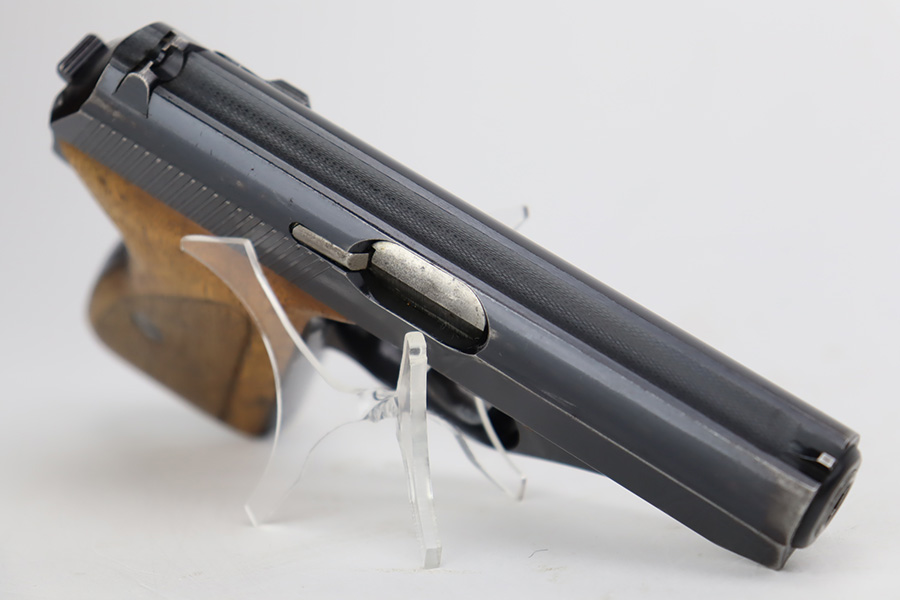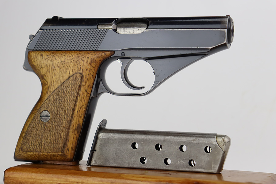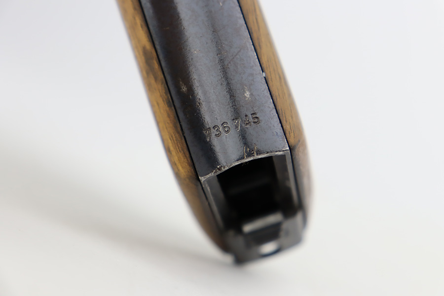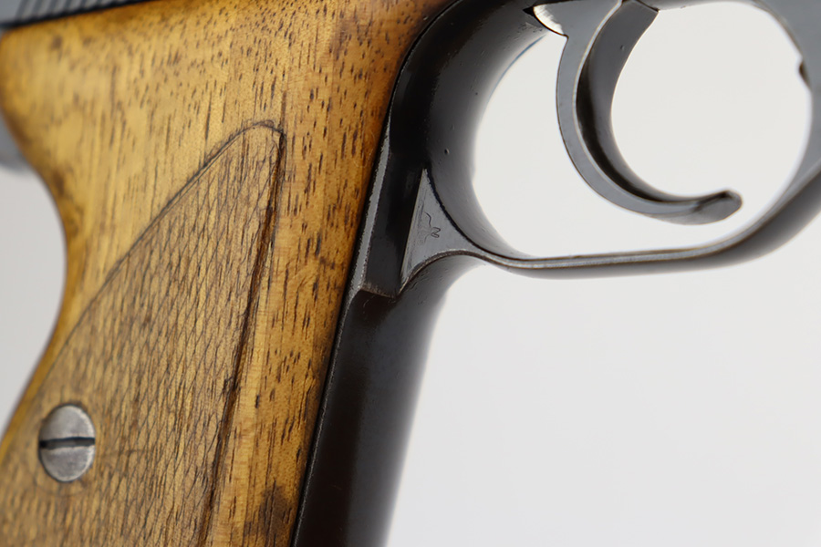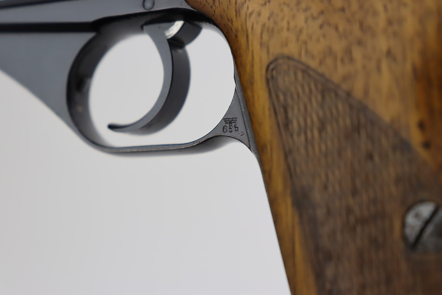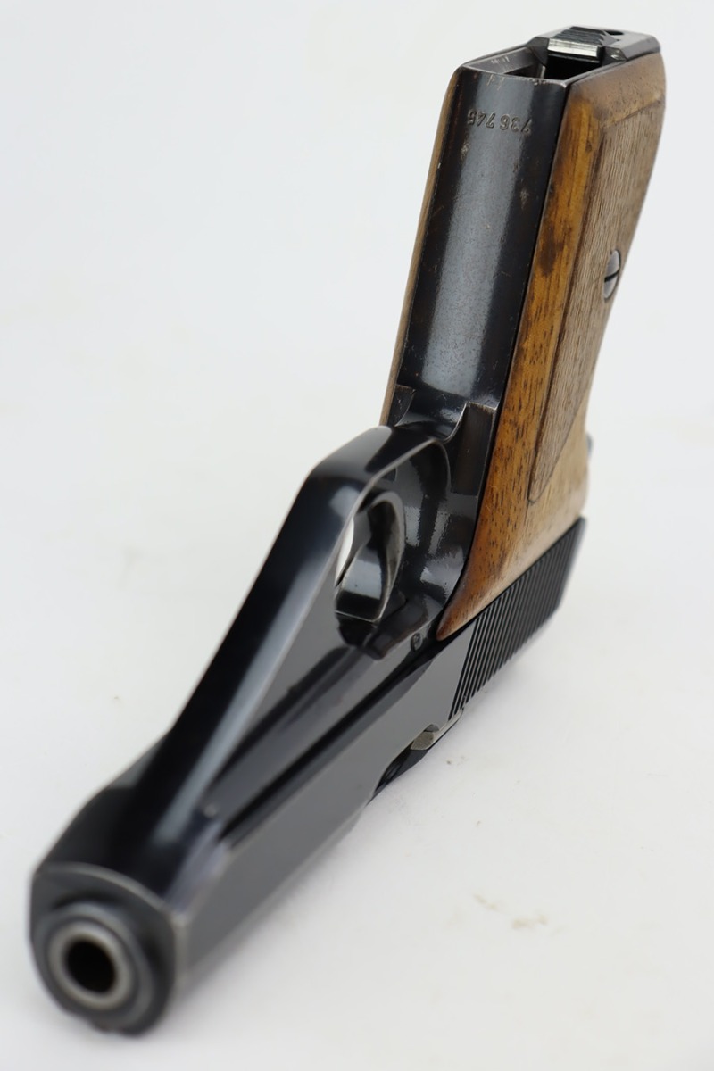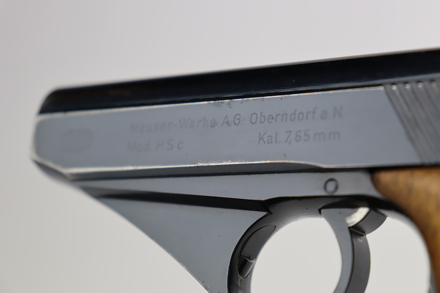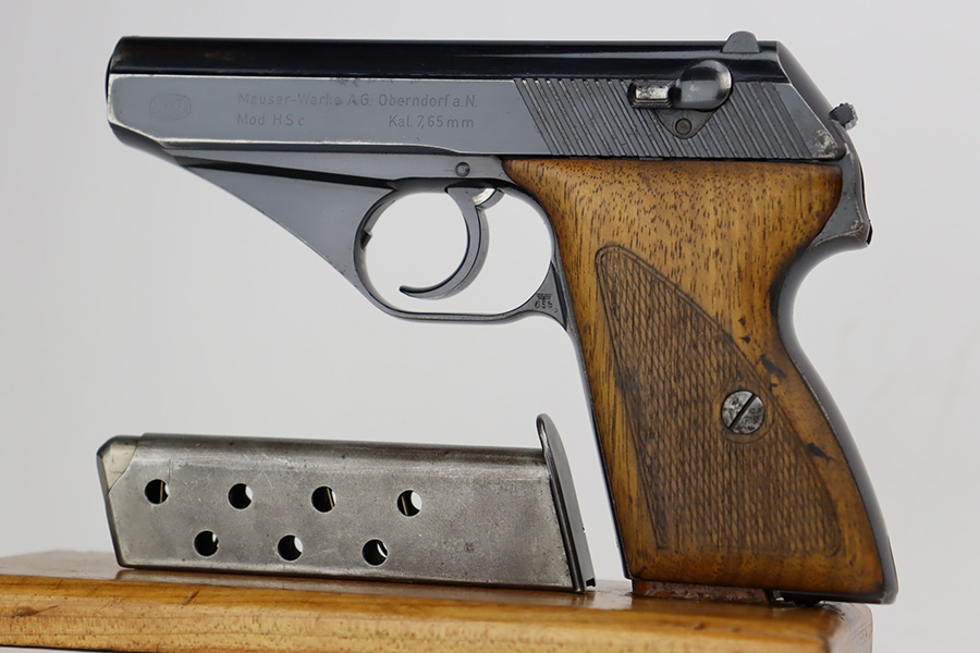 9/19/23 – This is a very nice example of an early Mauser HSC issued to the Nazi military in 1941. It is all matching and has the proper “Eagle 655” military acceptance proof on the trigger guard. It has retained about 93-94% of its original high polish finish. There is general high edge wear and minor wear around the muzzle. Some dulling and pin-pricking on the grip straps. Fitted with nice period-correct wood grips – a few small dark stains on the left side. Comes with one proper magazine. Very nice bore with great rifling and just very minor frosting in the grooves.