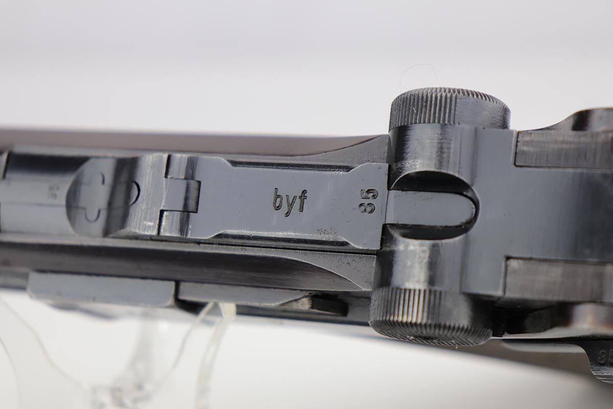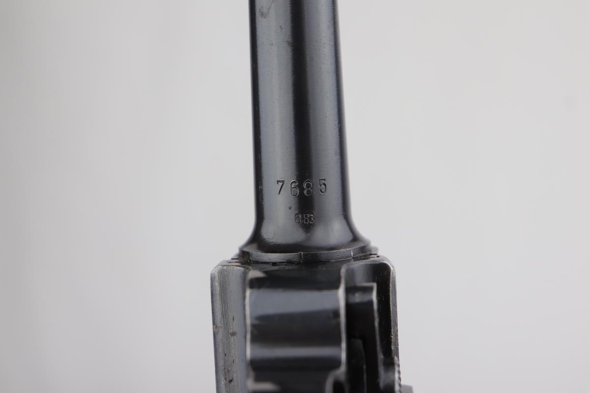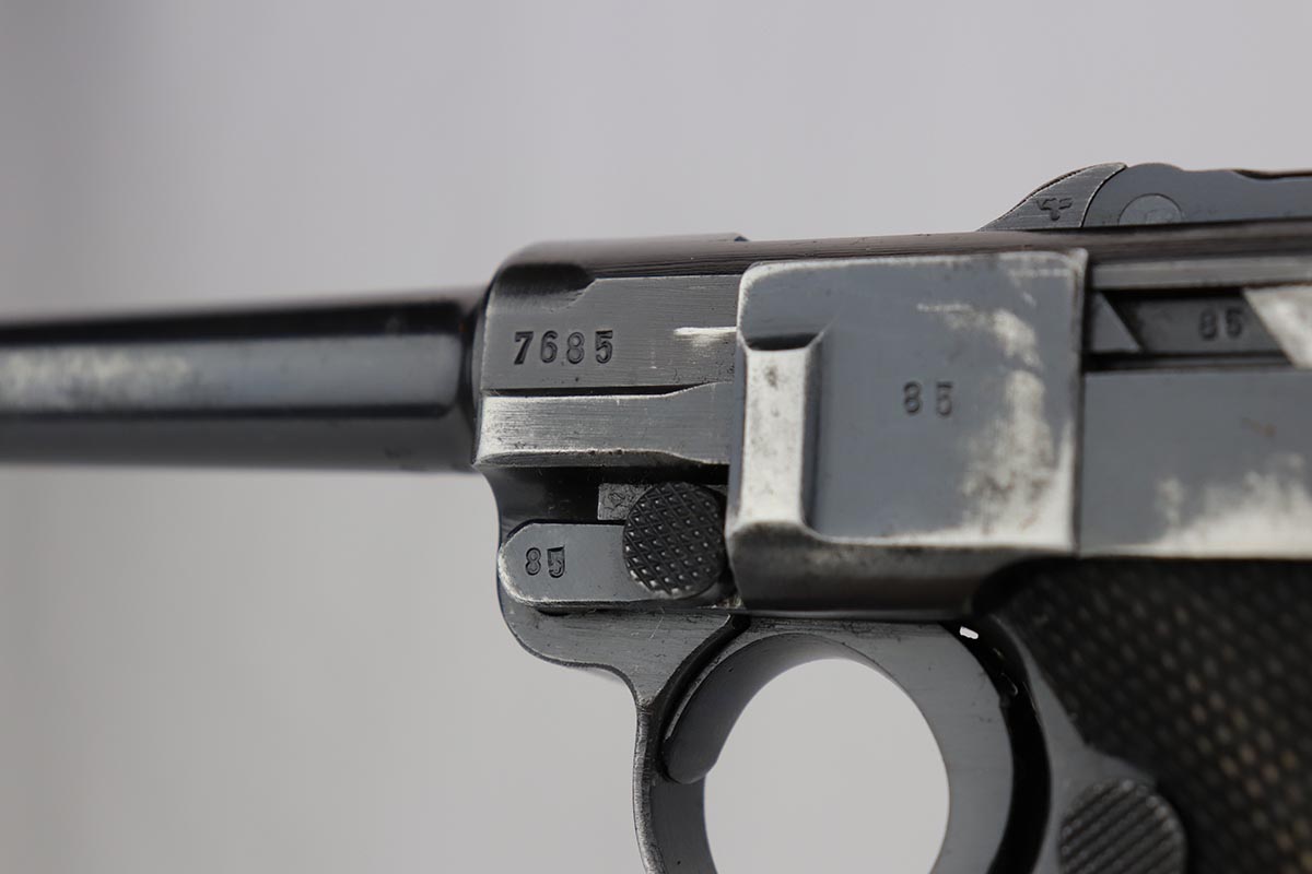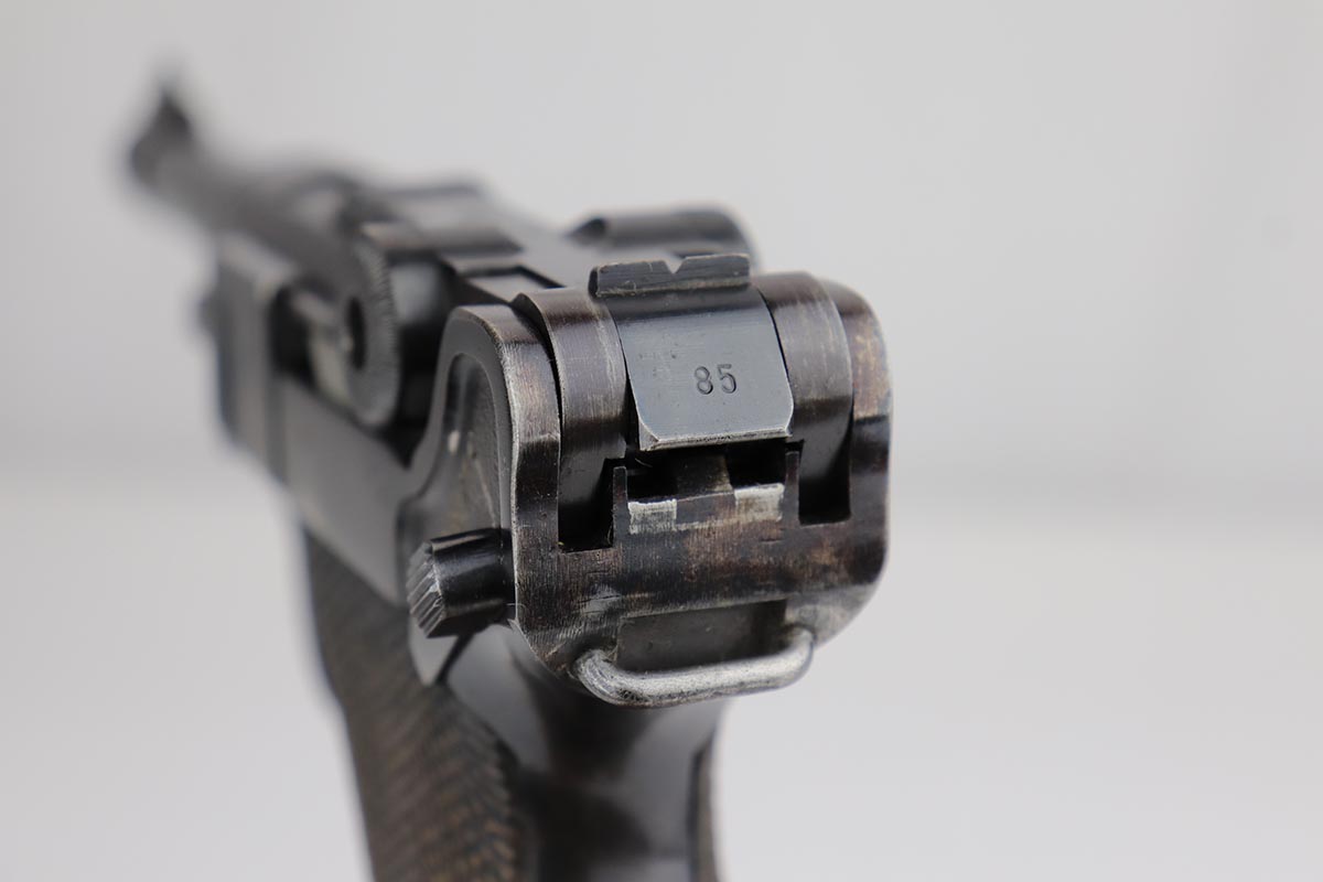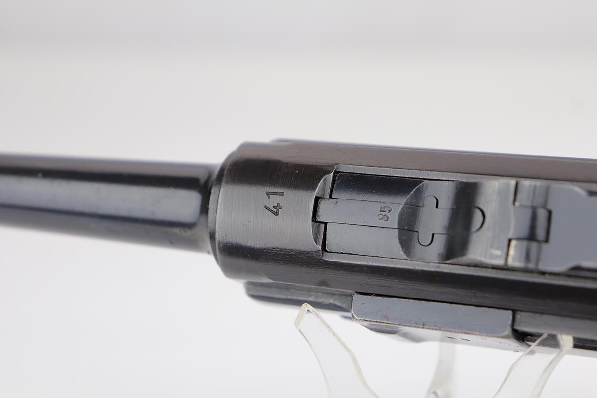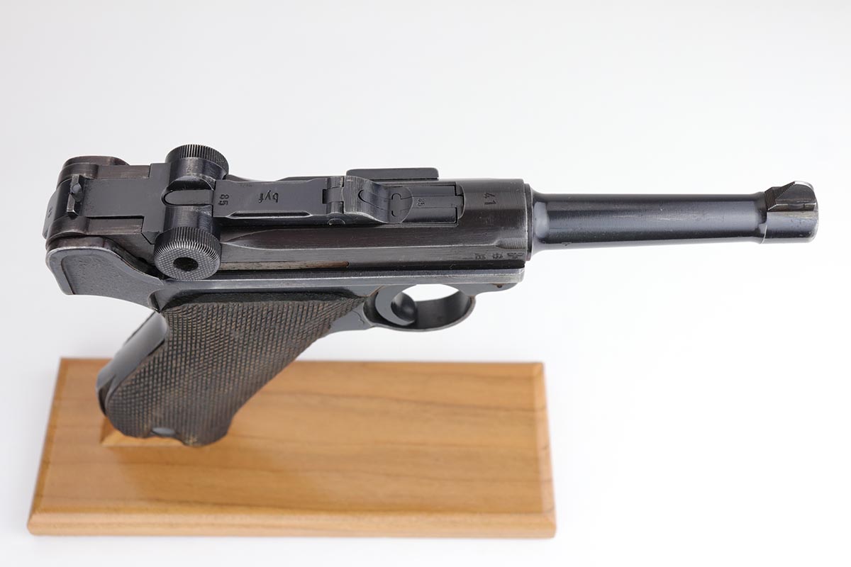 8/26/19 – This is an all matching and original Nazi Mauser Luger from 1941. The original bluing rates at 80-85%., with most finish loss on the left side (barrel, frame, sideplate). There is also some patina on the straps. The grips are original and matching to the pistol, but show some age and smoothing. Black Widow style magazine in terrific condition. Bore is excellent, so this could also be a good shooter candidate.