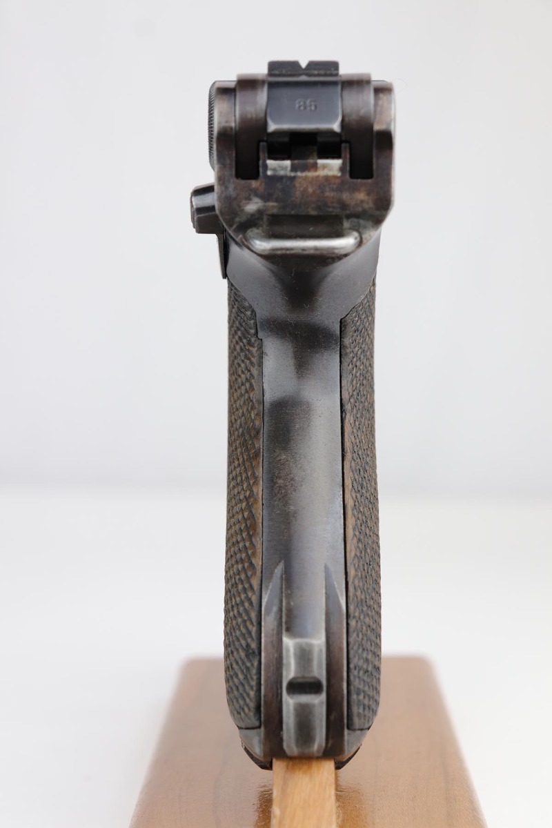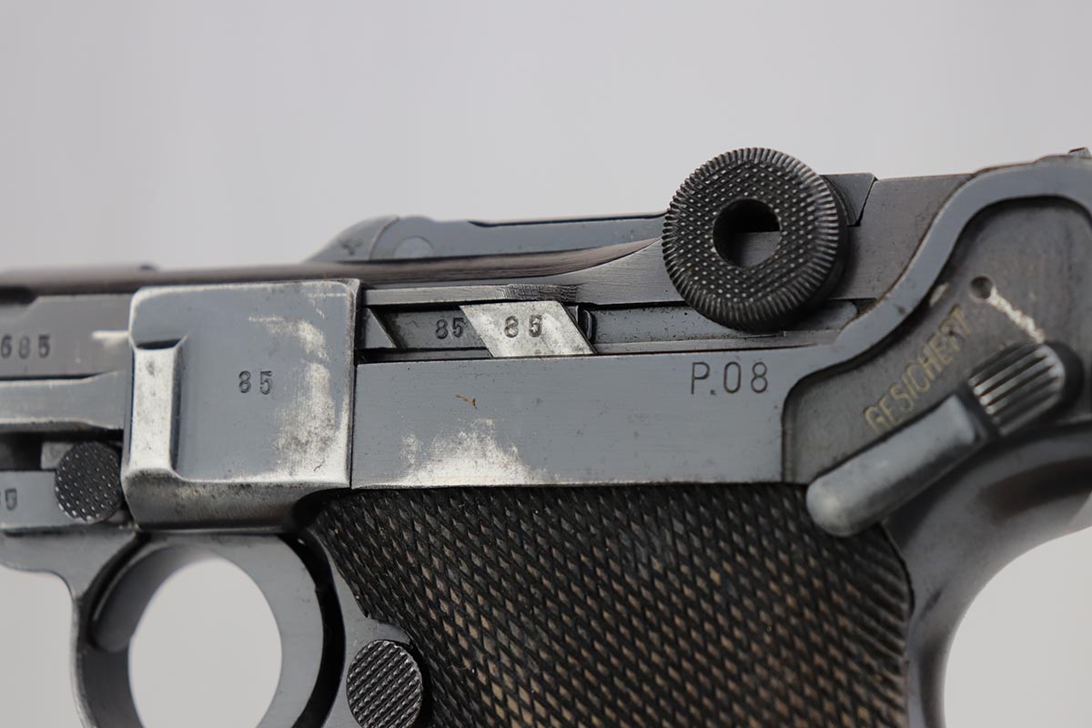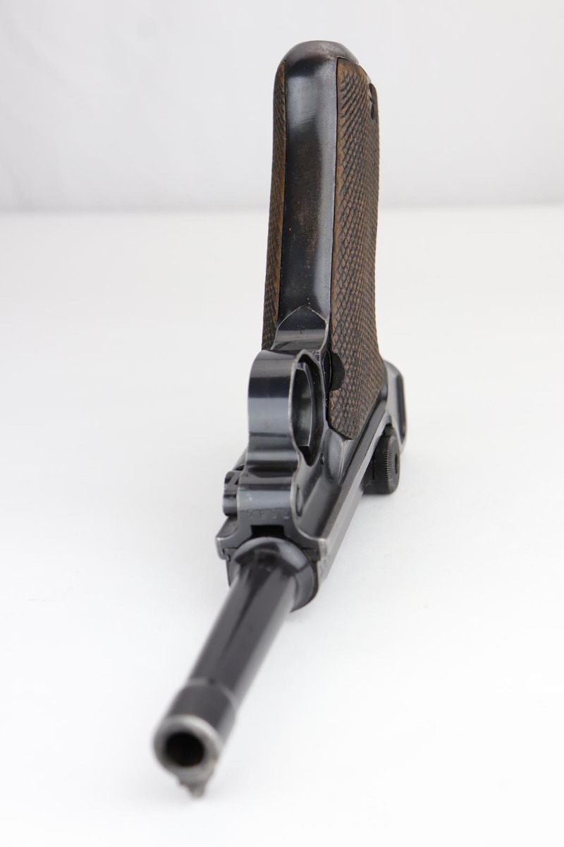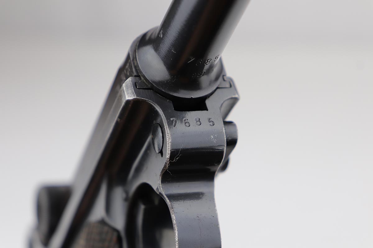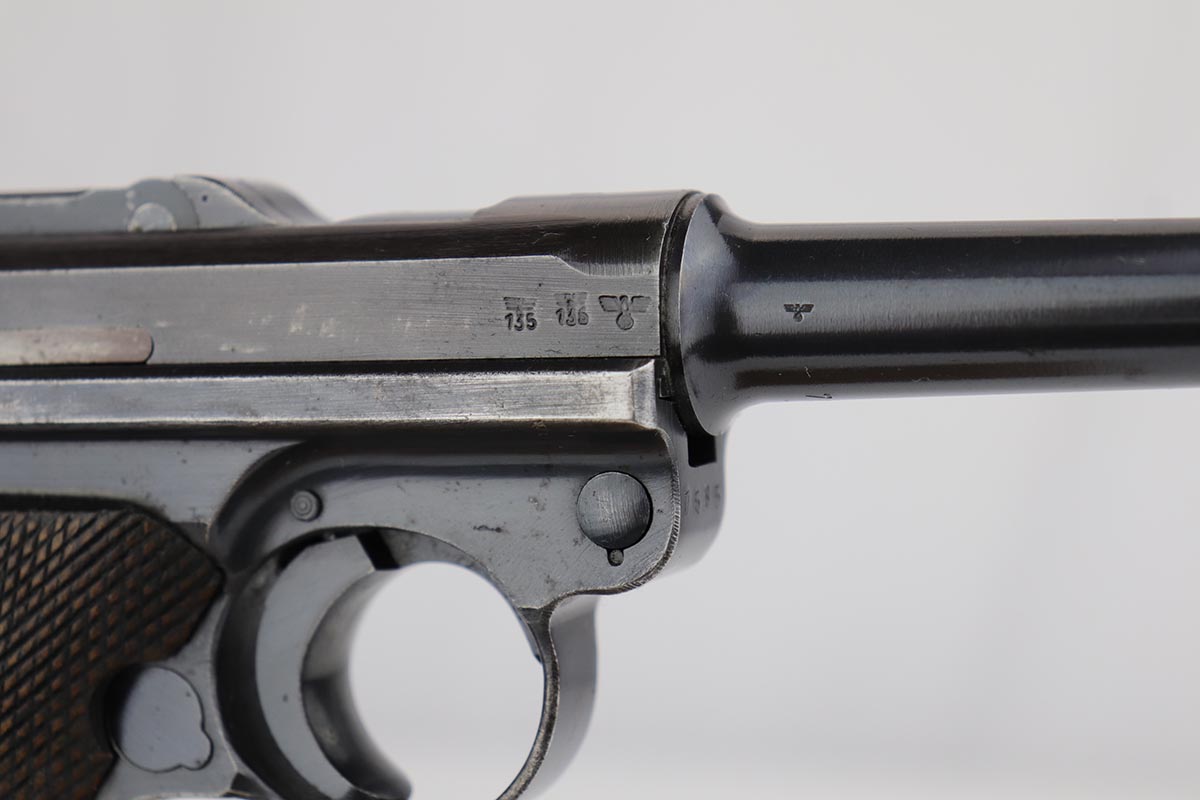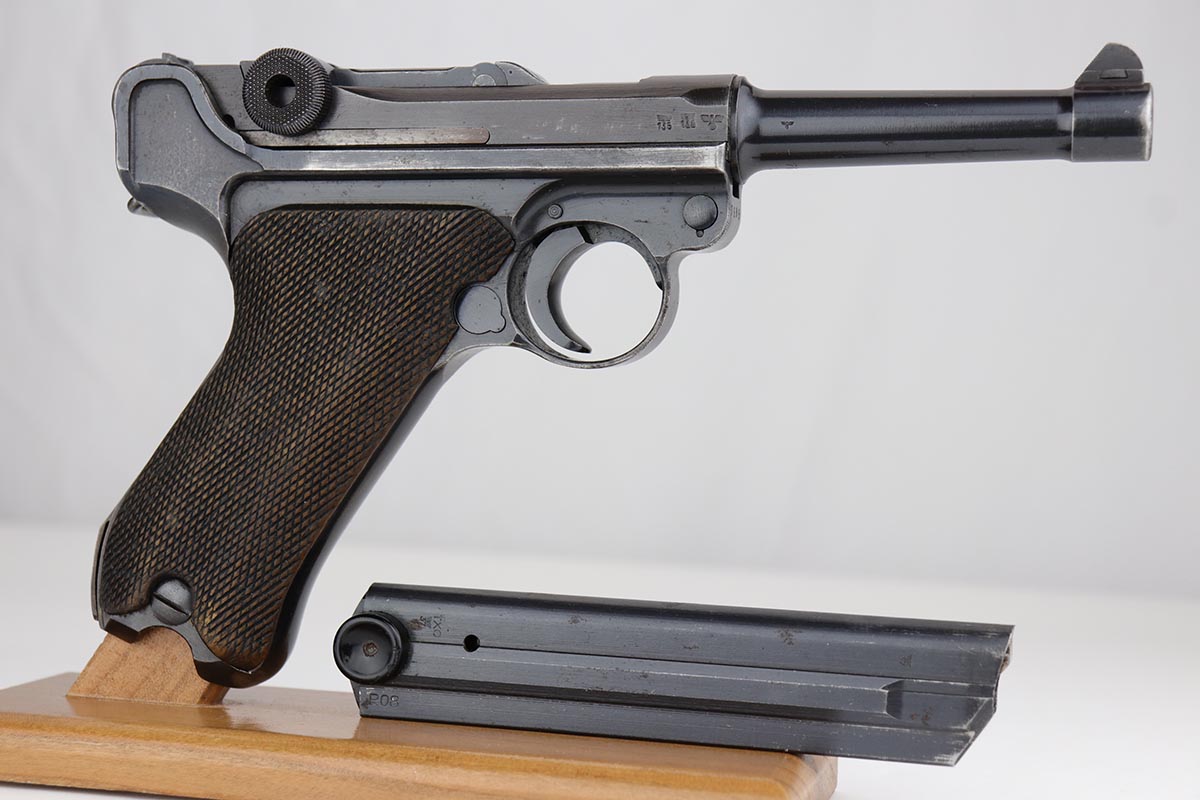 8/26/19 – This is an all matching and original Nazi Mauser Luger from 1941. The original bluing rates at 80-85%., with most finish loss on the left side (barrel, frame, sideplate). There is also some patina on the straps. The grips are original and matching to the pistol, but show some age and smoothing. Black Widow style magazine in terrific condition. Bore is excellent, so this could also be a good shooter candidate.