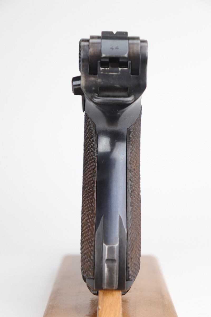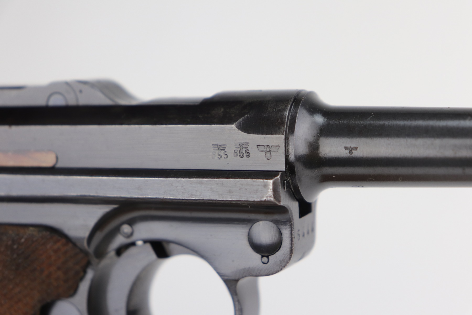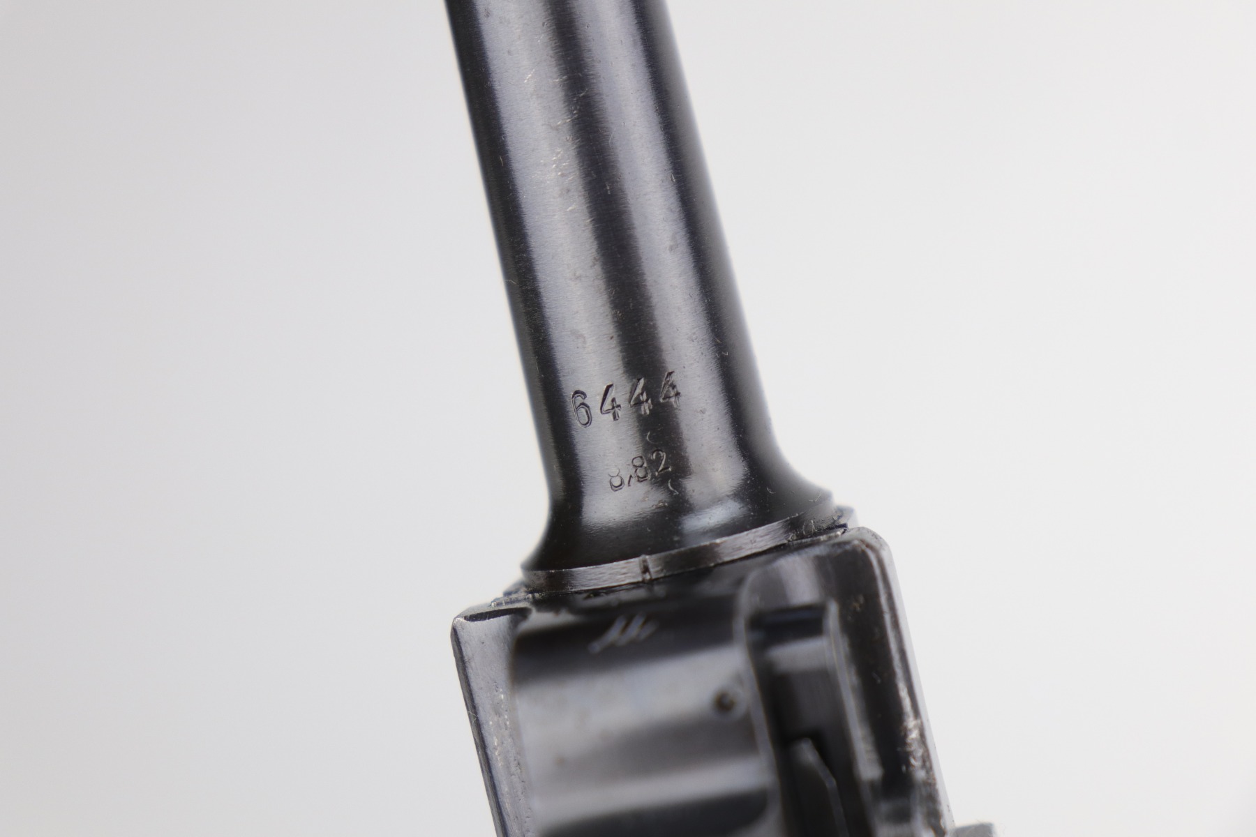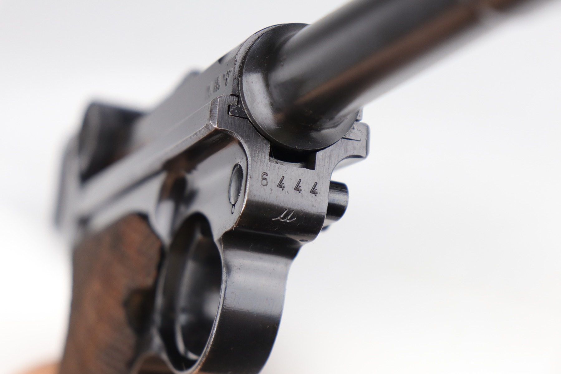 9/3/20 – This is a terrific, 1941 Mauser Luger Rig issued to the Nazi military in 1941. The chamber is dated 1941 and the toggle has the “byf” Mauser factory code. The rig comes with a waffenamt, 1941-dated holster, two original matching magazines, and an “Eagle 655”-marked Luger tool. The gun has the proper “Eagle 655” Nazi military proofs. It has retained about 97-98% of its original finish. There is very minor wear around the muzzle and side plate. There is spotty wear on the chamber and toggle. Minor wear at the back of the frame, near the “ears”. Very minor freckling on the top of the back strap and small black dots of oxidation on the barrel. The gun is all matching. Minty grips that match the gun. On one of the matching magazines, it looks like the last number was originally a “5” and was stamped over with a “4” to match. Everything looks correct, so we believe this was an error corrected in the factory. The holster is in decent condition, but there is light scuffing and cracking in the leather, especially on the front. The bore is shiny with strong rifling with just very minor frosting.