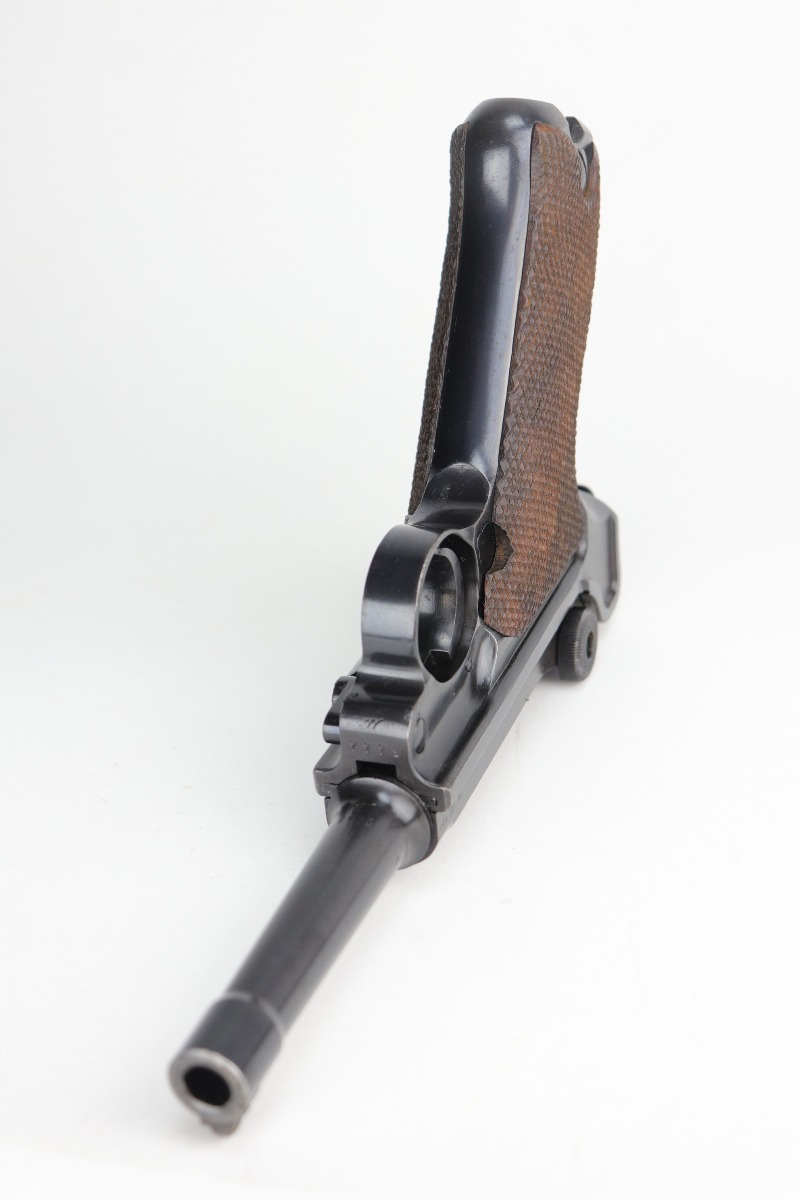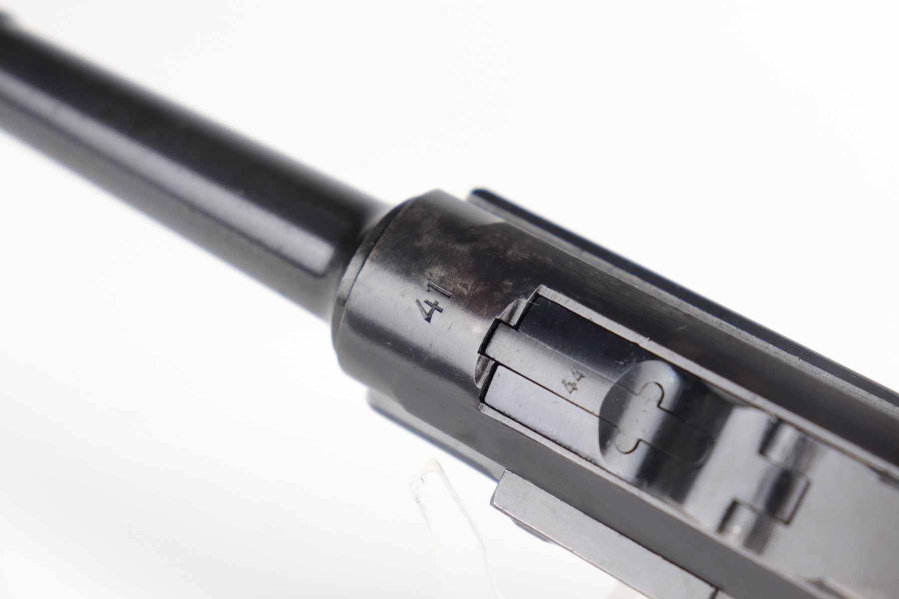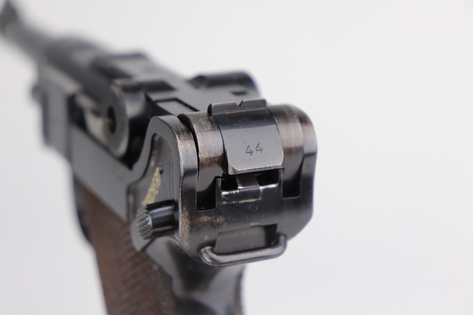 9/3/20 – This is a terrific, 1941 Mauser Luger Rig issued to the Nazi military in 1941. The chamber is dated 1941 and the toggle has the “byf” Mauser factory code. The rig comes with a waffenamt, 1941-dated holster, two original matching magazines, and an “Eagle 655”-marked Luger tool. The gun has the proper “Eagle 655” Nazi military proofs. It has retained about 97-98% of its original finish. There is very minor wear around the muzzle and side plate. There is spotty wear on the chamber and toggle. Minor wear at the back of the frame, near the “ears”. Very minor freckling on the top of the back strap and small black dots of oxidation on the barrel. The gun is all matching. Minty grips that match the gun. On one of the matching magazines, it looks like the last number was originally a “5” and was stamped over with a “4” to match. Everything looks correct, so we believe this was an error corrected in the factory. The holster is in decent condition, but there is light scuffing and cracking in the leather, especially on the front. The bore is shiny with strong rifling with just very minor frosting.