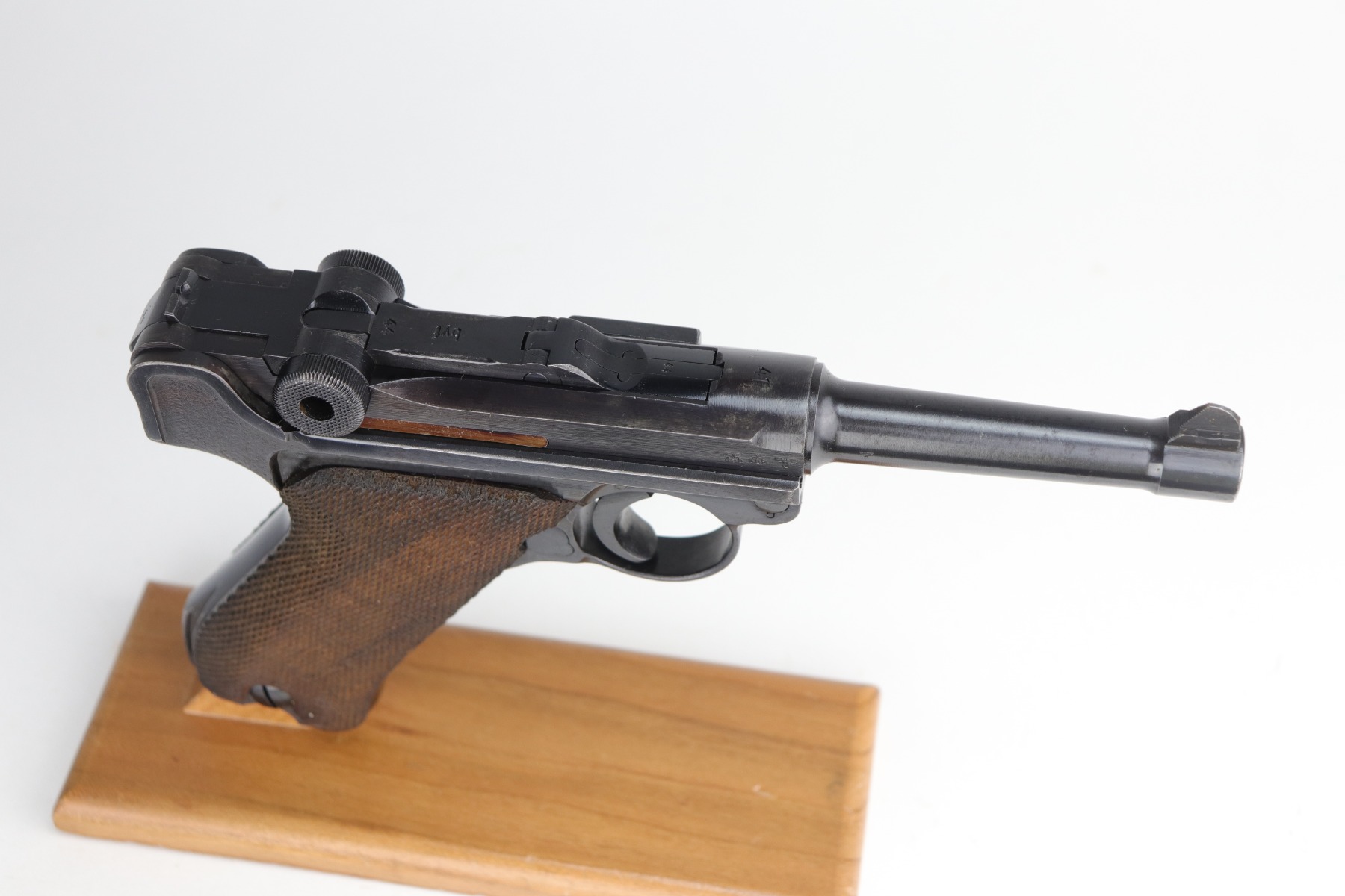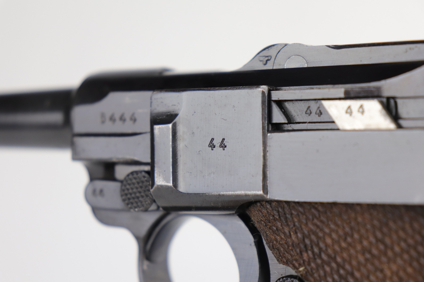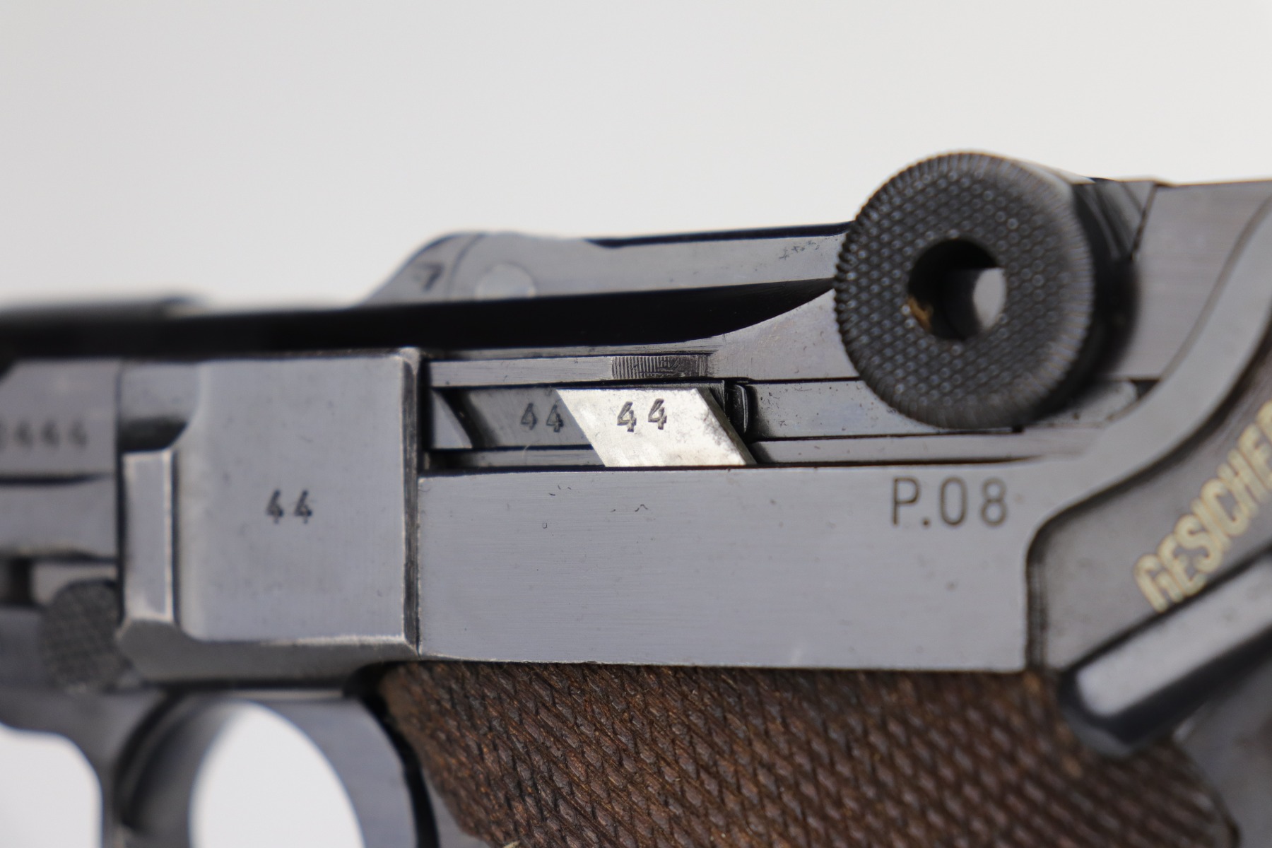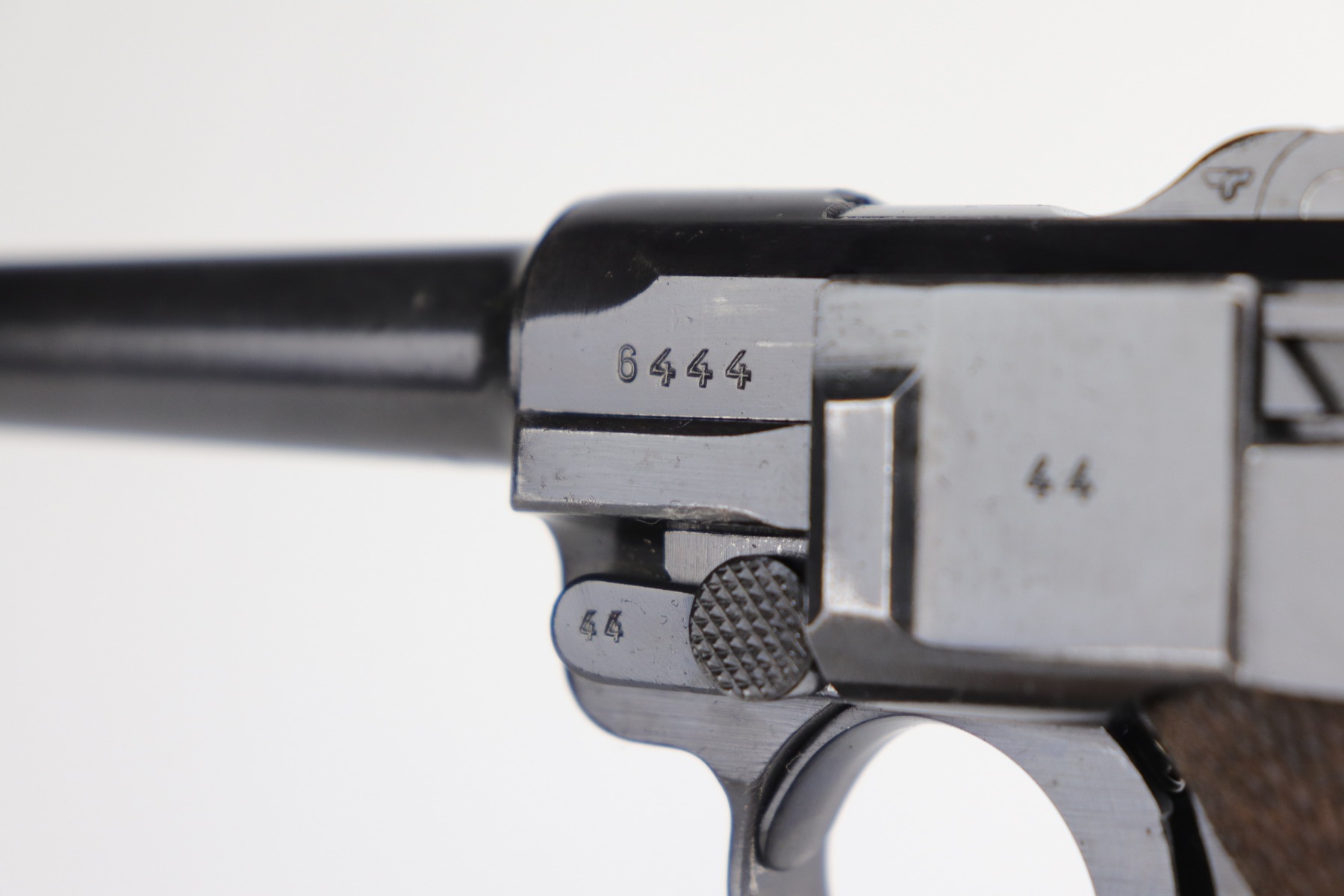9/3/20 – This is a terrific, 1941 Mauser Luger Rig issued to the Nazi military in 1941. The chamber is dated 1941 and the toggle has the “byf” Mauser factory code. The rig comes with a waffenamt, 1941-dated holster, two original matching magazines, and an “Eagle 655”-marked Luger tool. The gun has the proper “Eagle 655” Nazi military proofs. It has retained about 97-98% of its original finish. There is very minor wear around the muzzle and side plate. There is spotty wear on the chamber and toggle. Minor wear at the back of the frame, near the “ears”. Very minor freckling on the top of the back strap and small black dots of oxidation on the barrel. The gun is all matching. Minty grips that match the gun. On one of the matching magazines, it looks like the last number was originally a “5” and was stamped over with a “4” to match. Everything looks correct, so we believe this was an error corrected in the factory. The holster is in decent condition, but there is light scuffing and cracking in the leather, especially on the front. The bore is shiny with strong rifling with just very minor frosting.