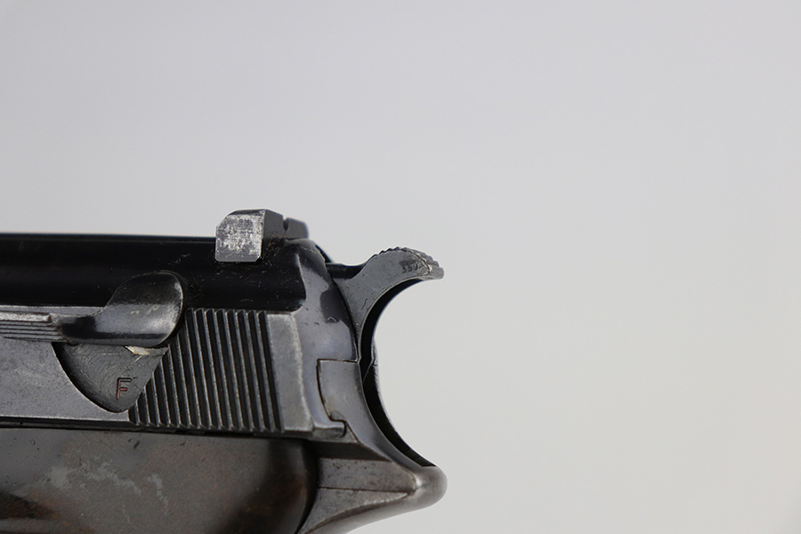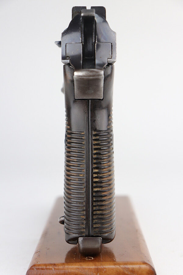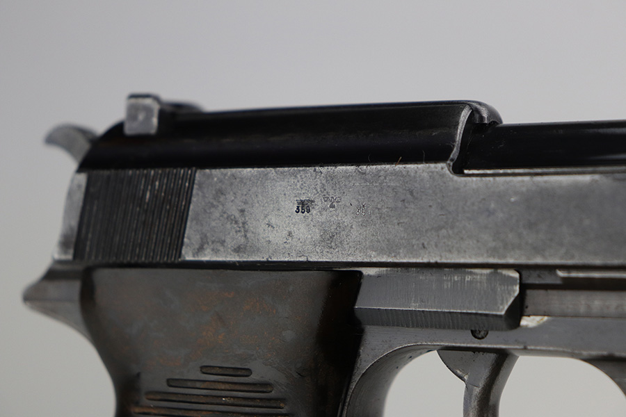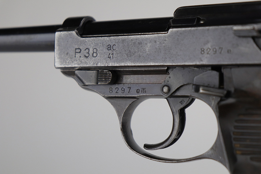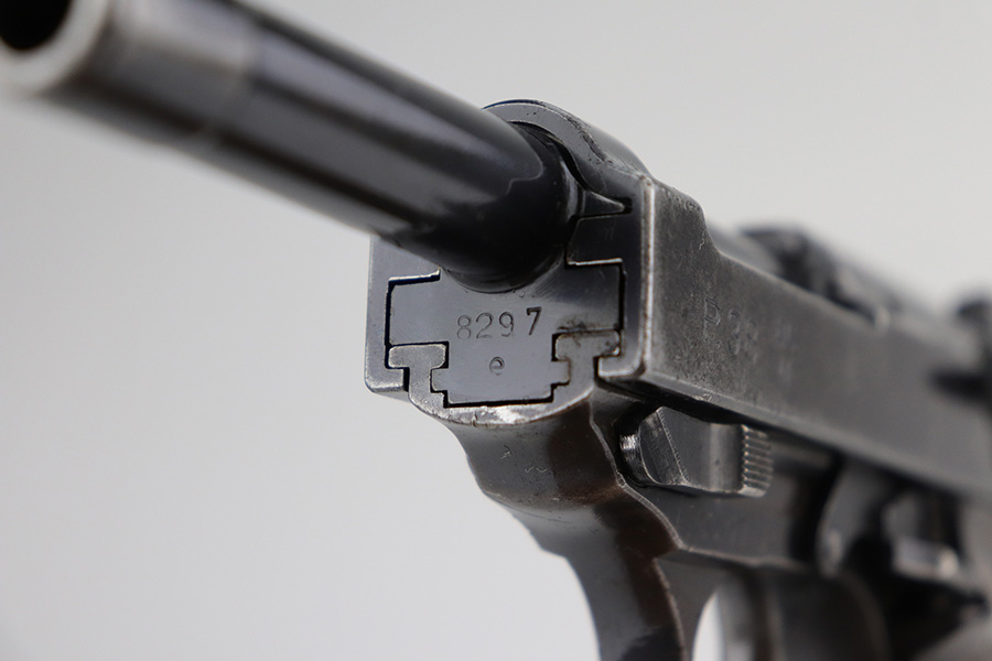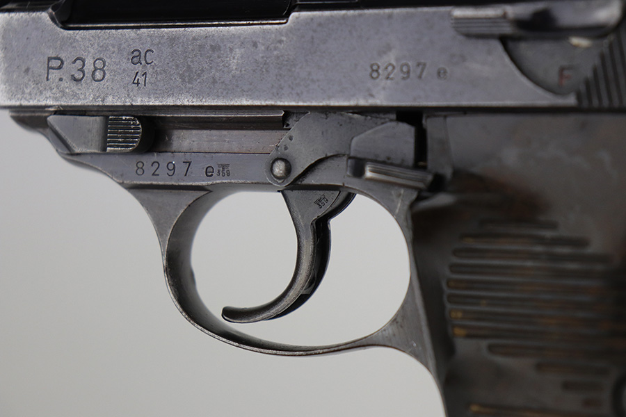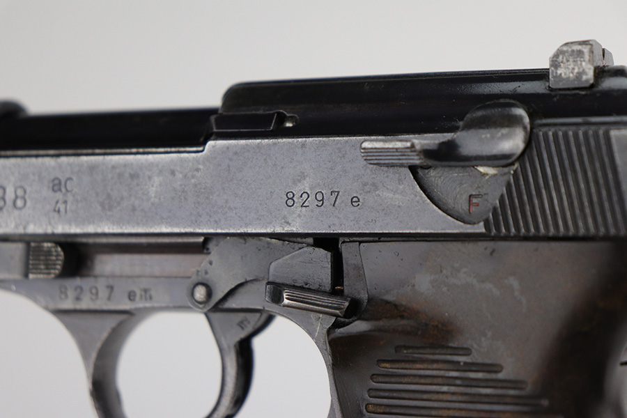 9/1/21 – This is a Walther P.38 that was issued to the Nazi military in 1941. It is all matching and has the proper “Eagle 359” Nazi military proofs throughout, even on the small parts. It comes with excellent grips and an un-numbered Walther magazine. The gun has retained roughly 55% of its original finish. There is spotty wear and thinning throughout. It is most noticeable on both sides of the slide and on the front strap. Spotty oxidation throughout. The rifling is a bit worn with freckling throughout. De-cocker is functional.