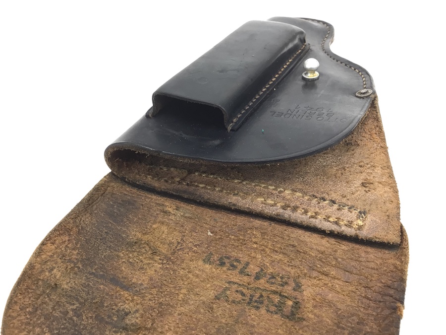 9/29/21 – Original and excellent condition holster for 7.65mm caliber pistol. Most likely a PPK, 38h or CZ-27. Maker and date stamped under the closure flap along with the Police Eagle B stamp. Clean interior. Personalized under the flap with “Tracy” along with a serial number.
