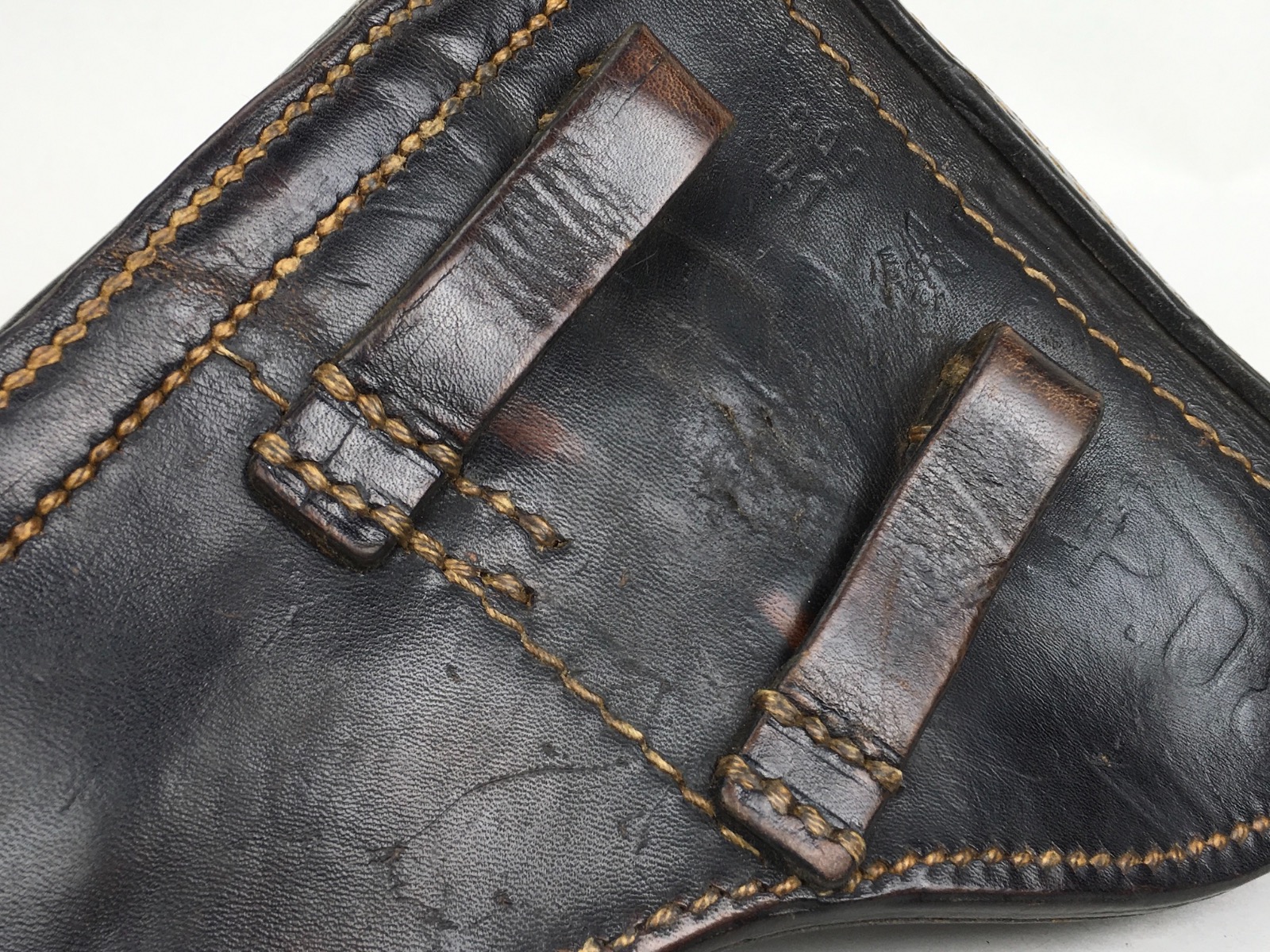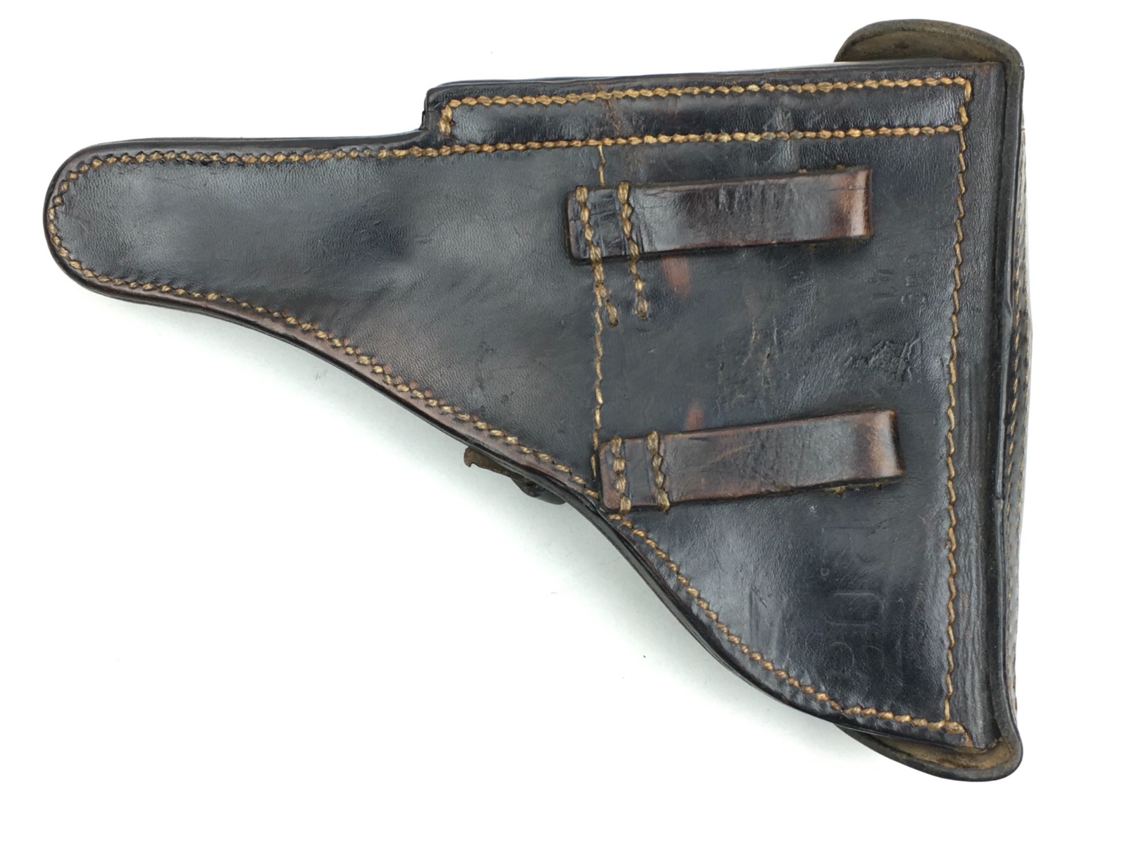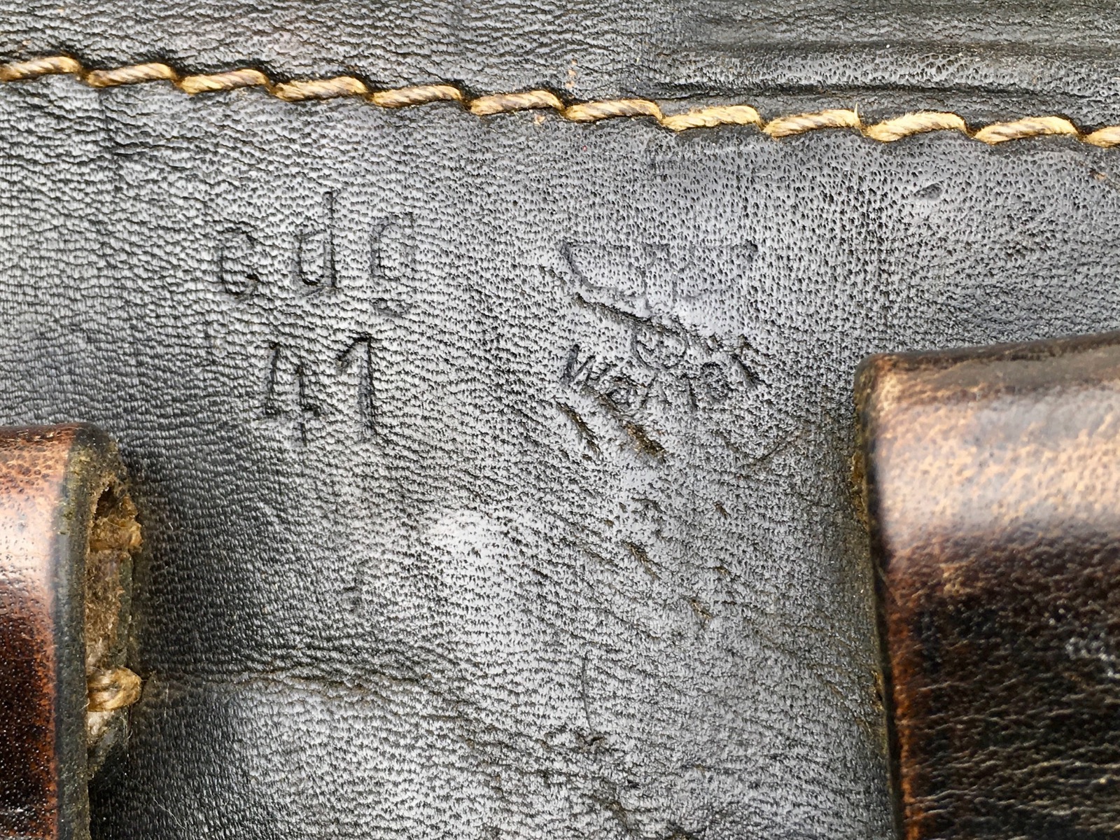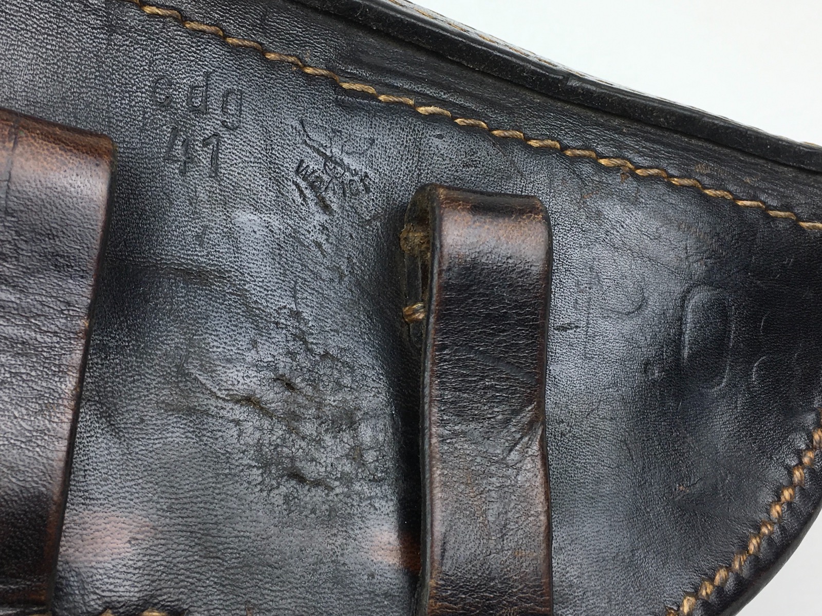 3/27/19 – This is an original 1941 dated Luger holster. The back of the holster is “cdg” maker stamped with a 1941 date and waffen eagle WaA101 proof. The holster has nice, deep brown leather and straw colored stitching. The stitching is all original and completely intact. The leather has minimal exterior scuffing. The interior leather is clean with a small personal ink mark. Secure lift strap.