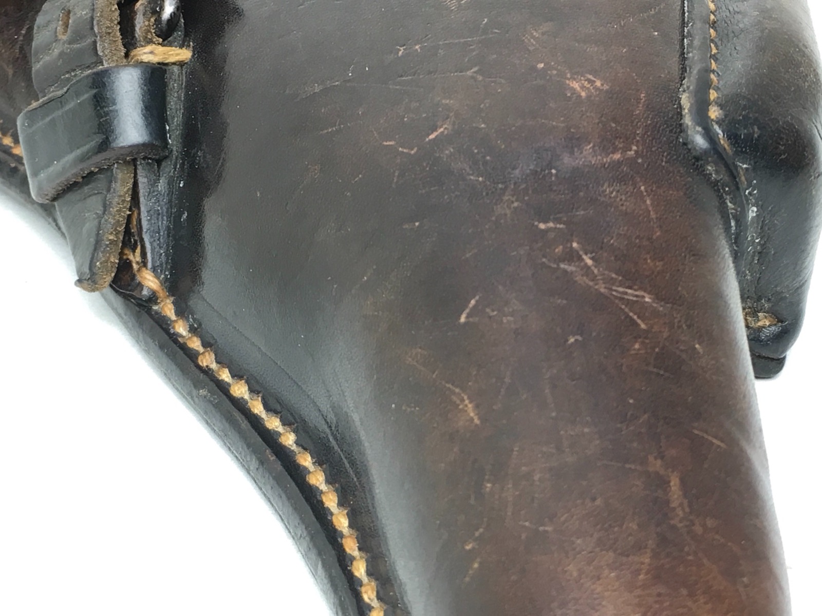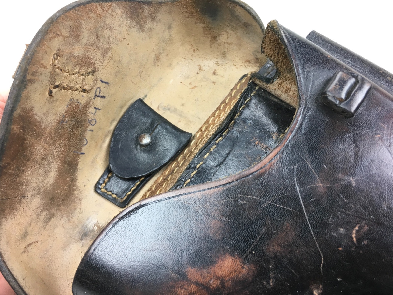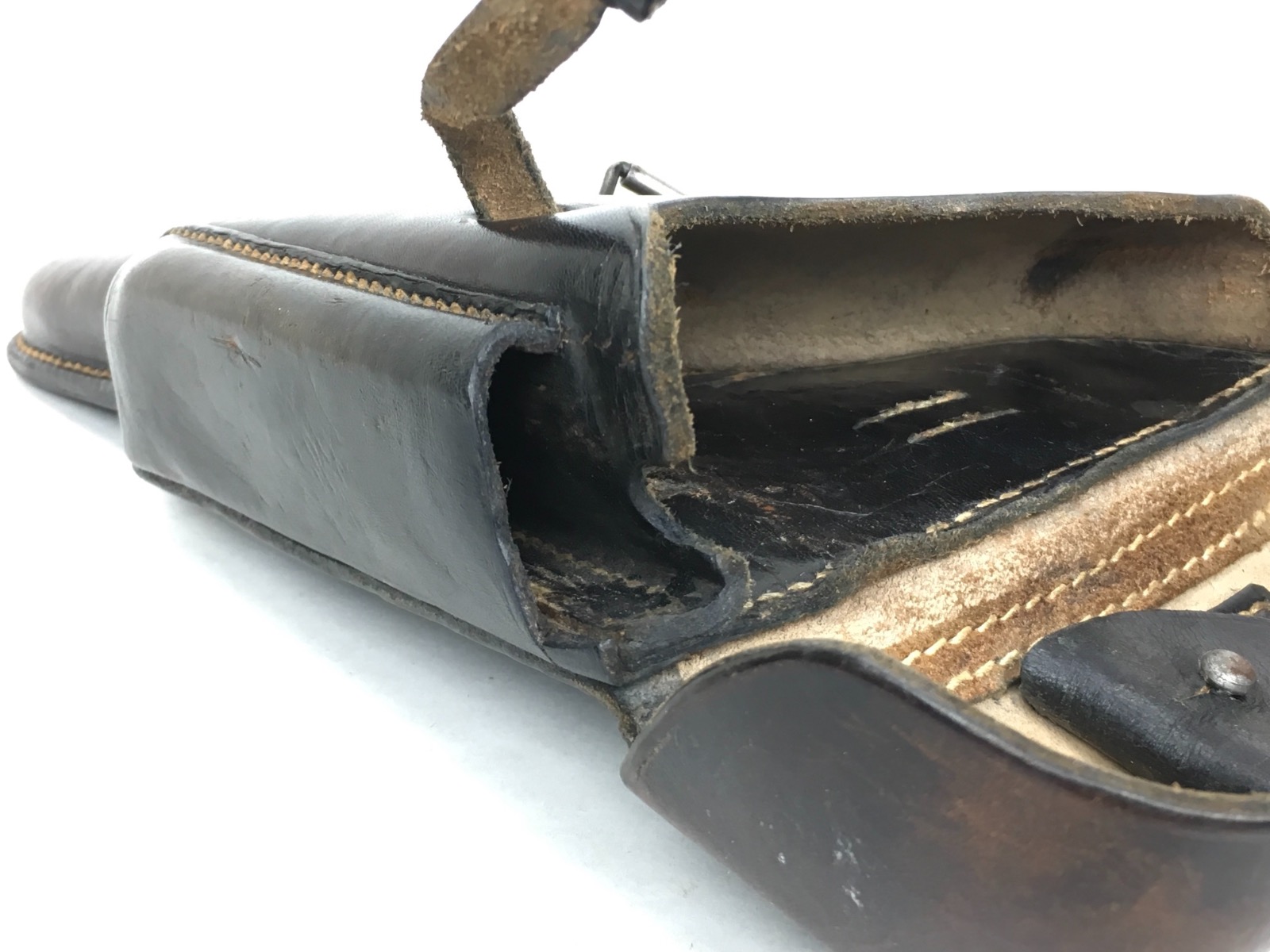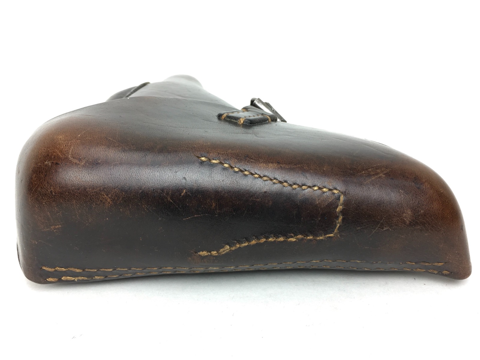3/27/19 – This is an original 1941 dated Luger holster. The back of the holster is “cdg” maker stamped with a 1941 date and waffen eagle WaA101 proof. The holster has nice, deep brown leather and straw colored stitching. The stitching is all original and completely intact. The leather has minimal exterior scuffing. The interior leather is clean with a small personal ink mark. Secure lift strap.