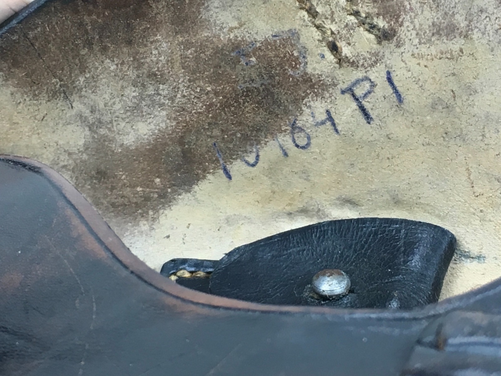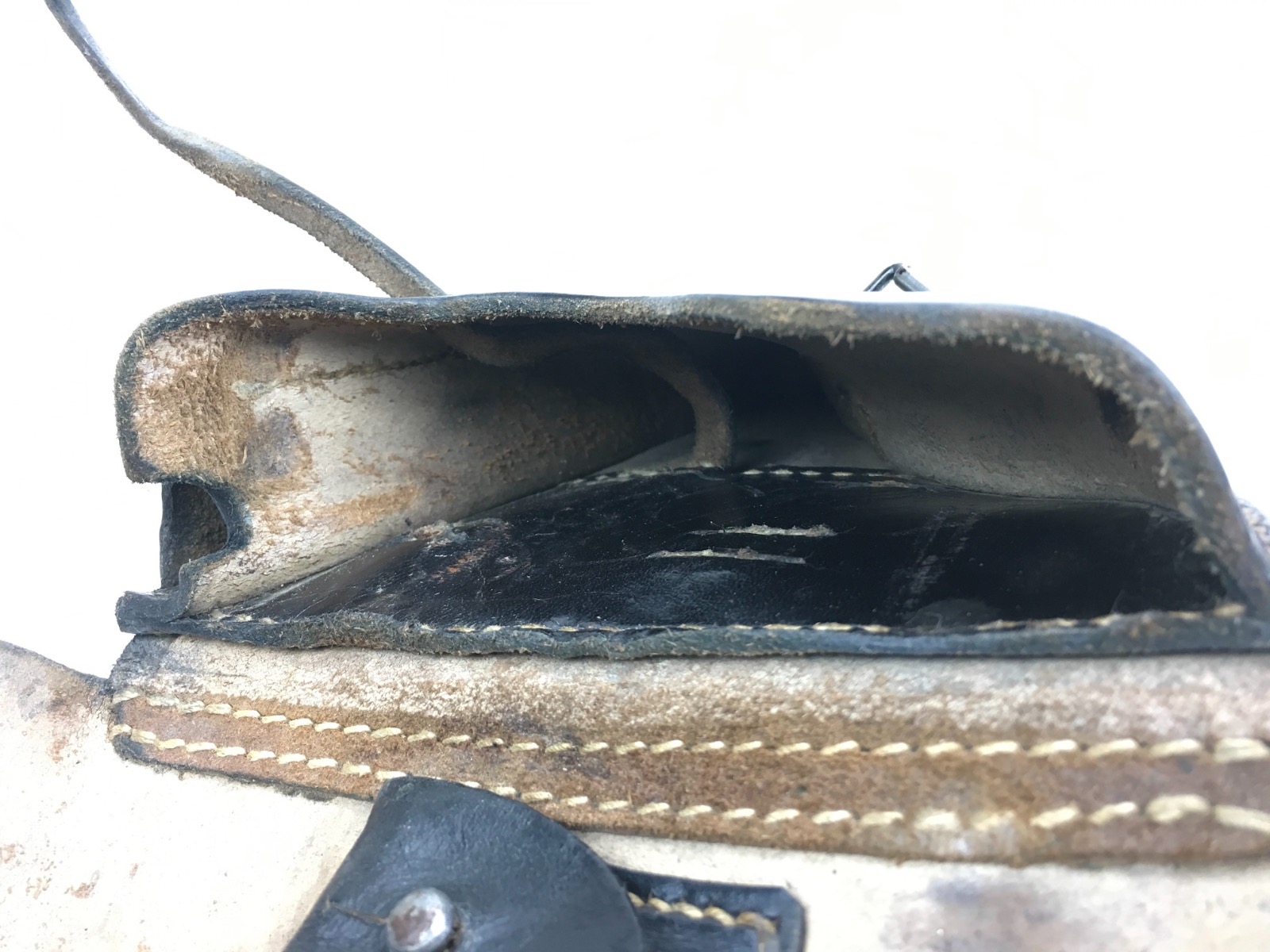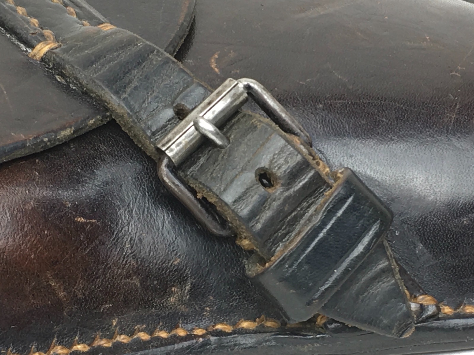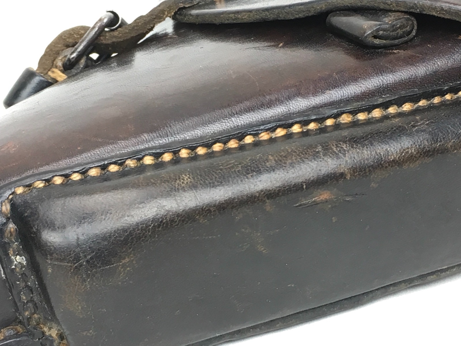 3/27/19 – This is an original 1941 dated Luger holster. The back of the holster is “cdg” maker stamped with a 1941 date and waffen eagle WaA101 proof. The holster has nice, deep brown leather and straw colored stitching. The stitching is all original and completely intact. The leather has minimal exterior scuffing. The interior leather is clean with a small personal ink mark. Secure lift strap.